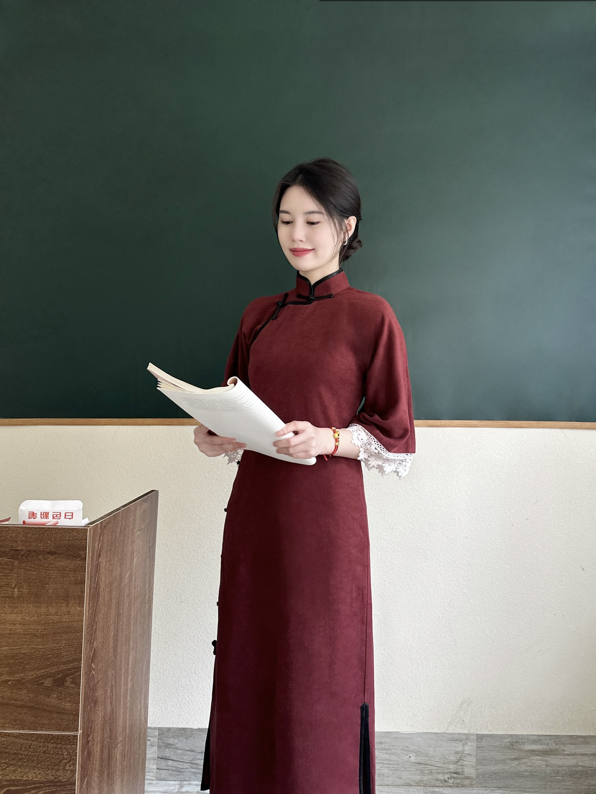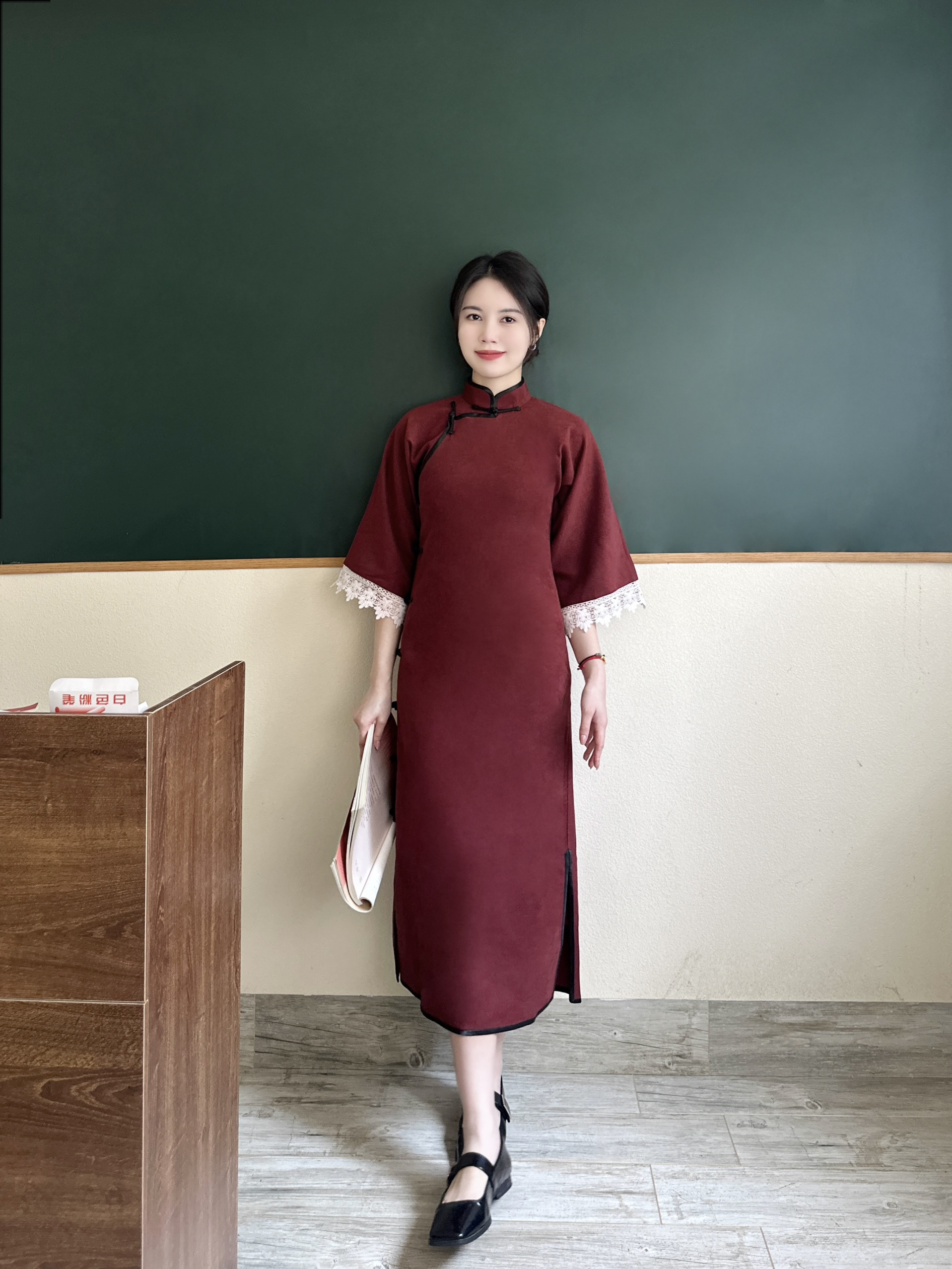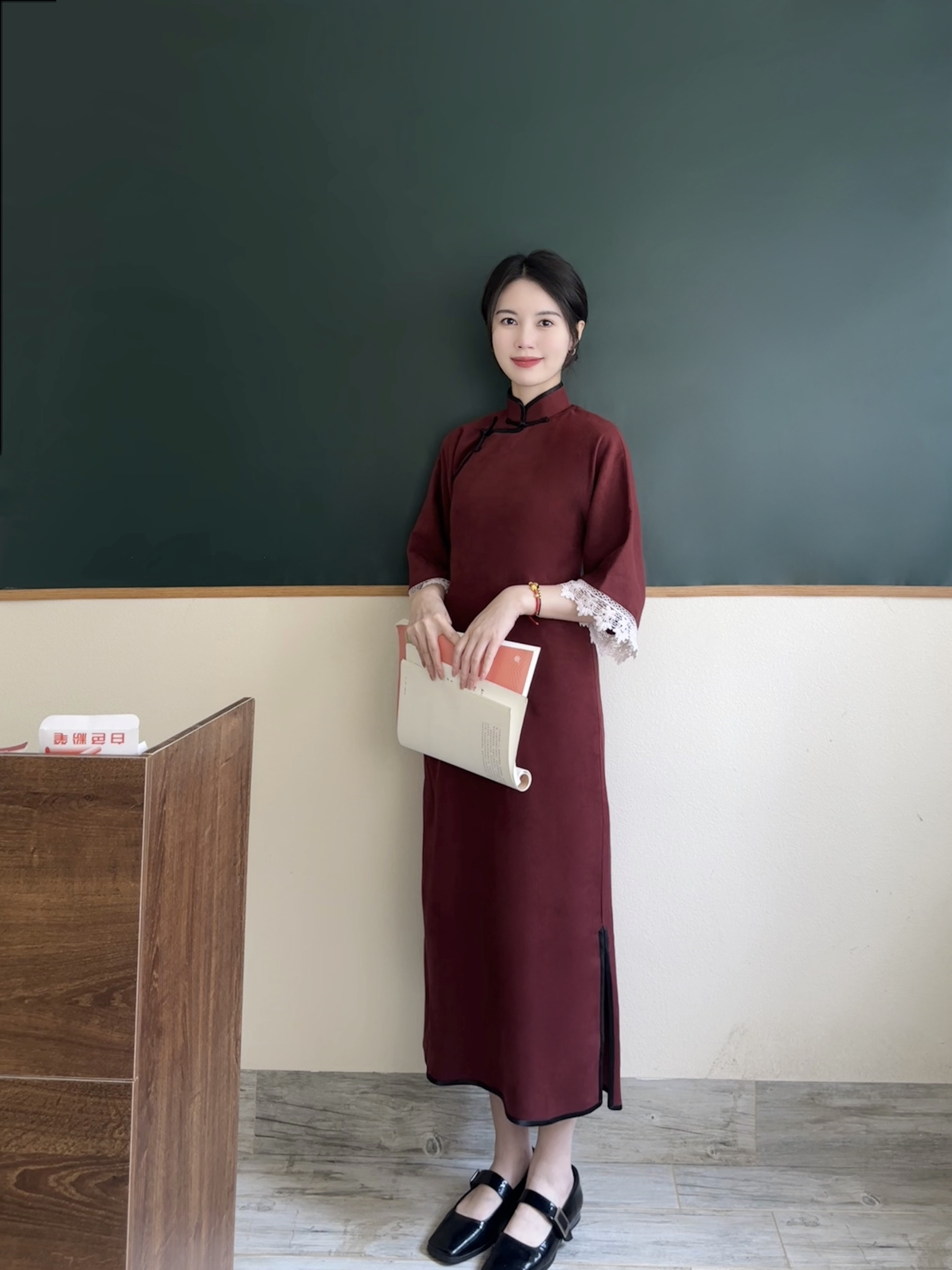 暗红色的旗袍,敲复古的!!穿上就有民国女教师即视感~显瘦又遮肉!