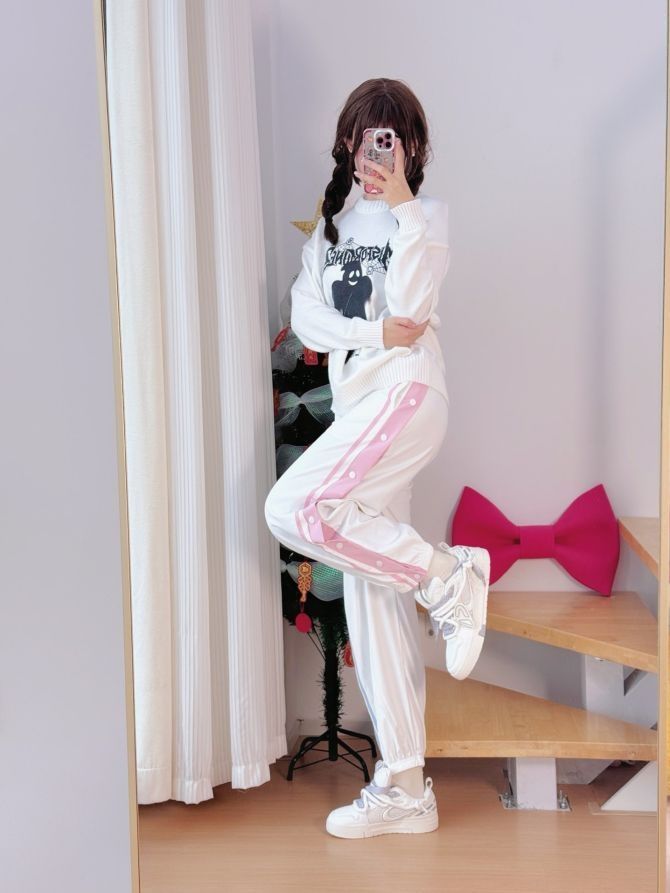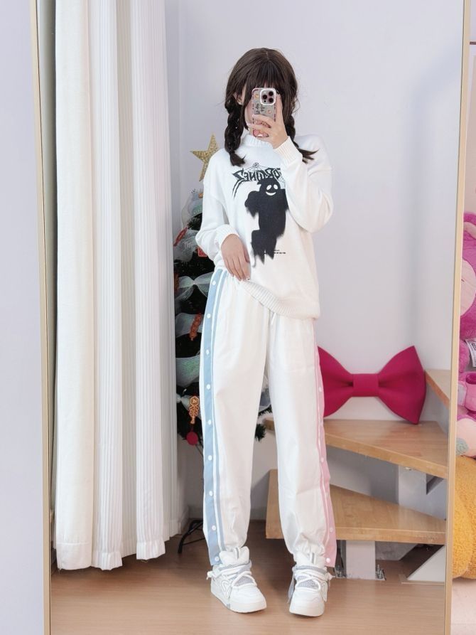 自古粉蓝出cp,这条撞色运动裤我真的爱啦 完全就是甜妹style,可以像我一样搭配卫衣也可以搭配紧身短上衣,又甜又辣 版型很OK,裤子是收脚的,遮胯显瘦,对梨形妹子很友好 到手价不到100💰,性价比绝绝子,学生党的不二之选