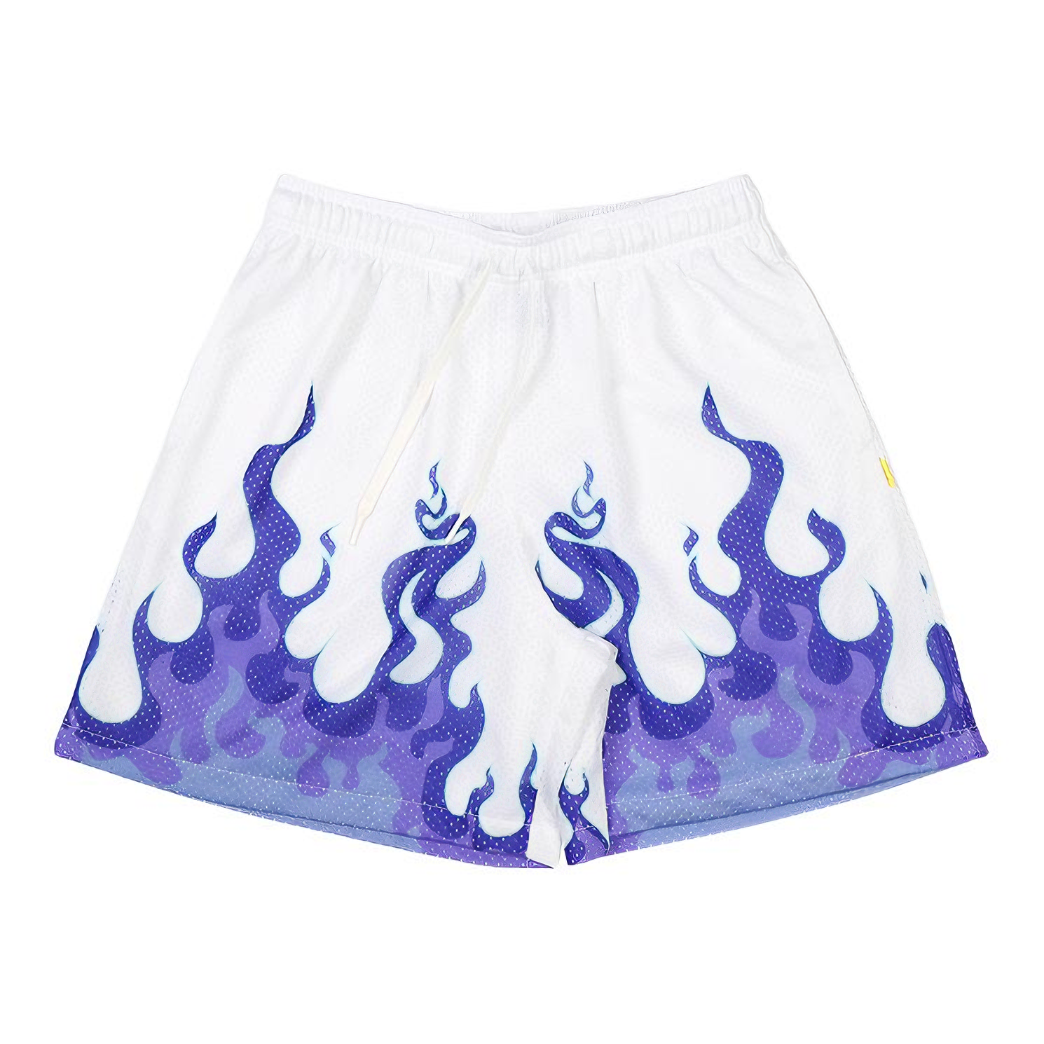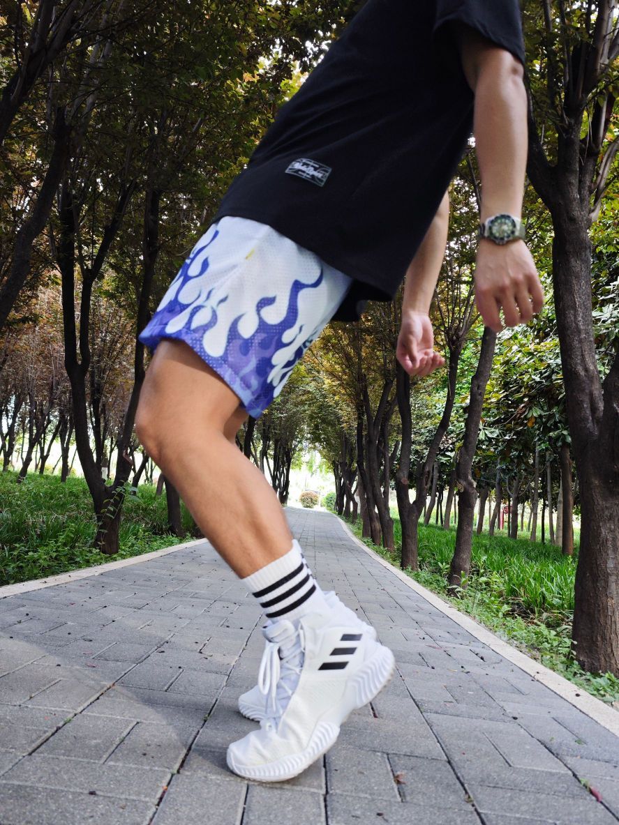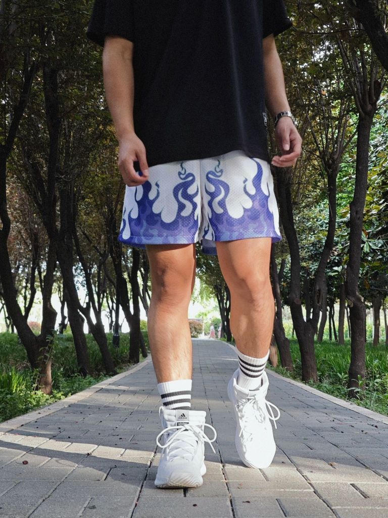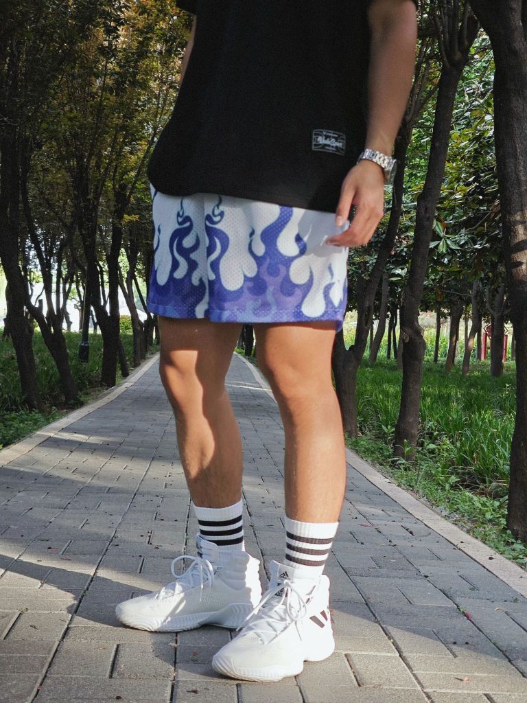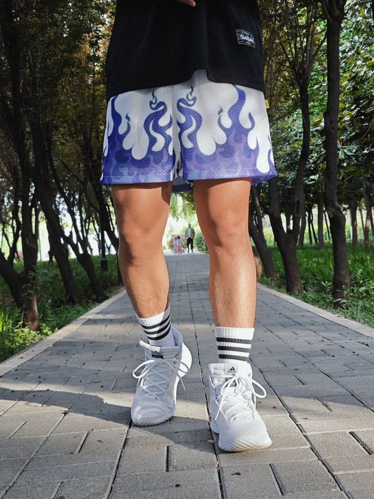 🎆 白紫火焰,光看短裤造型就知道帅爆了~70的价格也比较合适,拿到手立马上身穿着去拍了两张! · 🕋个人觉得最好可以选个黑色短袖或者长袖搭配,简直无gai~ · 🏕️这个夏天,一定要有件帅爆短裤!