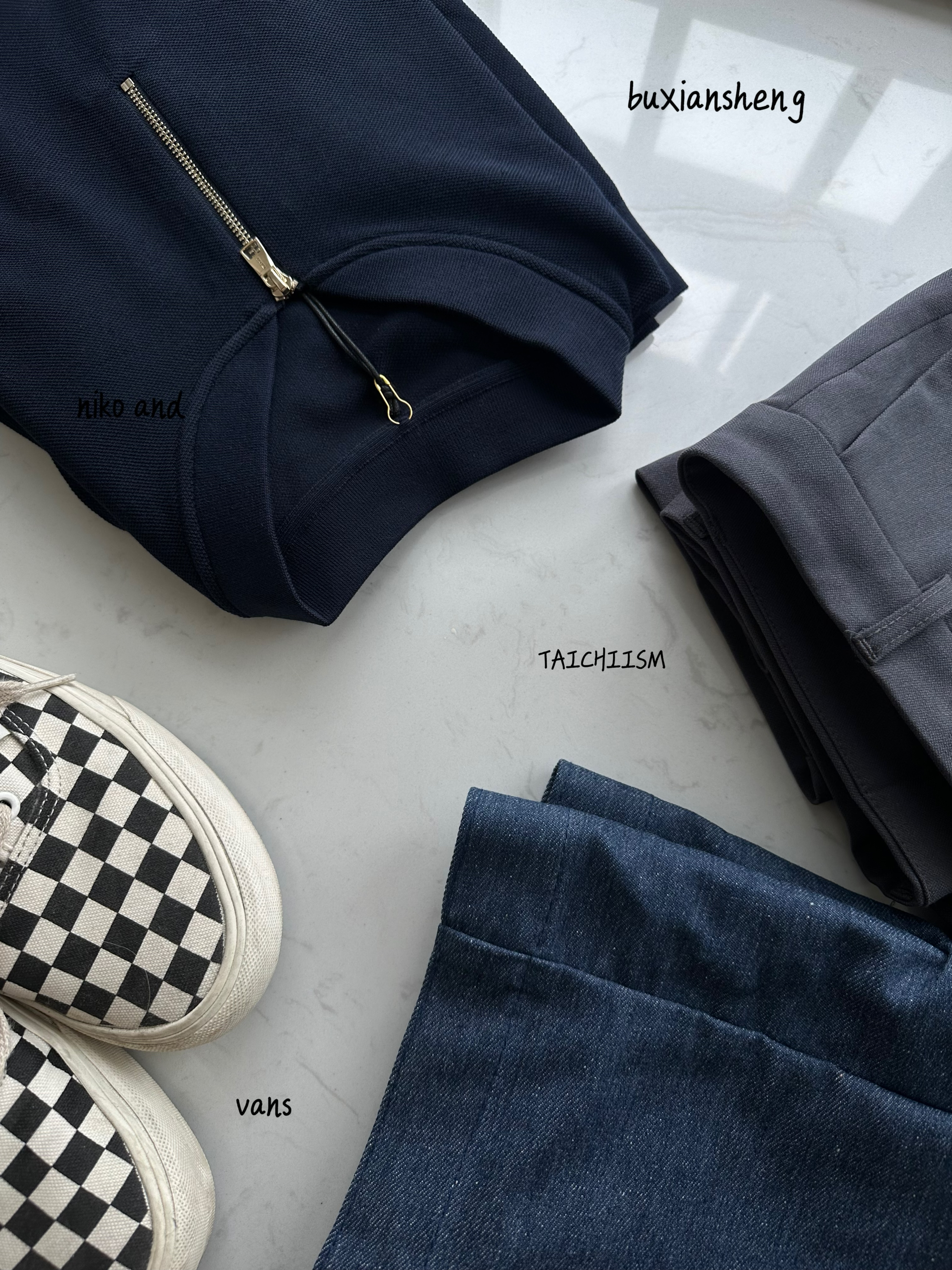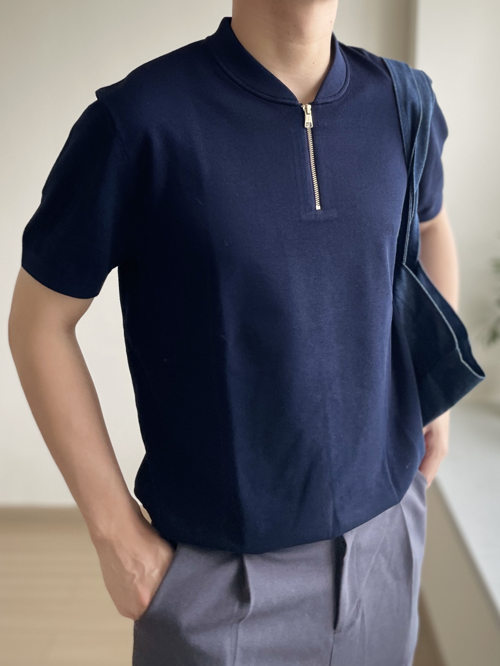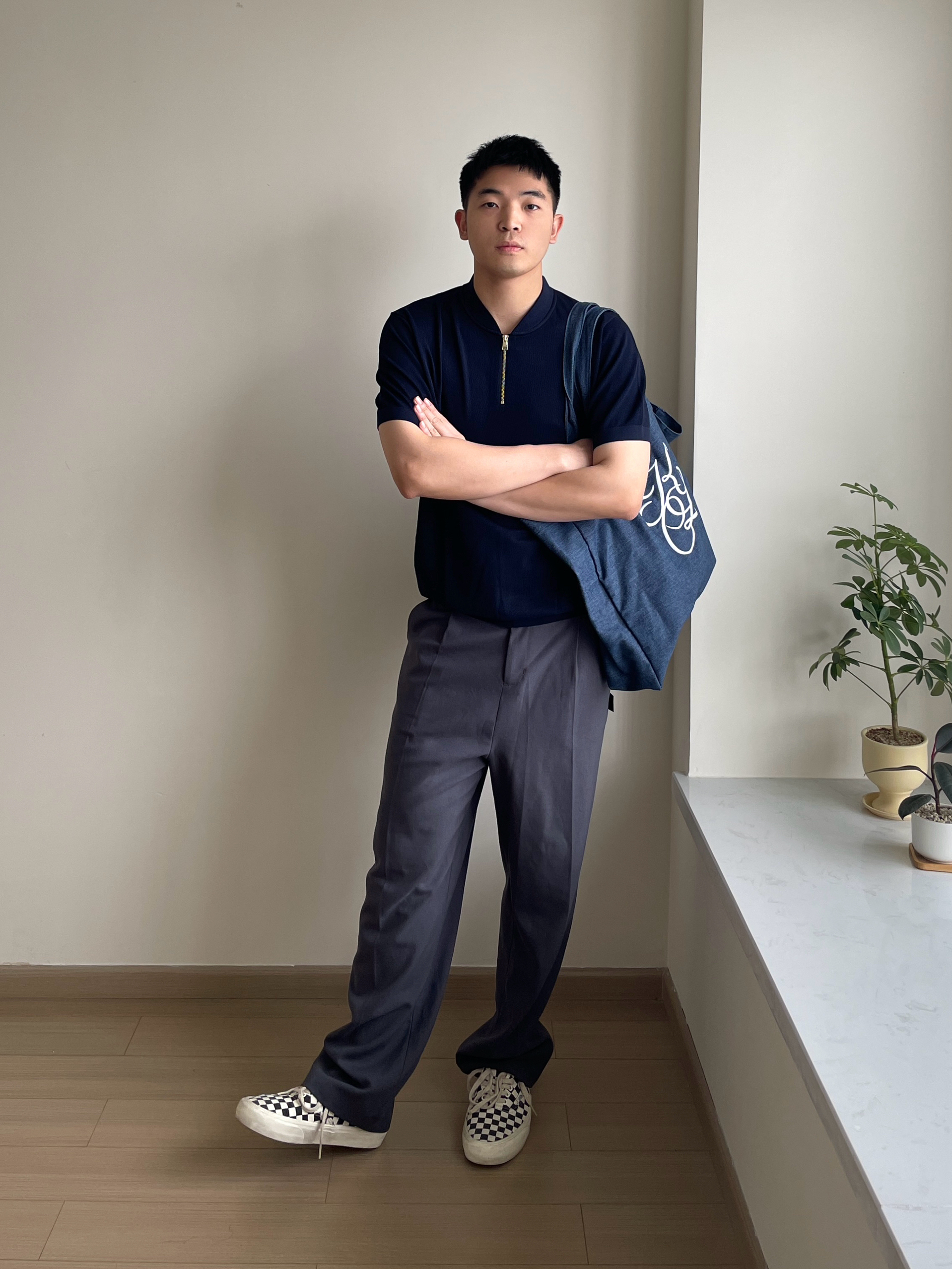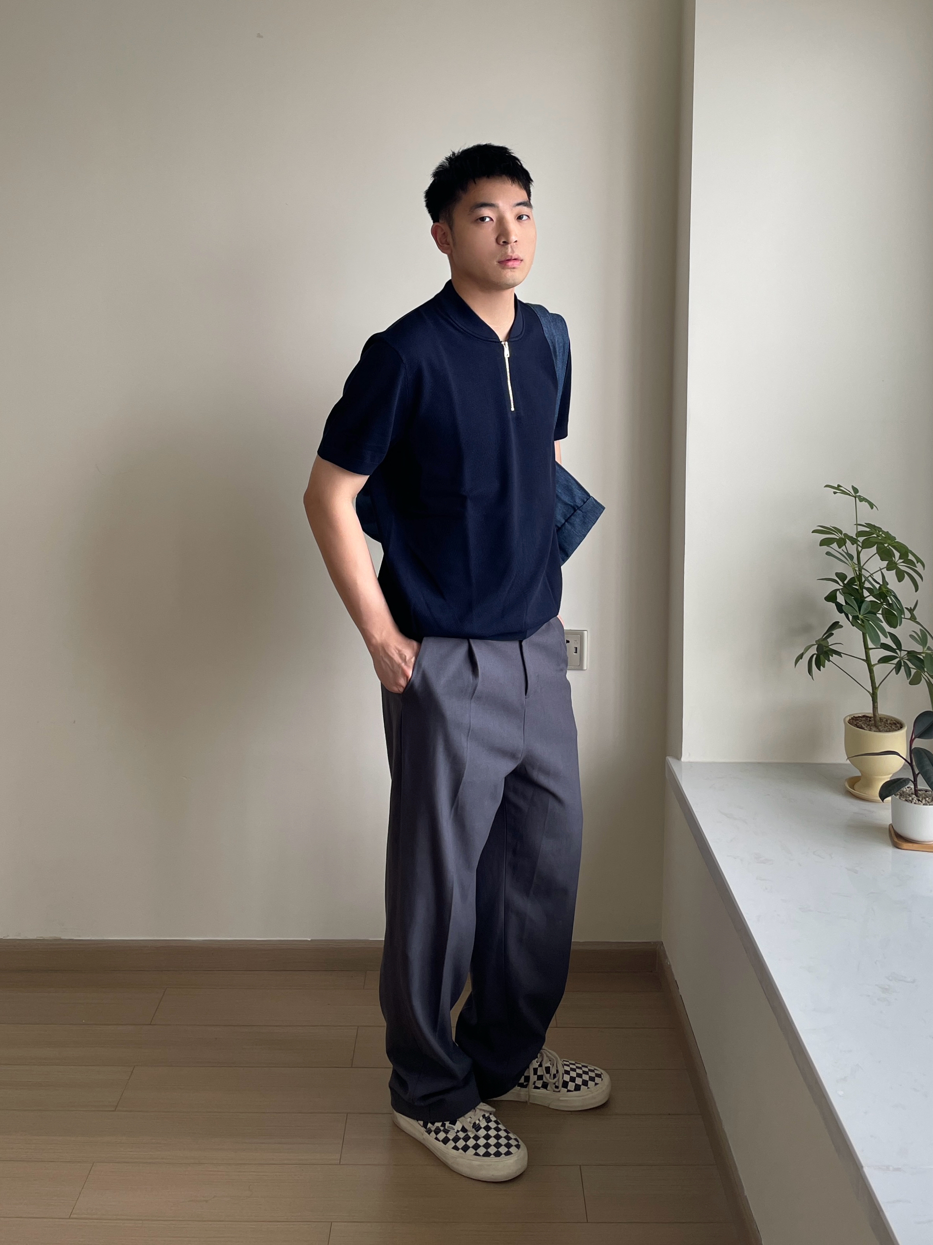 👕- 休闲风的Polo,半拉链的设计有点法式复古味。布先生的polo,我174cm&68kg微宽松版型,适合休闲通勤。 👖- 今天休息,挑了一条裤脚微喇的灰色直筒西裤。整体有点版型巧思。 👟- 棋盘格就挺百搭好看的。