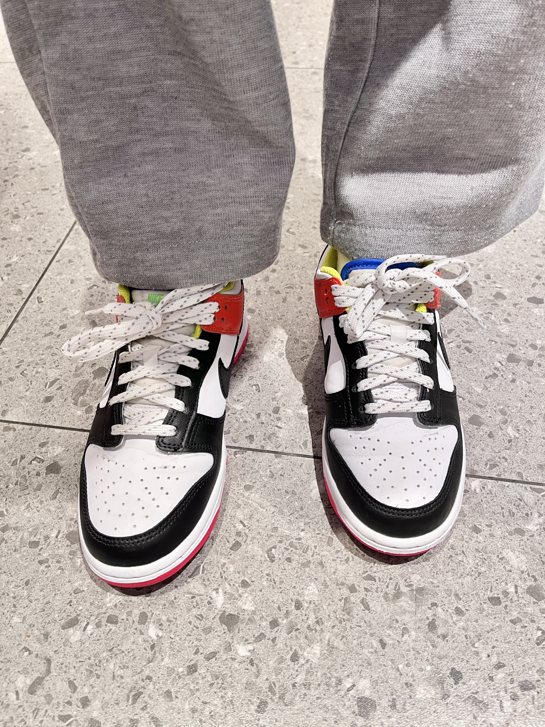 这双dunk彩色拼接 是我某天深夜逛得物发现的, 一下子就被它的配色吸引住了, 黑白熊猫🐻❄️配色的前脸, 橙色的侧脸和玫色的大底, 苹果绿的内衬,哦买噶的, 主打一个多彩多姿, 还有鞋带和外侧的夜光, 简直是炫爆了, 价格更是感人,黄金尺码四百左右, 性价比也高, 日常通勤休闲穿都很香!