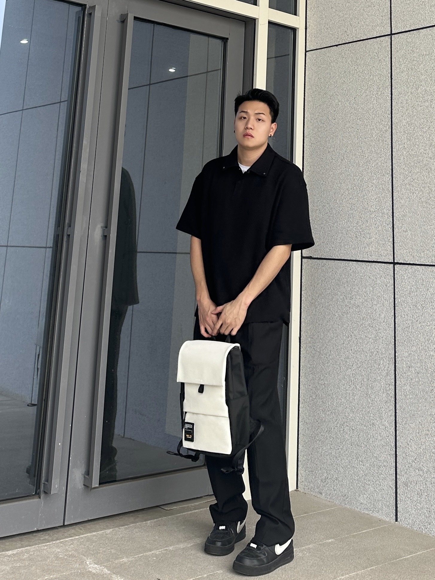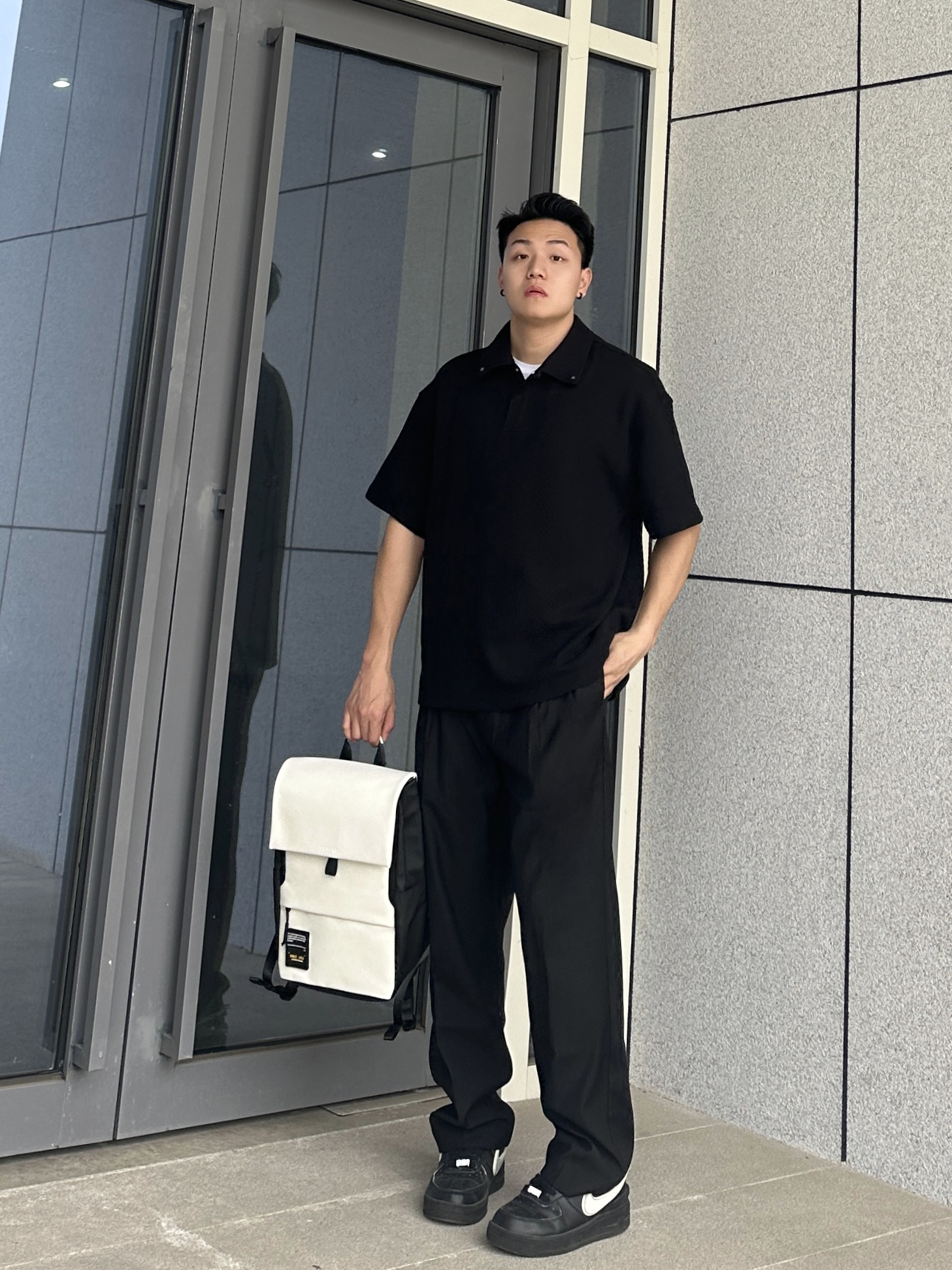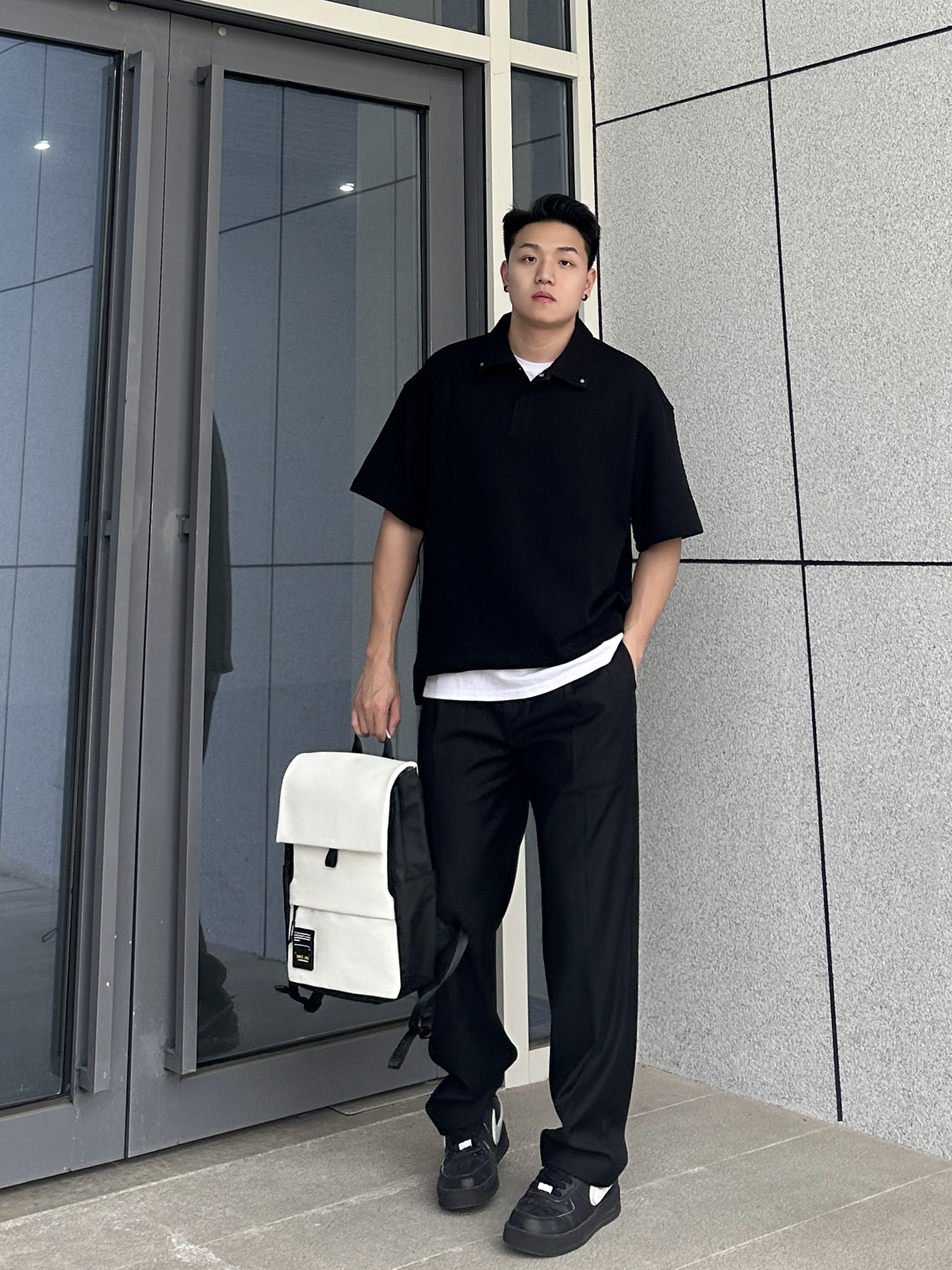 哈喽~这里是小聂 今天上身CHINISM的Polo短袖 肌理感面料触感真的很柔软舒服 版型宽松休闲 白T内搭整个就很显瘦 搭配上CH的这条垂感很棒的黑色西裤 整个一身黑白搭配简约百搭不会出错 再来个学生党、通勤党都爱的白色双肩包 容量很给力 装个平板、书本绰绰有余 双肩包颜值也很高 特别是牛奶白我太爱了! 整个皮质很有质感 纽扣、拉链的细节都很不错 日常通勤背特别方便 搭配穿搭也很洋气哈 小聂身...