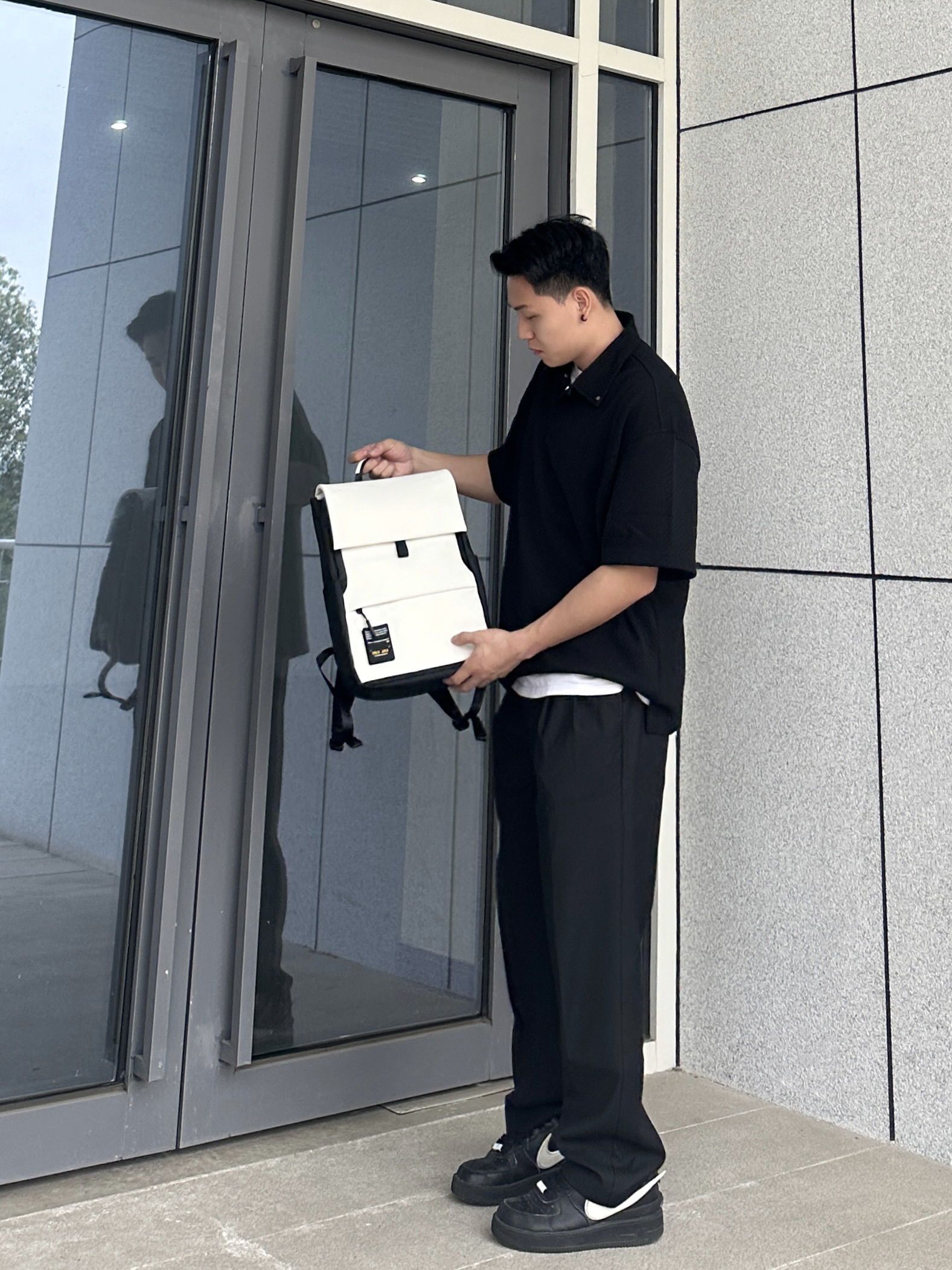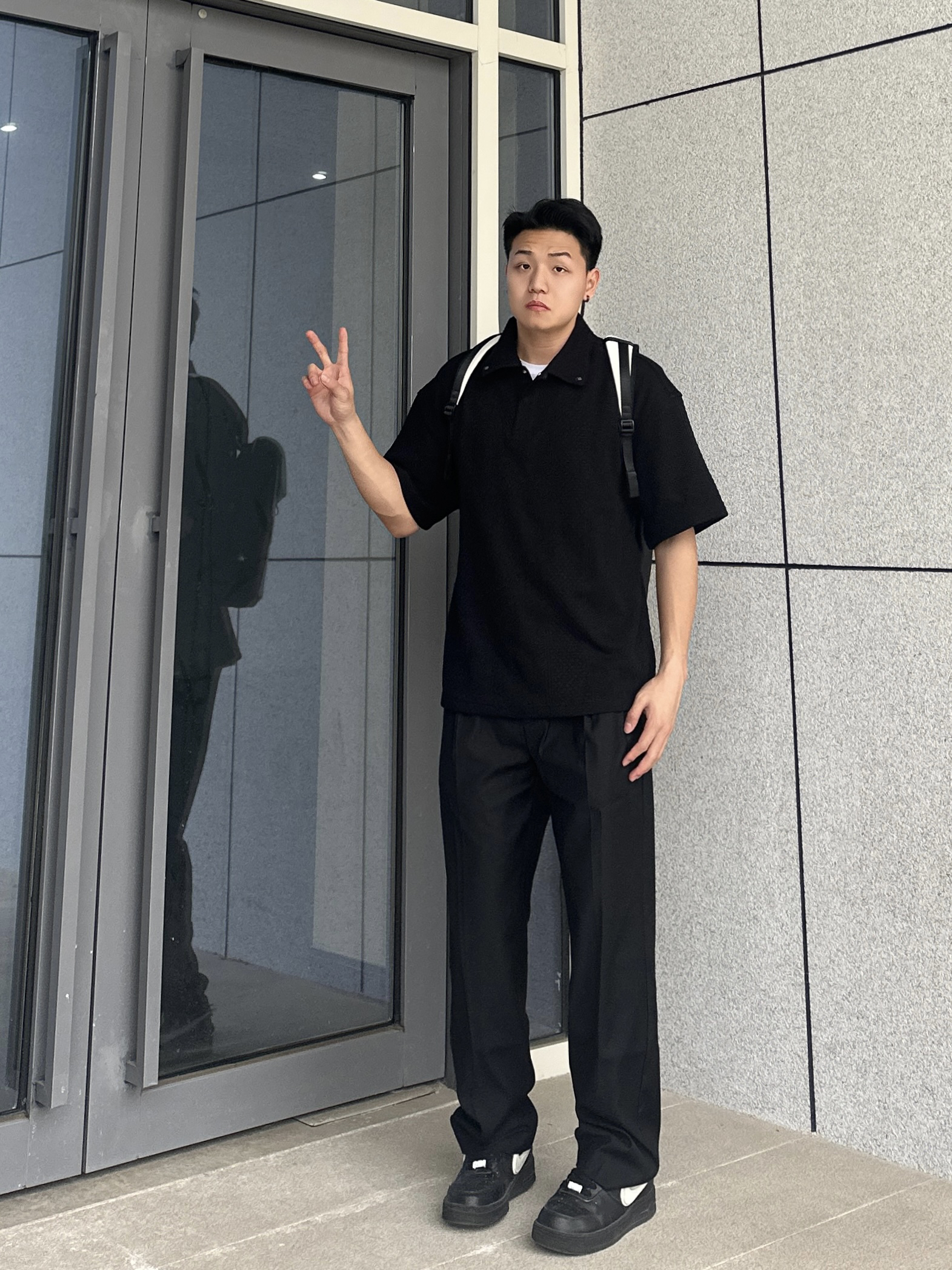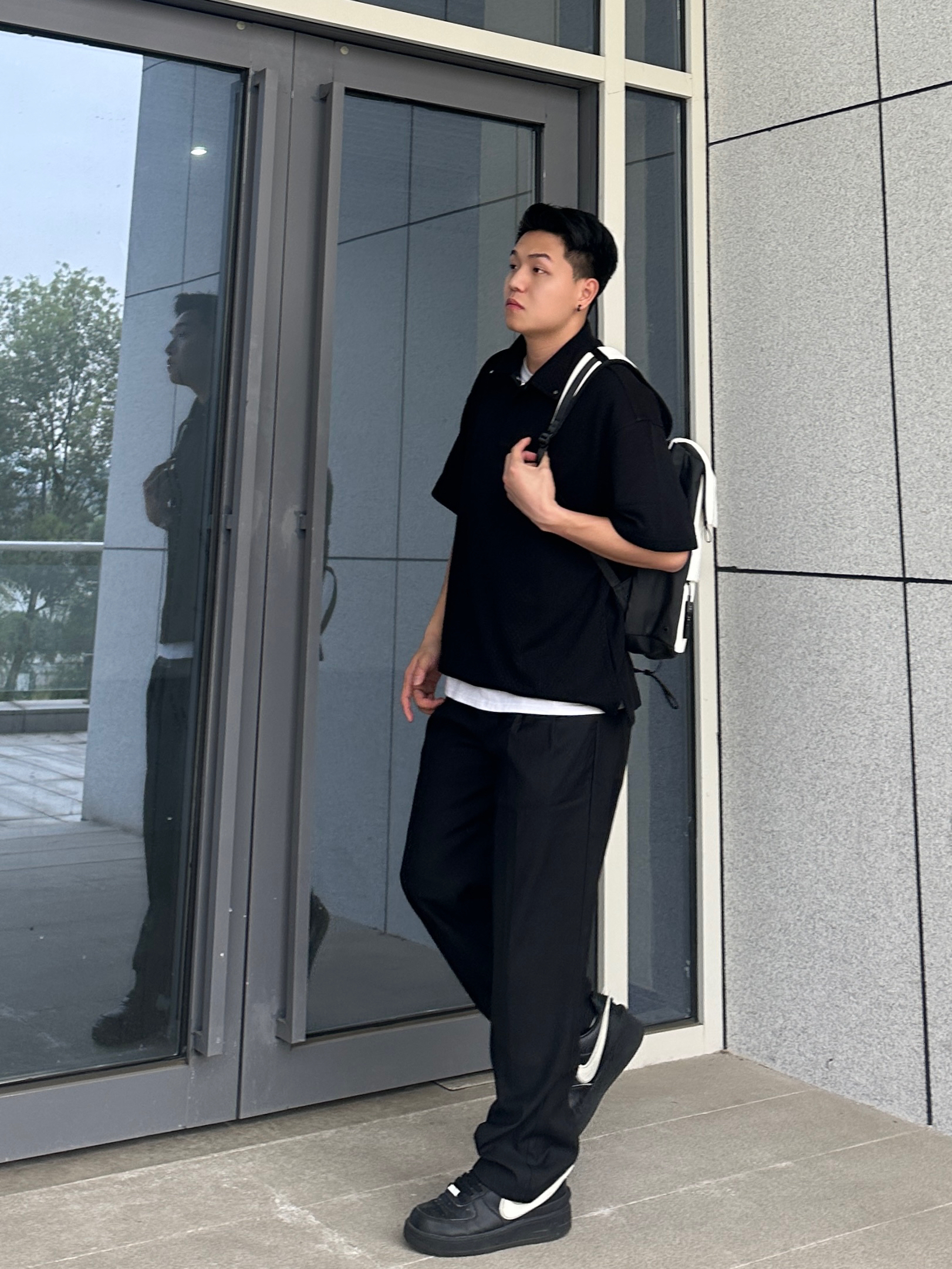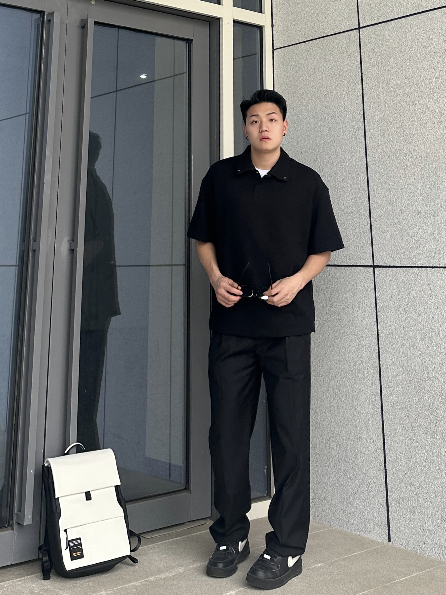 哈喽~这里是小聂 今天上身CHINISM的Polo短袖 肌理感面料触感真的很柔软舒服 版型宽松休闲 白T内搭整个就很显瘦 搭配上CH的这条垂感很棒的黑色西裤 整个一身黑白搭配简约百搭不会出错 再来个学生党、通勤党都爱的白色双肩包 容量很给力 装个平板、书本绰绰有余 双肩包颜值也很高 特别是牛奶白我太爱了! 整个皮质很有质感 纽扣、拉链的细节都很不错 日常通勤背特别方便 搭配穿搭也很洋气哈 小聂身...