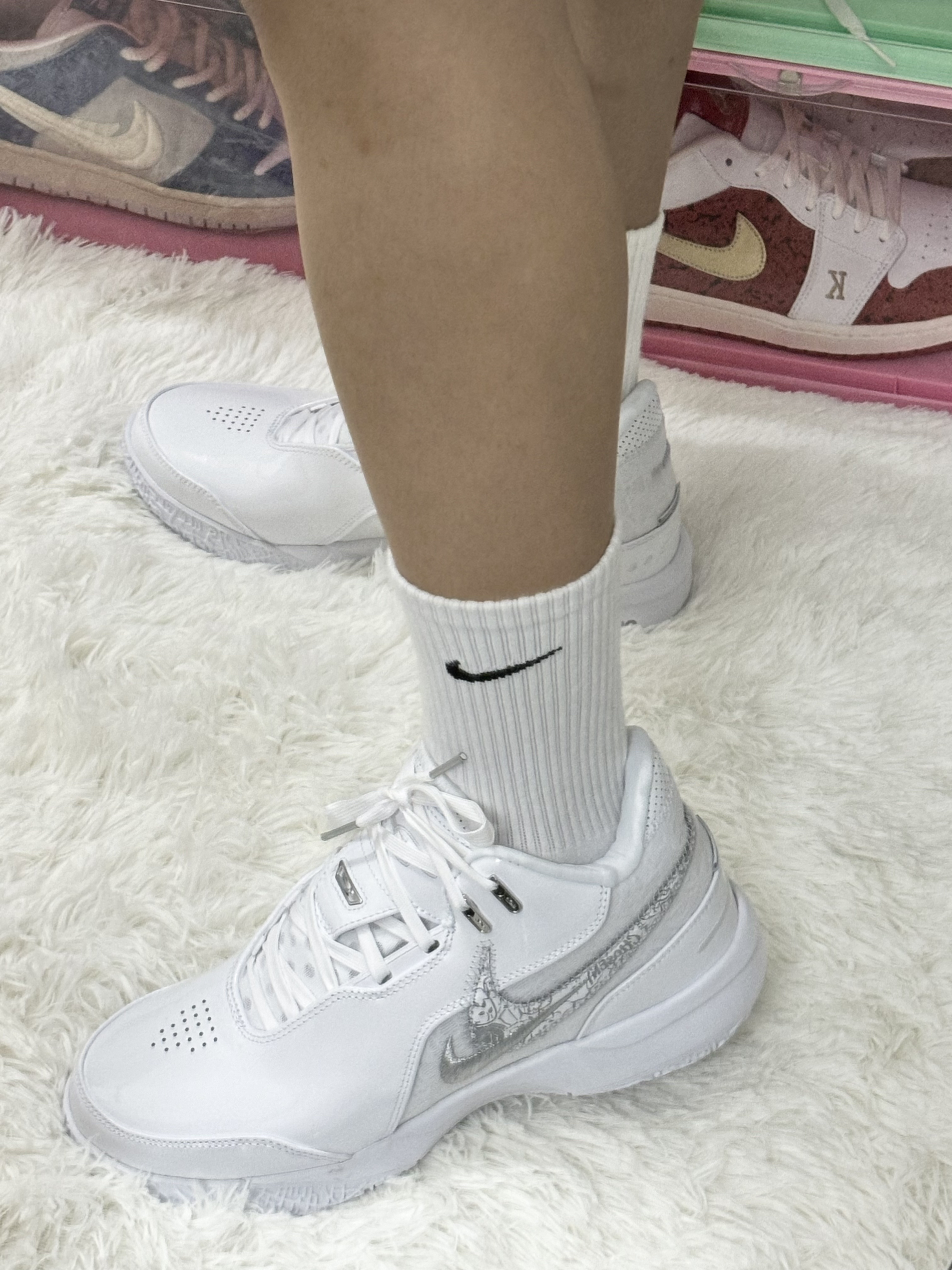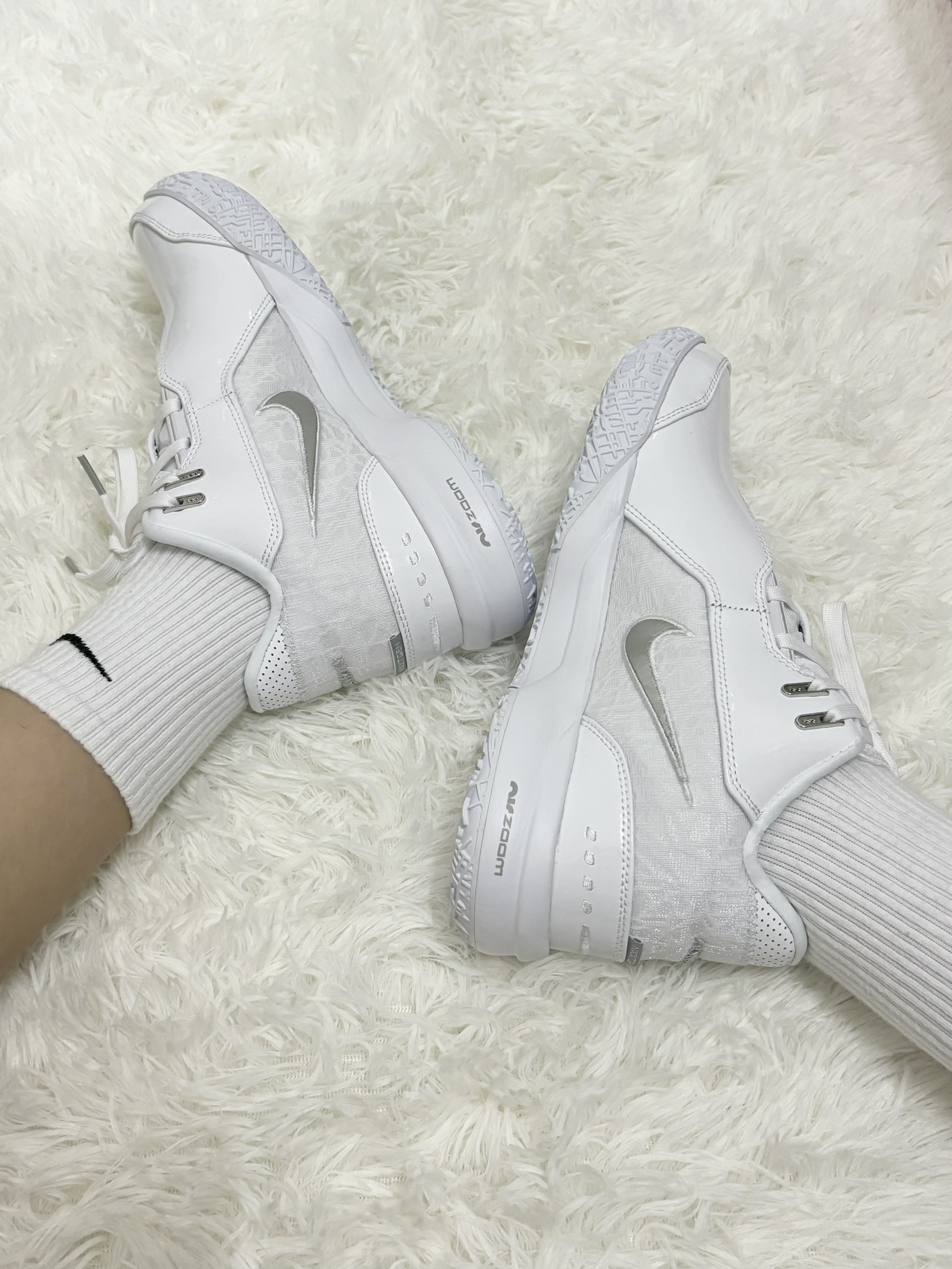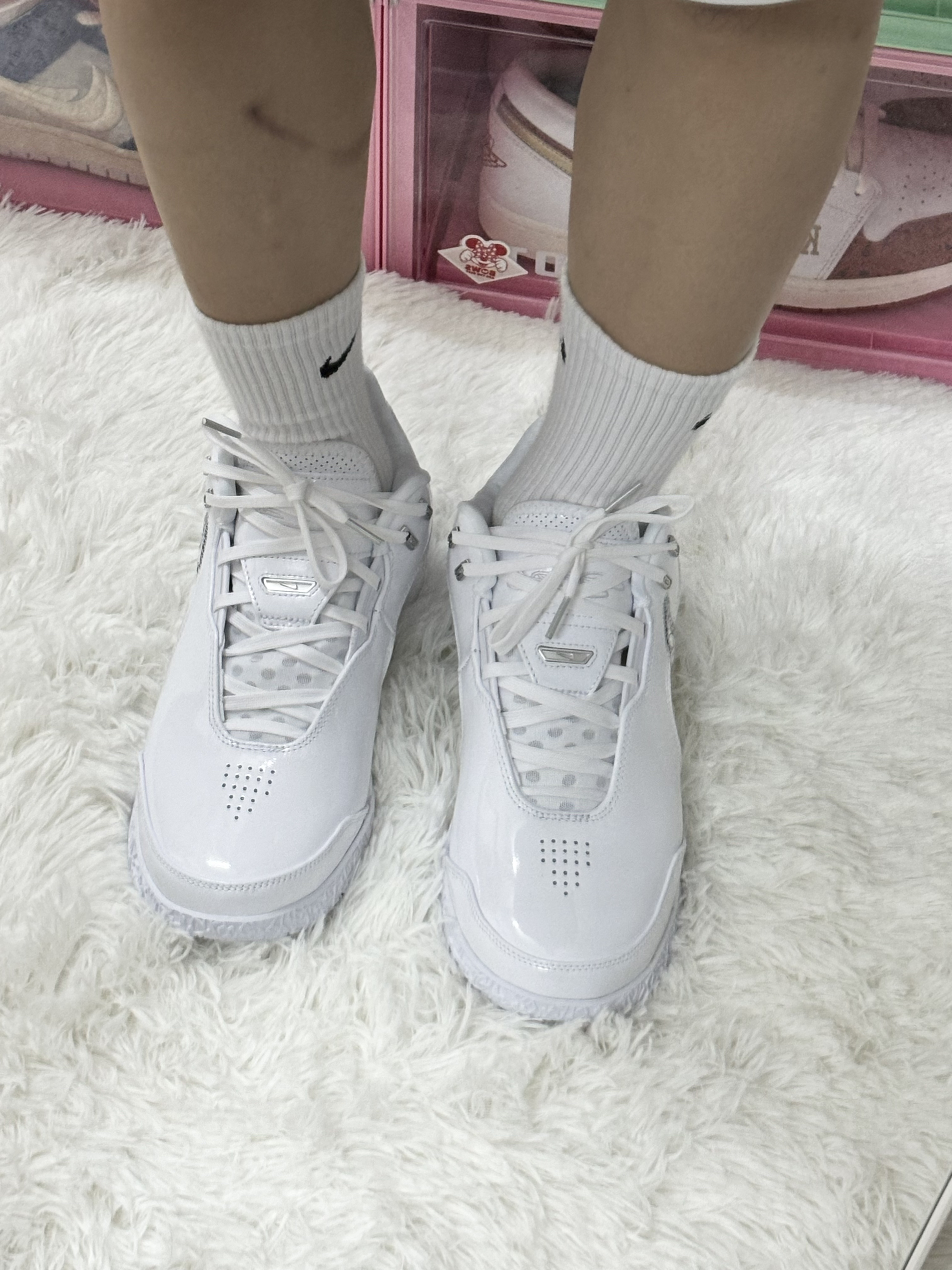 纯白配色加皮革鞋面质感很不错有光泽。 相比于其他的这个皮革的鞋面不会存在兜不住脚的情况,皮革也会比较好打理。 皮革鞋面的透气性比较差,夏天不适合穿太闷了。 鞋内里的填充很厚,穿着包裹性很好。 鞋后跟zoom气垫缓震很足,稳定性好。
