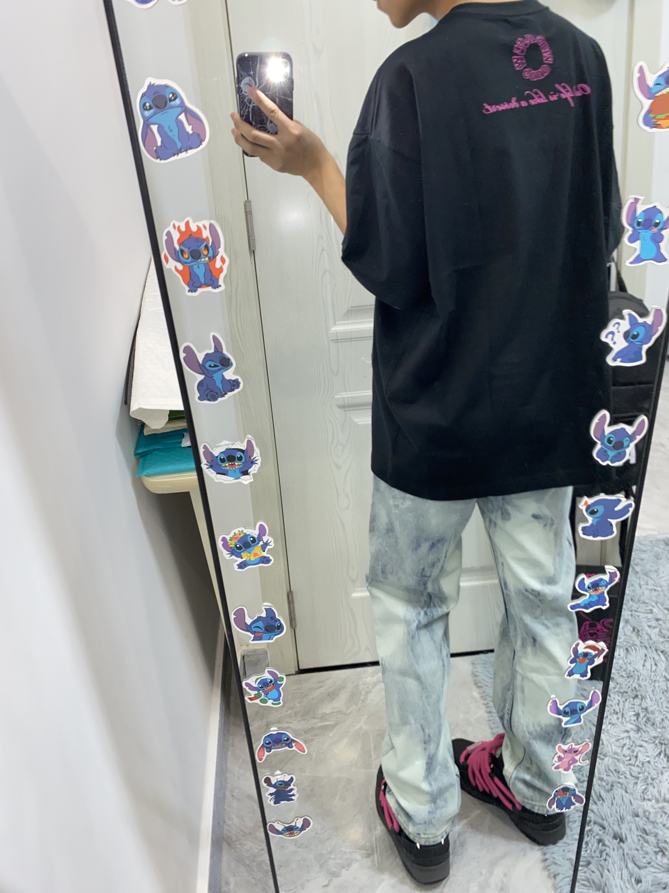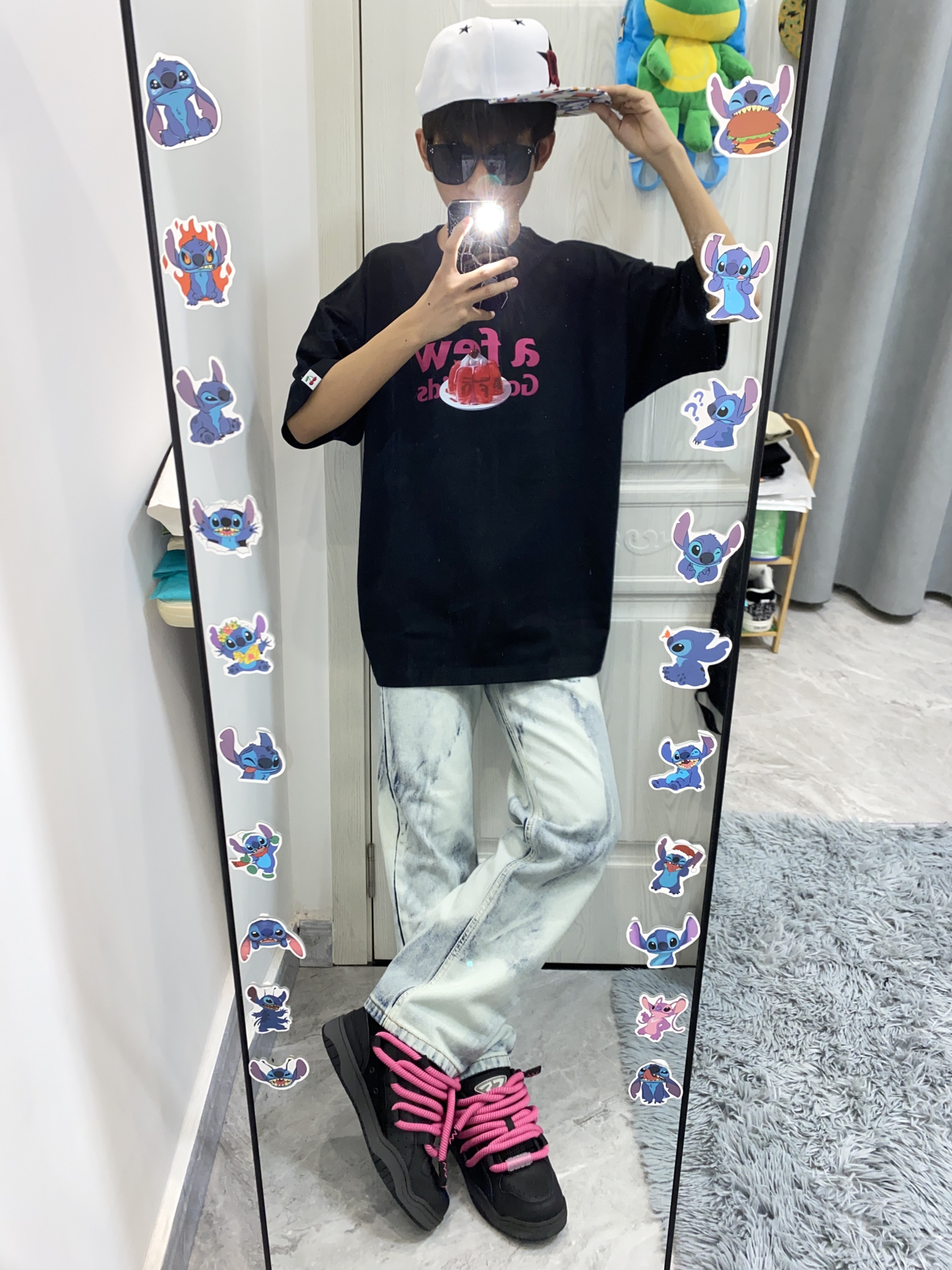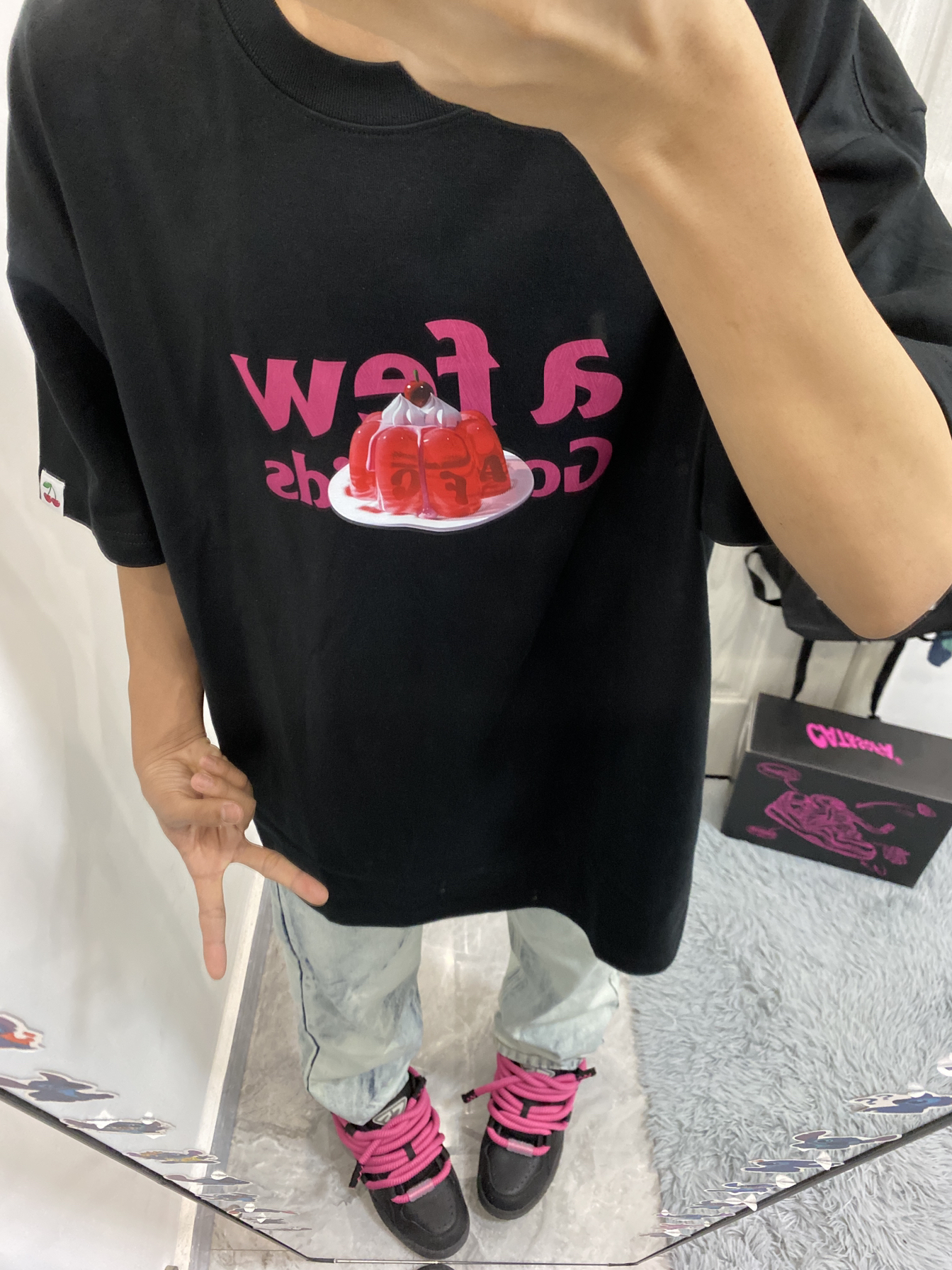 今日份ootd分享/ 上面穿的是AFGK家的甜品印花短袖 前面的图案好好看🤩 背面是afgk经典logo印花 下面搭配的是美式扎染牛仔裤 穿的是猫与沙发黑粉脏辫面包鞋