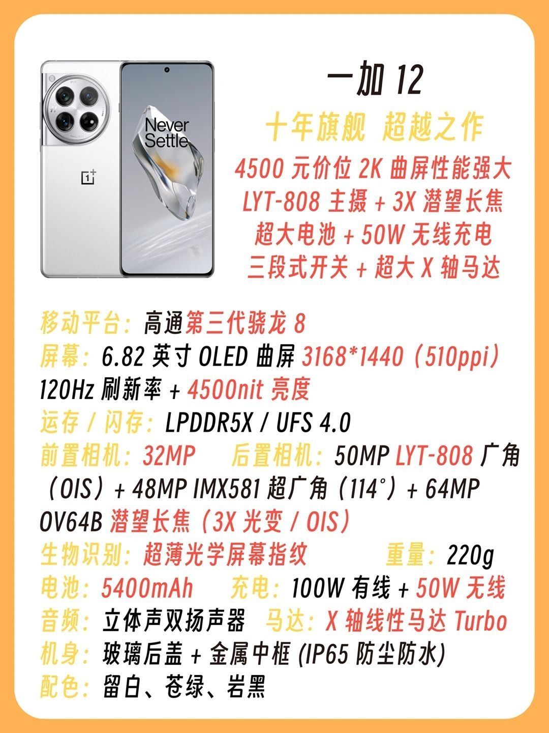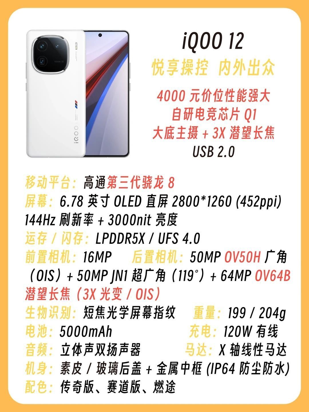 质价比旗舰! 性能影像旗舰标准版 👍🏻 质价比旗舰,兼顾质感和全方位体验 1️⃣ iQOO 12 💡 大底主摄 + 潜望长焦、自研电竞芯片 Q1 2️⃣ vivo X100 💡 蔡司 T* 镀膜、潜望长焦、自研影像芯片 V2、IP68 3️⃣ 小米 14 💡 小屏旗舰、大底主摄、无线充电、IP68 4️⃣ 一加 12 💡 2K 屏、潜望长焦、超大电池、超大马达、无线充电 无广安利!大家打算购买哪一...