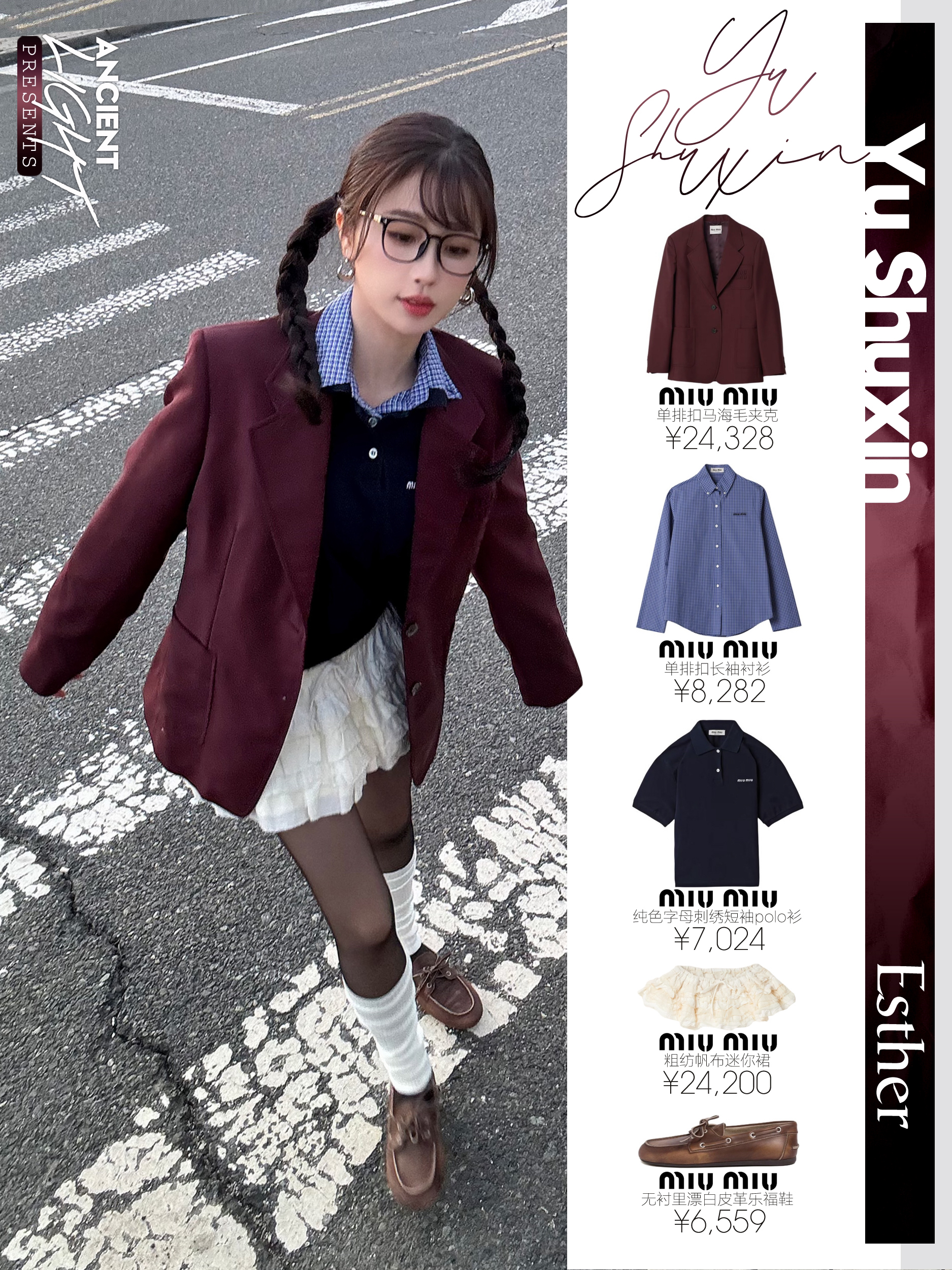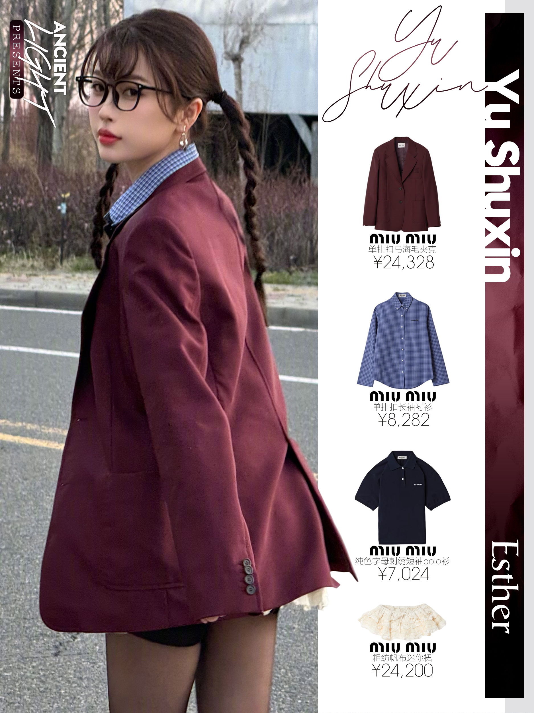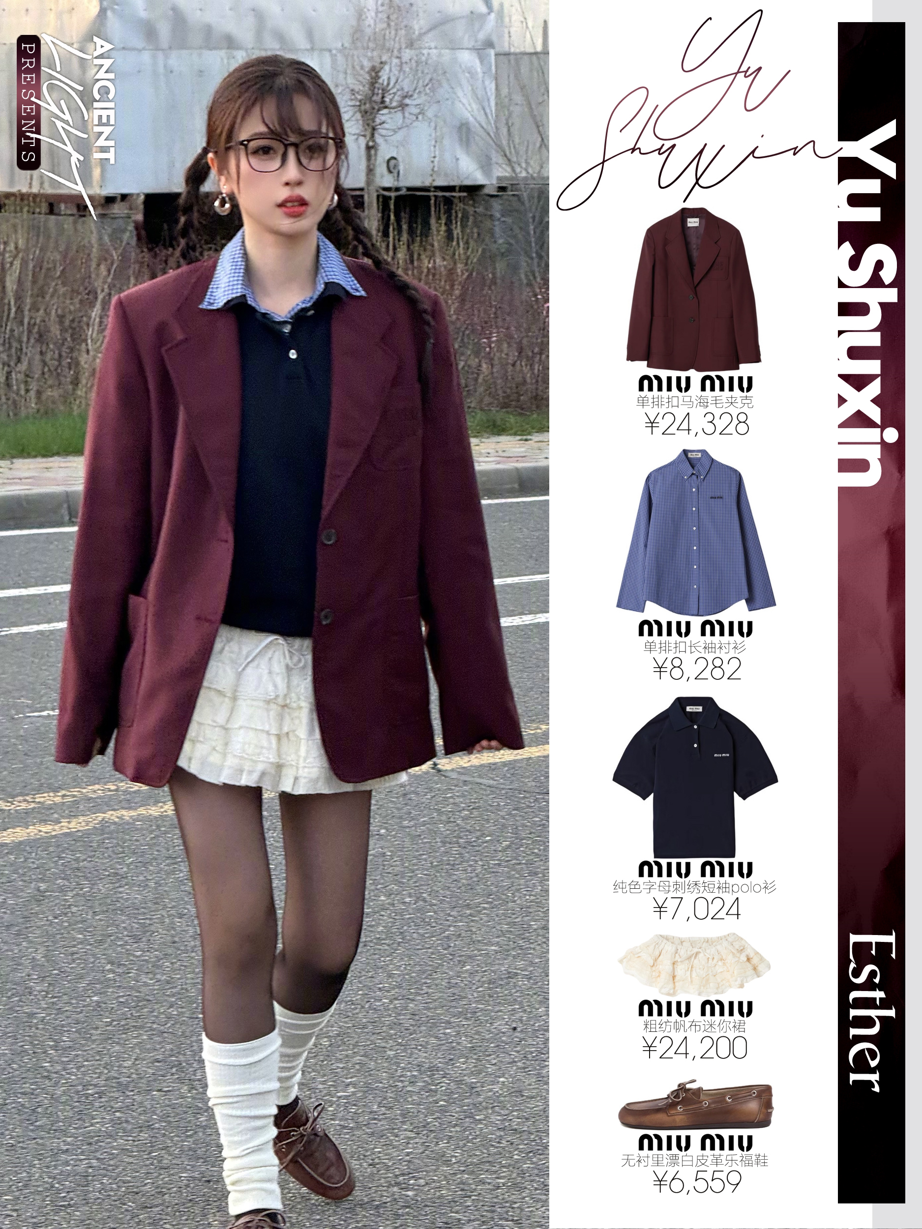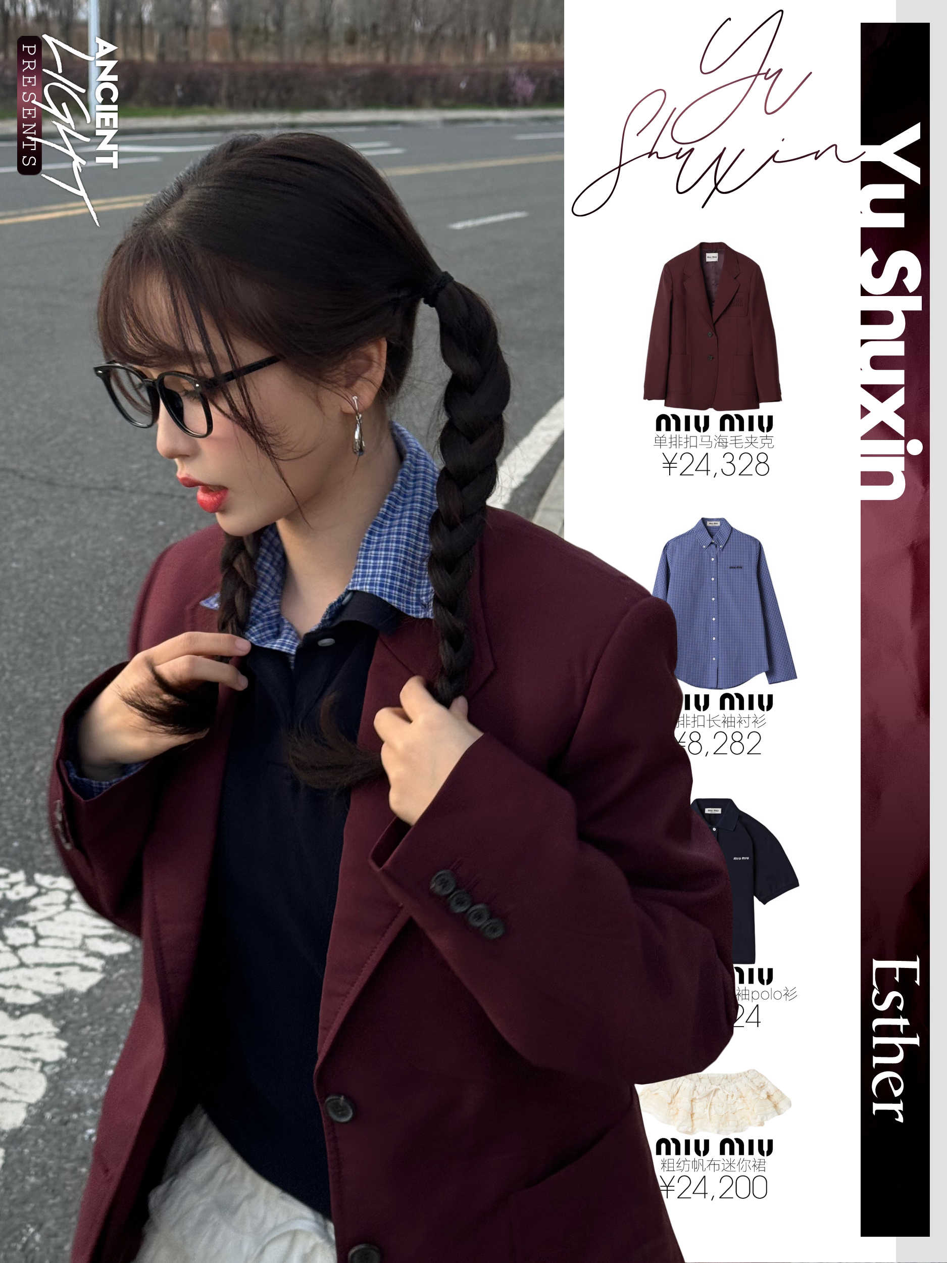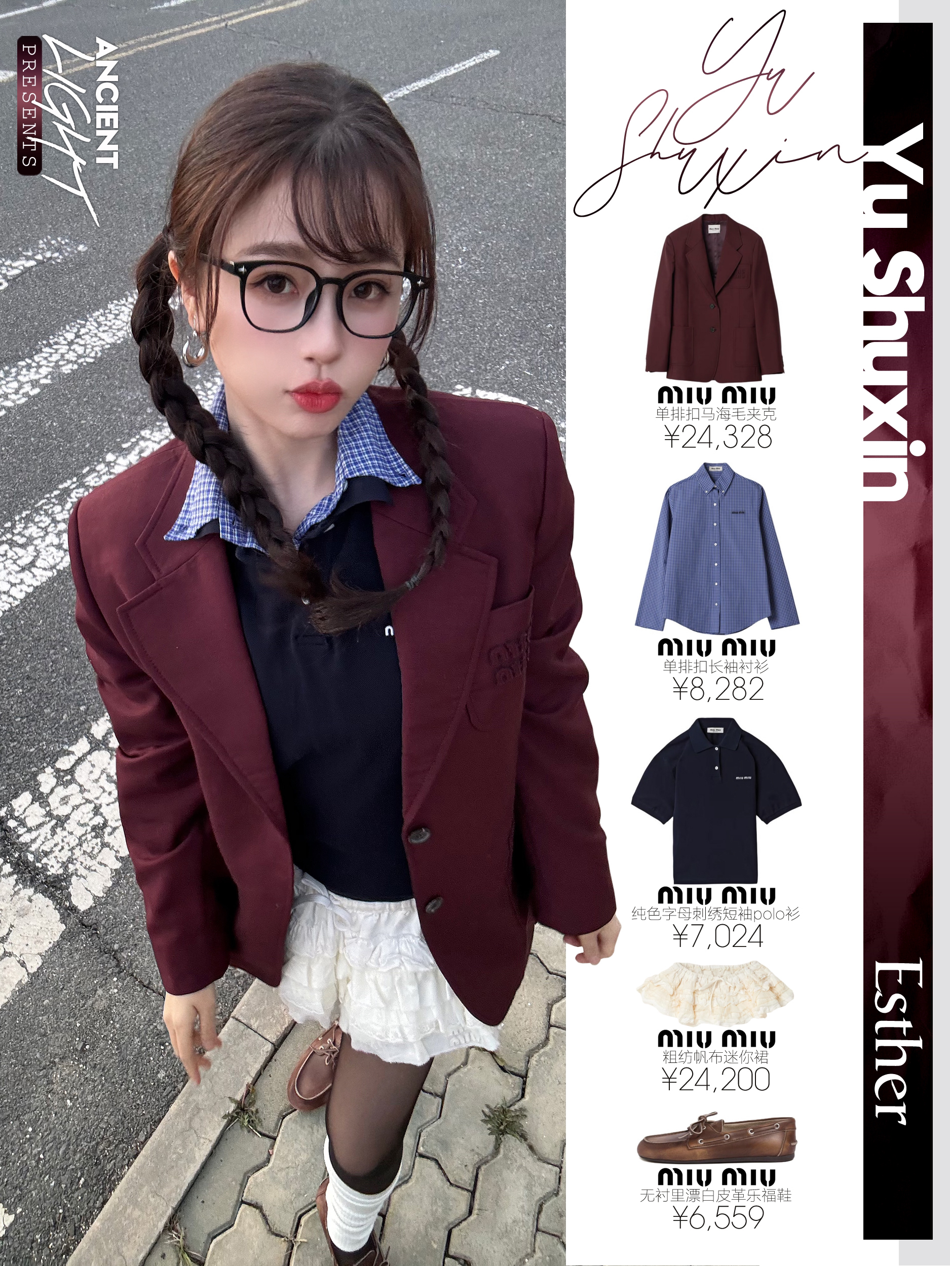 拿小板凳爱看虞书欣营业的吃瓜群众应该很多吧,主要也确实有些皂片看起来还挺有点洋气。酒红色的西服外套配以格子衬衫混搭一件短袖tee,嫩嘟嘟的小脸扎着两根麻花辫,目前她的有些服装造型,还是有点意思的。 外套|miumiu单排扣马海毛夹克 货号MH1927_12I1_F0399_S_OOO 衬衫|miumiu单排扣长袖衬衫 货号MK1842-142K-F0013-S-OOO polo衫|miumi...
