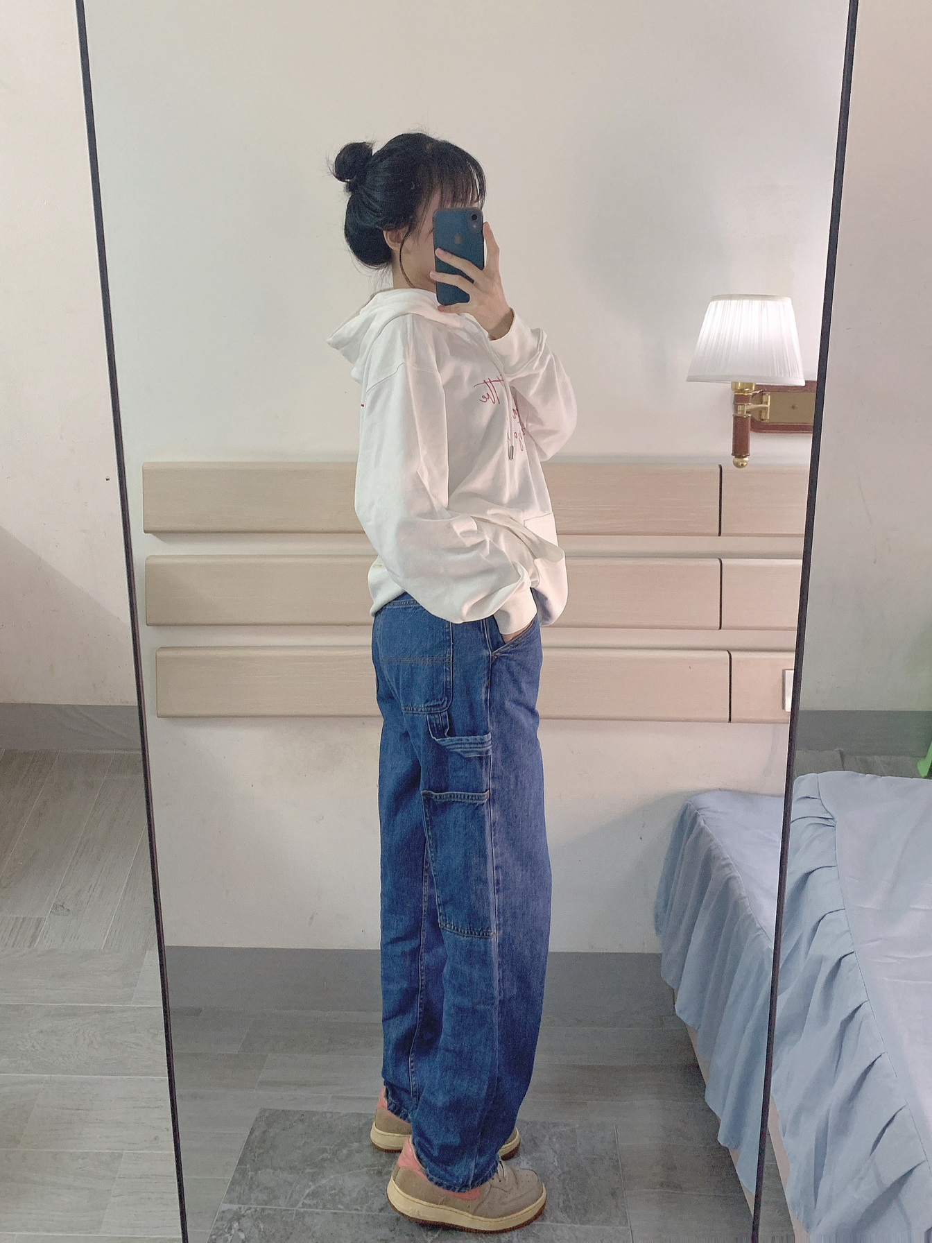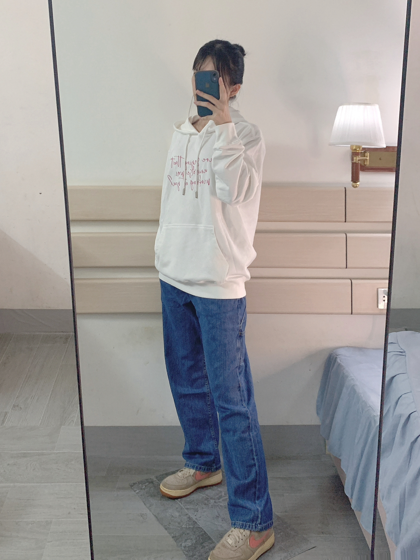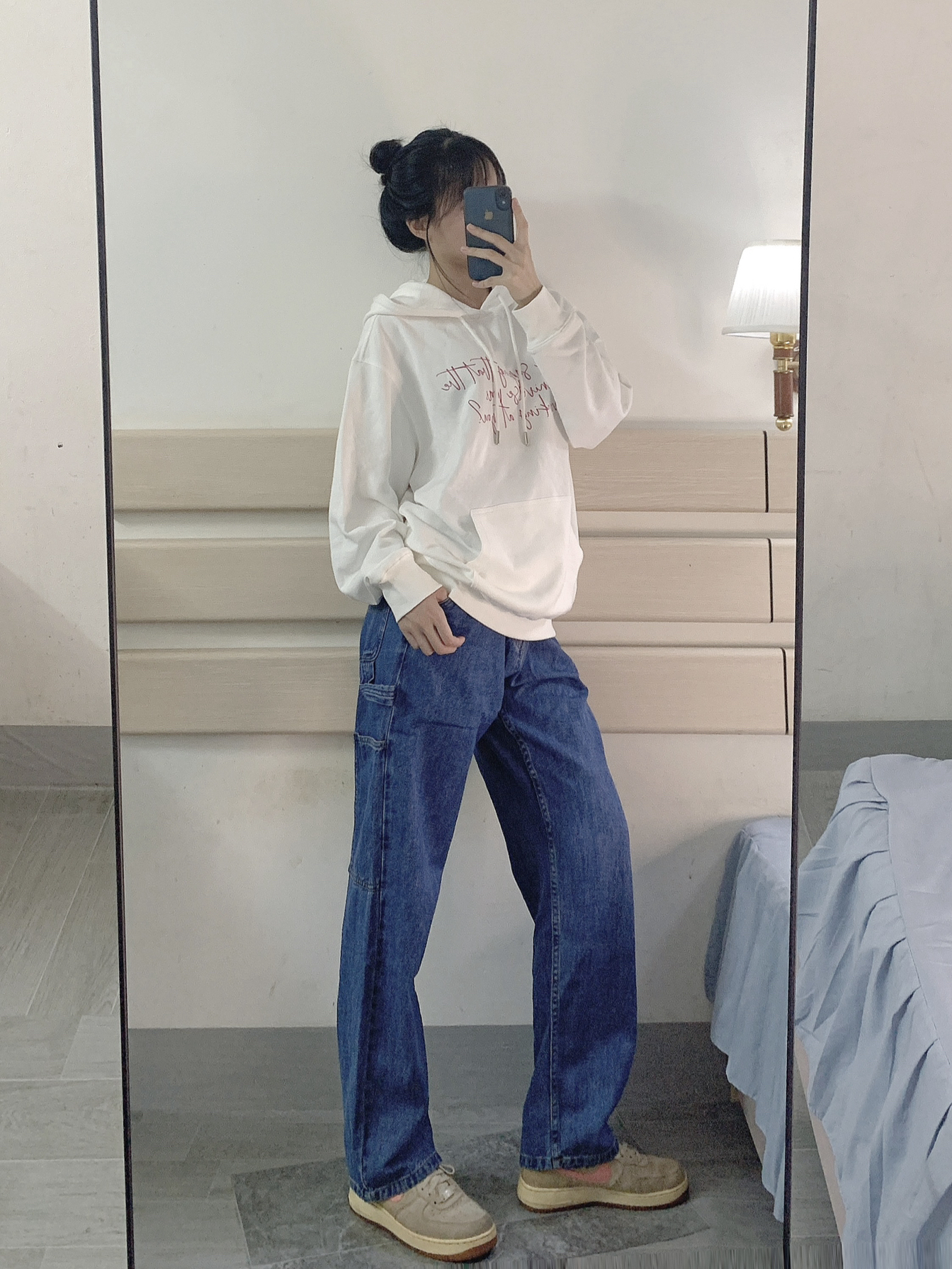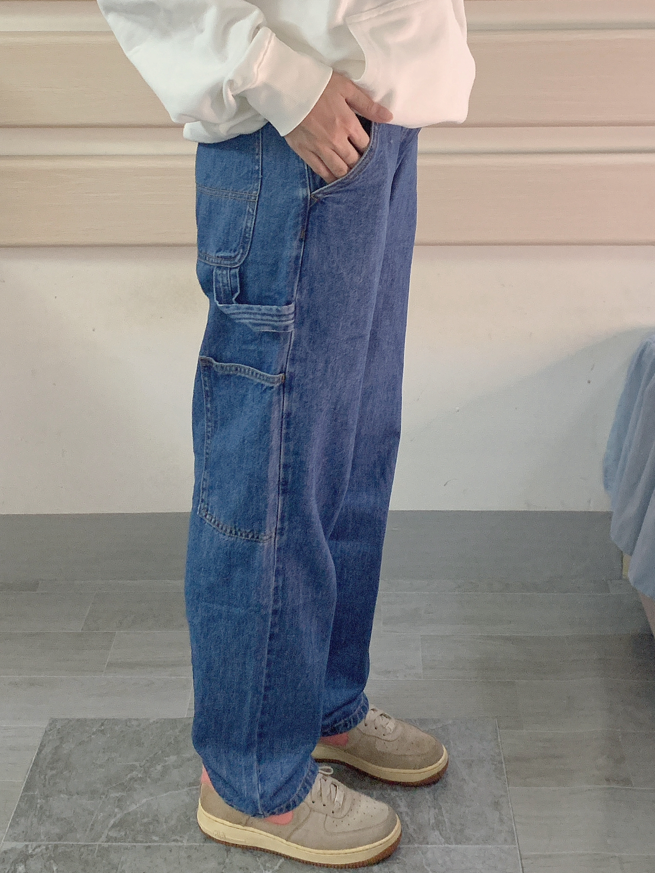 秋天就是穿长裤的季节~ 白色卫衣➕蓝色牛仔裤➕Nike空军 感觉穿上这个裤子👖真的好帅 而且版型也是我意想不到的👀 上身效果很nices 百搭又很日常 裤子的口袋旁边那个带子很有设计感 今天又是出门被要裤子链接的一天~