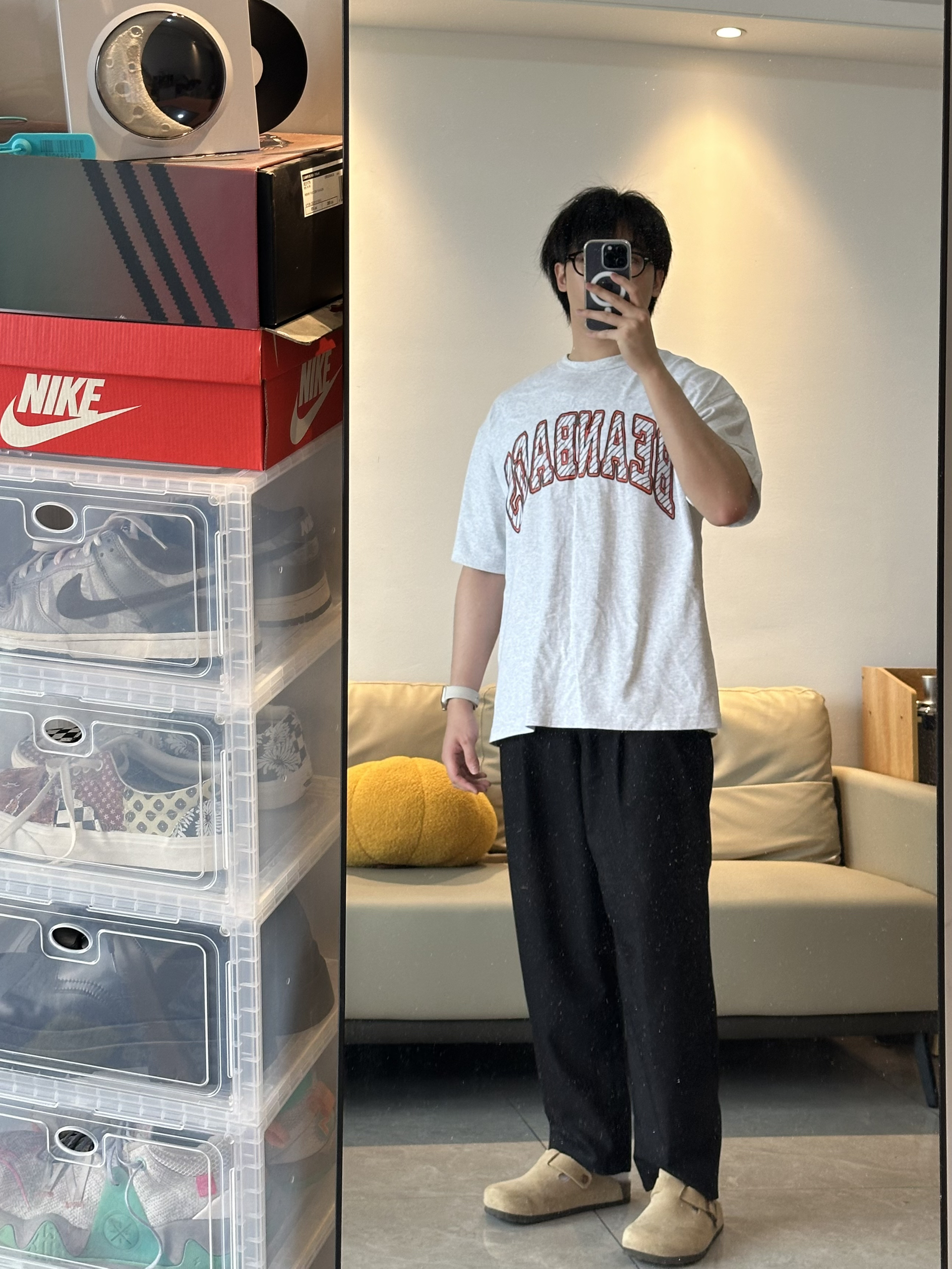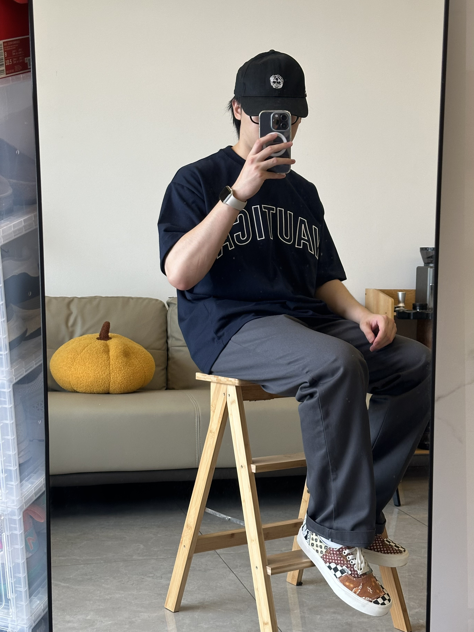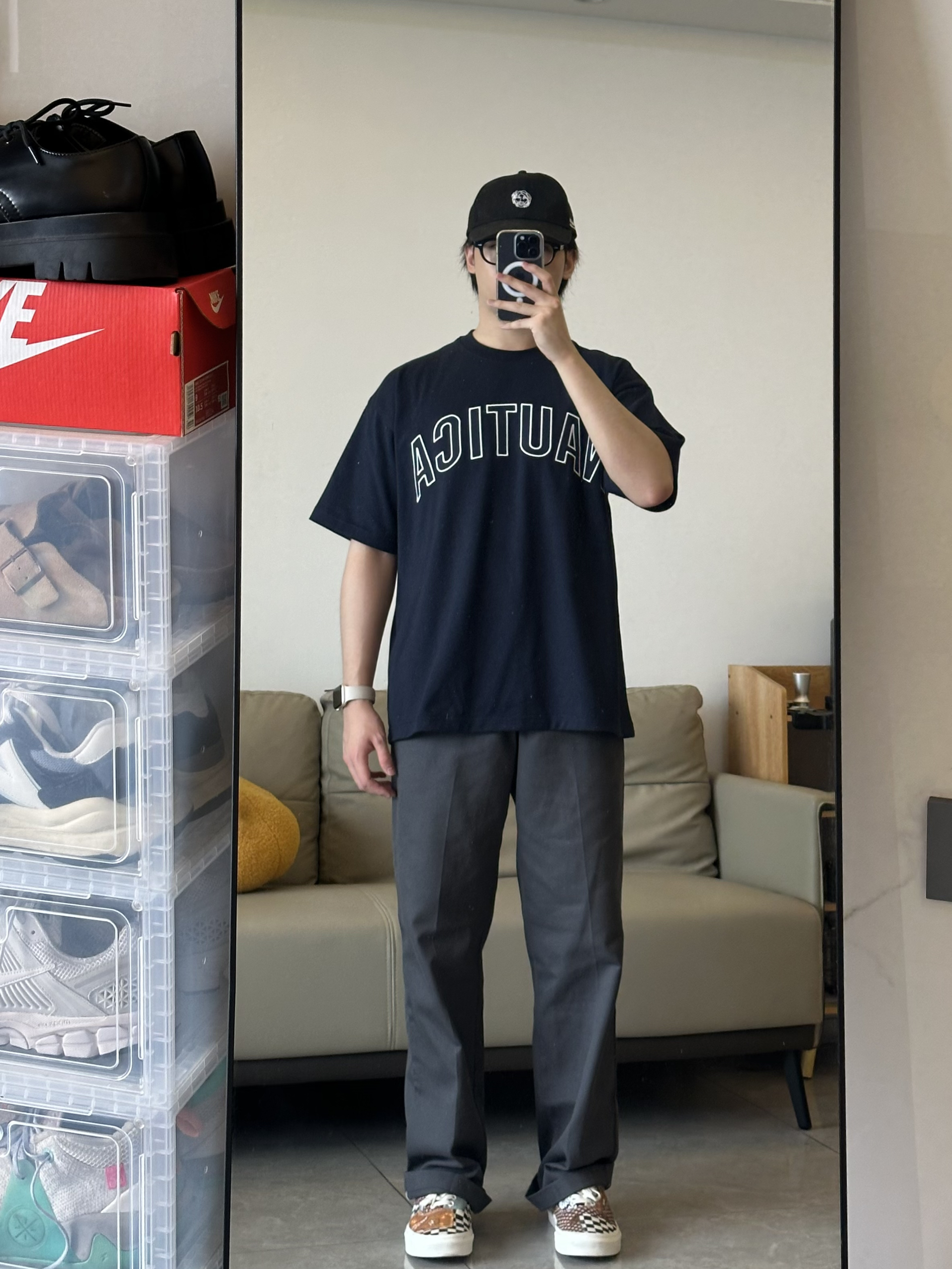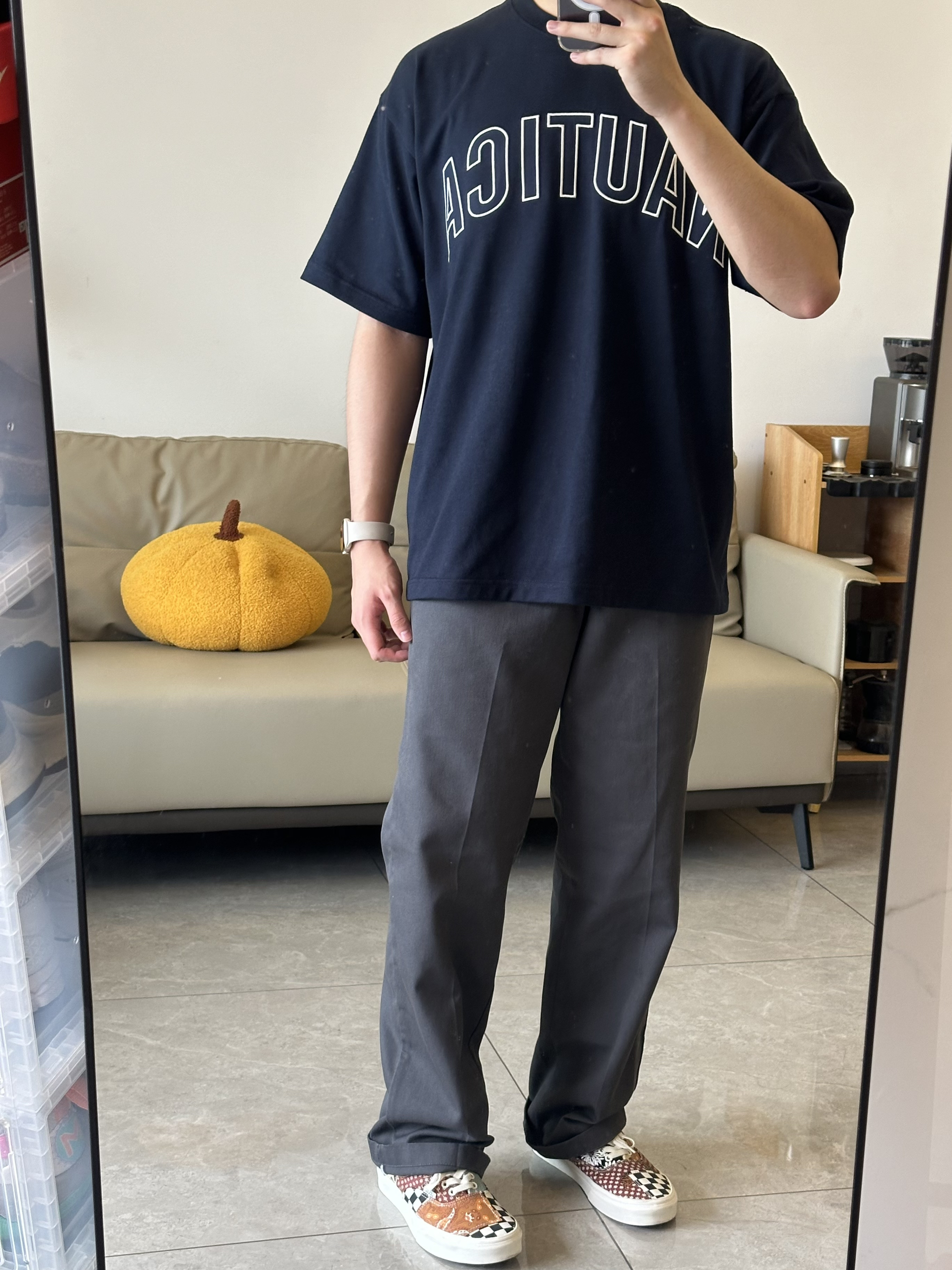 874这条裤子真的是爱不释手 硬挺的版型真的驾驭各种风格🤤 身高体重:174cm/65kg 上衣:nautica 裤子:dickies874 鞋子:Vans腰果花