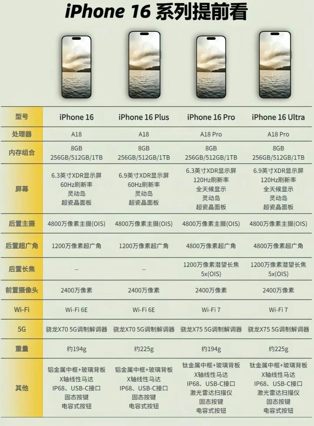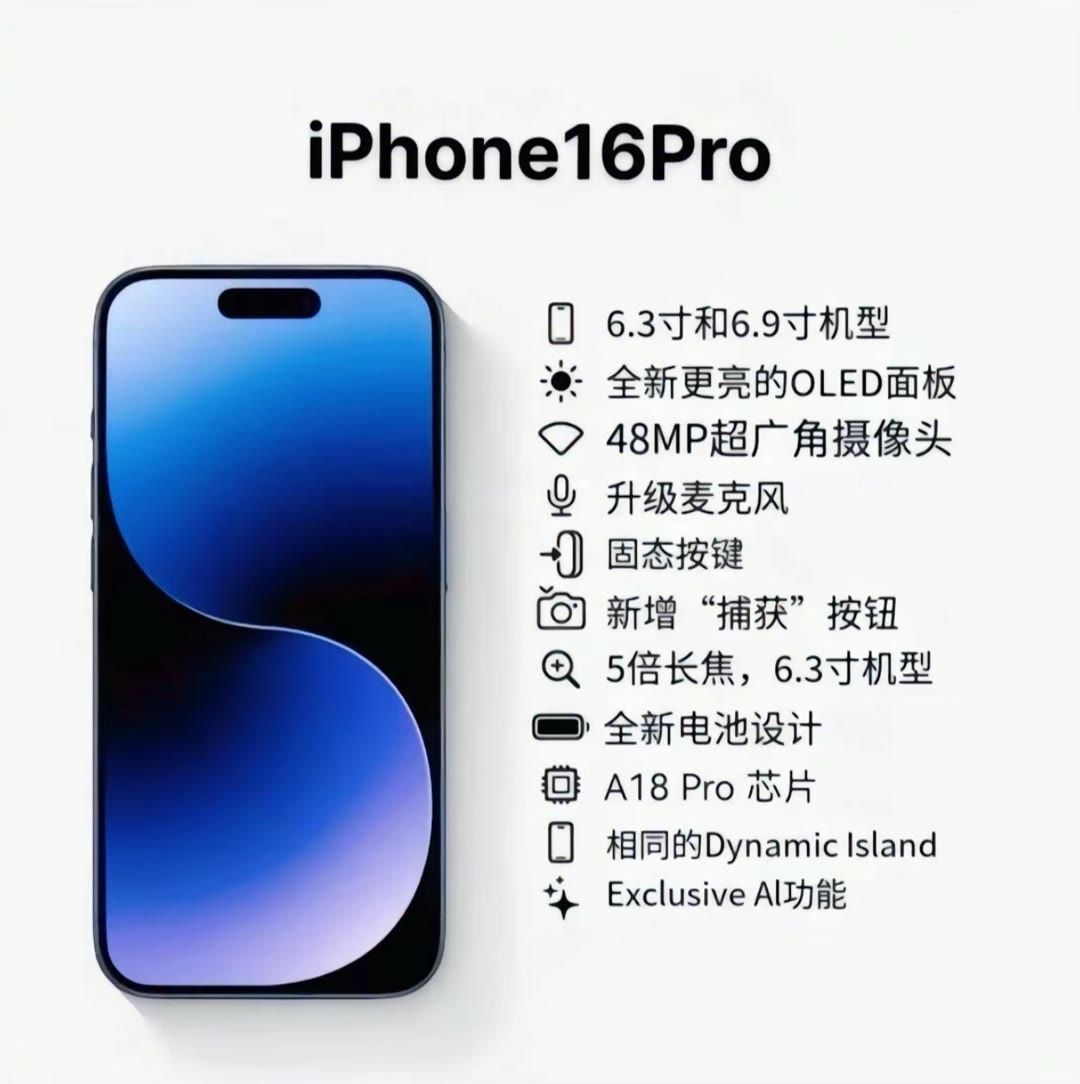 iPhone16 Pro系列,屏幕更大! iPhone 16 Pro 和iPhone 16 Pro Max,「靠谱」爆料信息汇总,供各位参考: 📱屏幕更大 得益于新技术,屏幕黑边将变窄。所以 iPhone 16 Pro 和 iPhone 16 Pro Max,由之前的6.1和6.7寸屏幕,变为6.3和6.9寸的大屏幕。 🔋电池 两款 iPhone 16 Pro 机型,电池容量小幅度提升。 📷五倍光...
