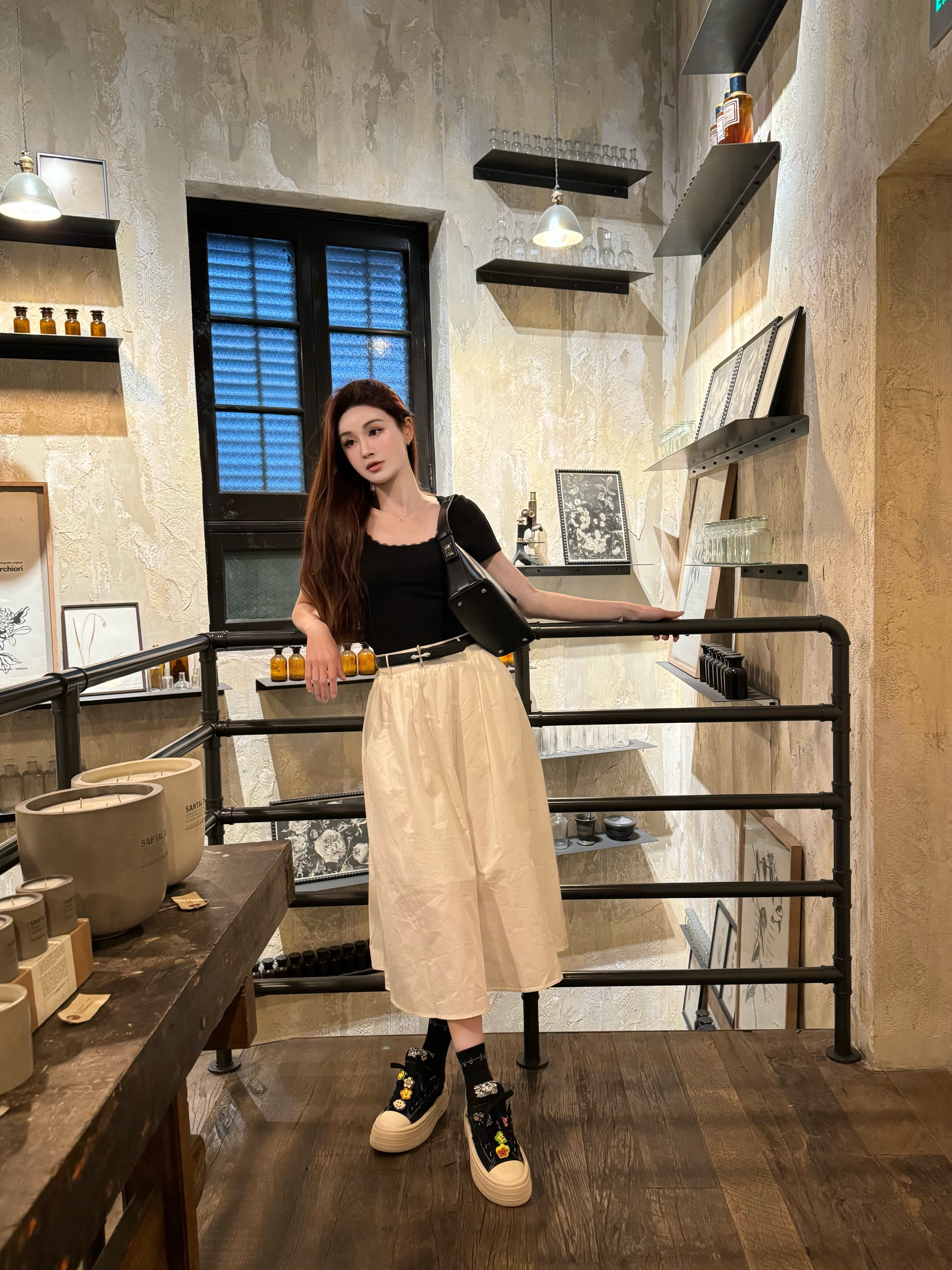 五一小长假真的是哪里都好多人! 但是总会有一些好看的地方可以拍照 想要好看吸睛还舒服 可能对我来说就是经典的黑白搭配了 上衣是一件黑色修身短袖T恤 在领子那里设计成了小花边 领口比较大 会从视觉上拉长脖子的比例 下半身是一条白色的长裙 搭配一条黑色的小皮带 腰身一下子就有了 黑色长袜和黑白配色的板鞋 鞋子上还有一些彩色的饰品 就会增加不少的童趣 和衣服也有一些呼应 黑色腋下包加入进来 一种甜酷感瞬...