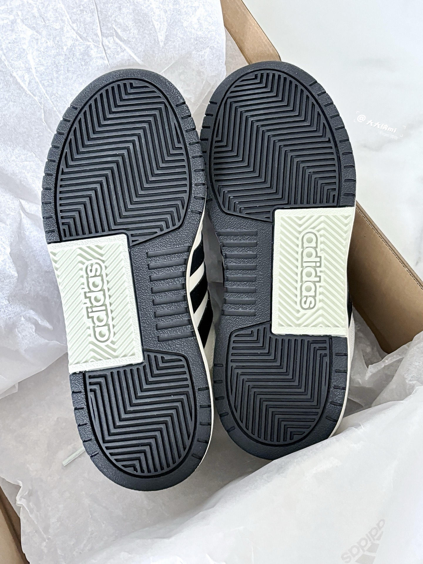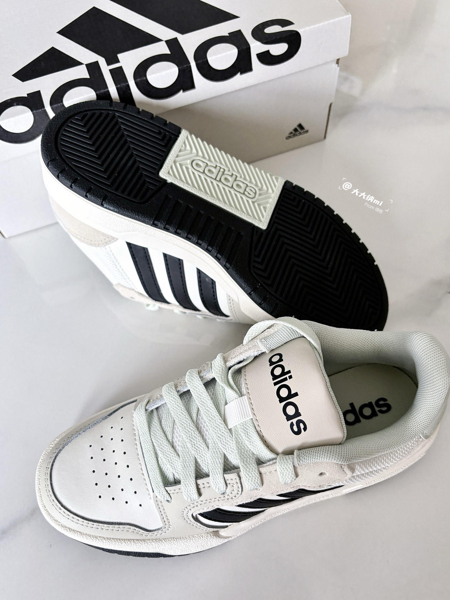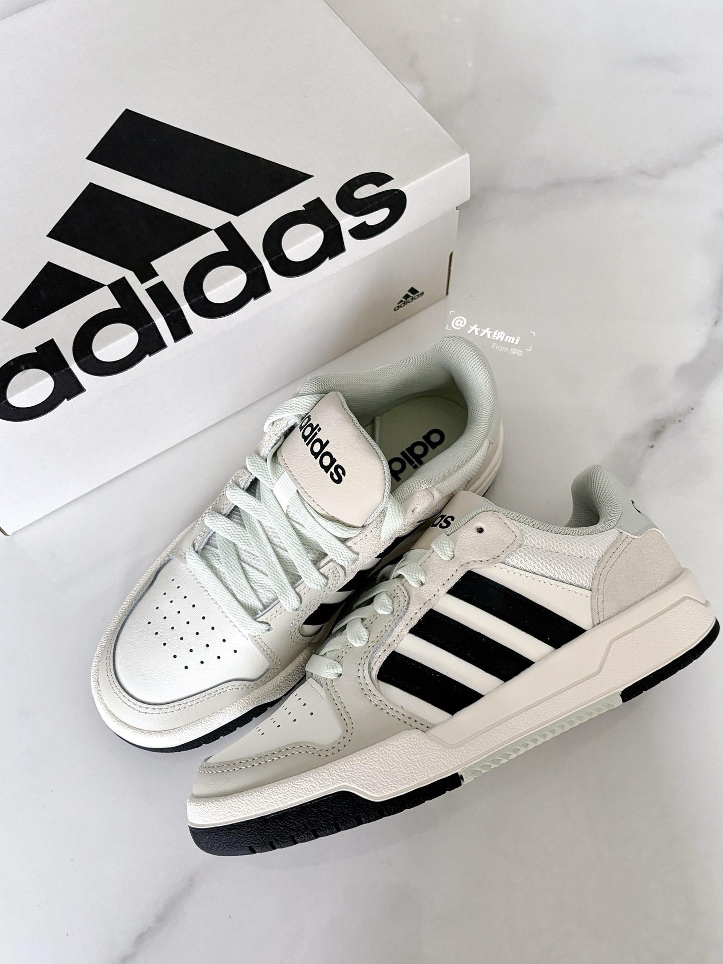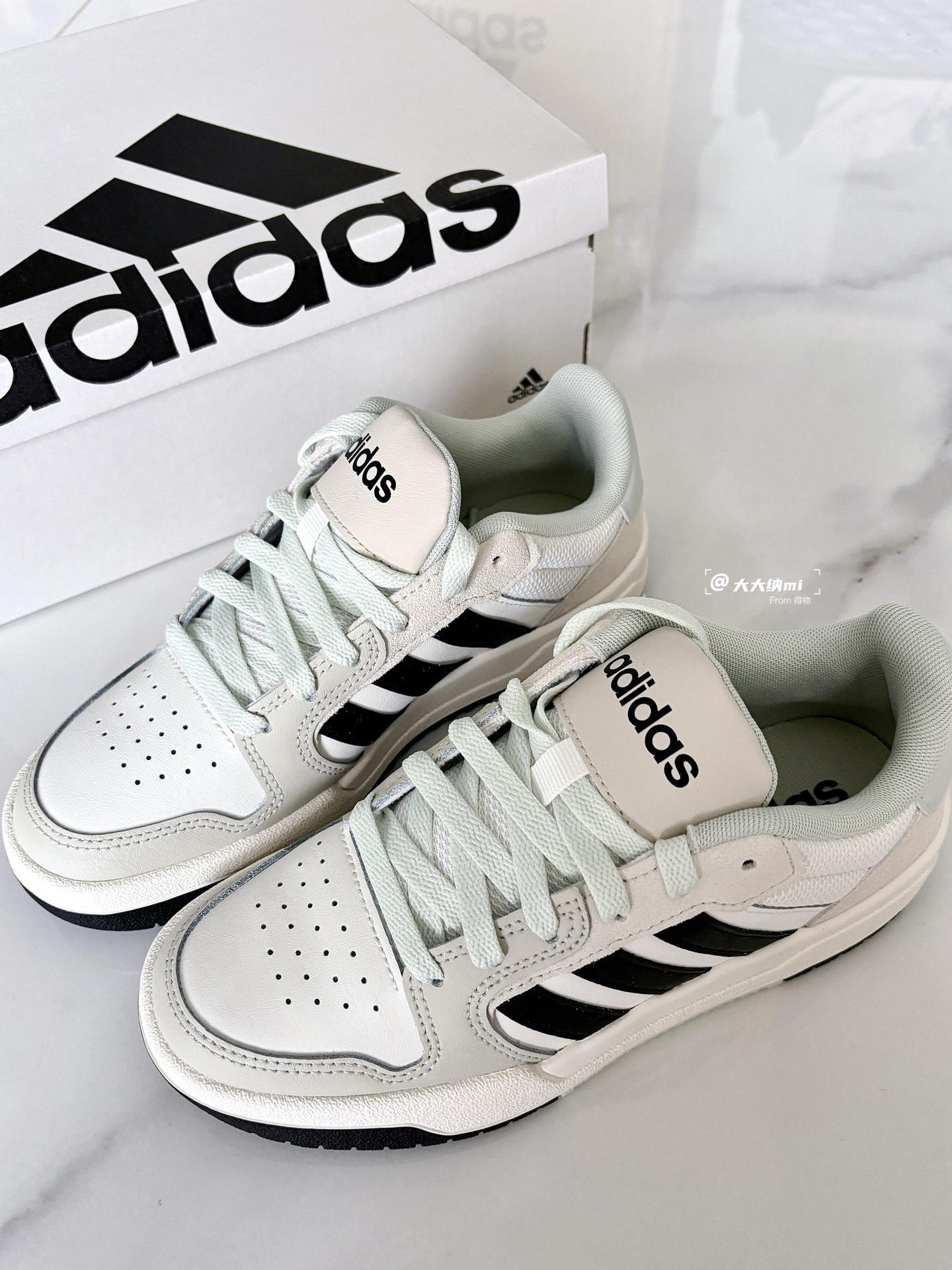 💁♂️:Hi~ 这里是大大纳mi~ Wow!入手的阿迪板鞋到货啦~ 白粽鞋面+黑色标识+淡绿点缀 一如既往温柔配色,更显沉稳! 裤子或裙装都能搭,适合春夏穿 520还没准备礼物🎁的小伙伴 送他/她这双是个不错的选择呀✅