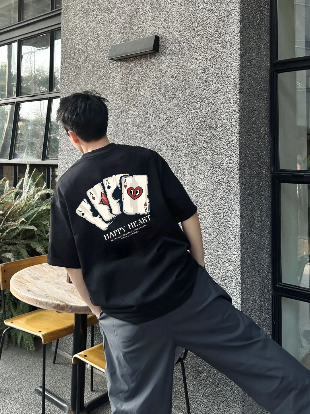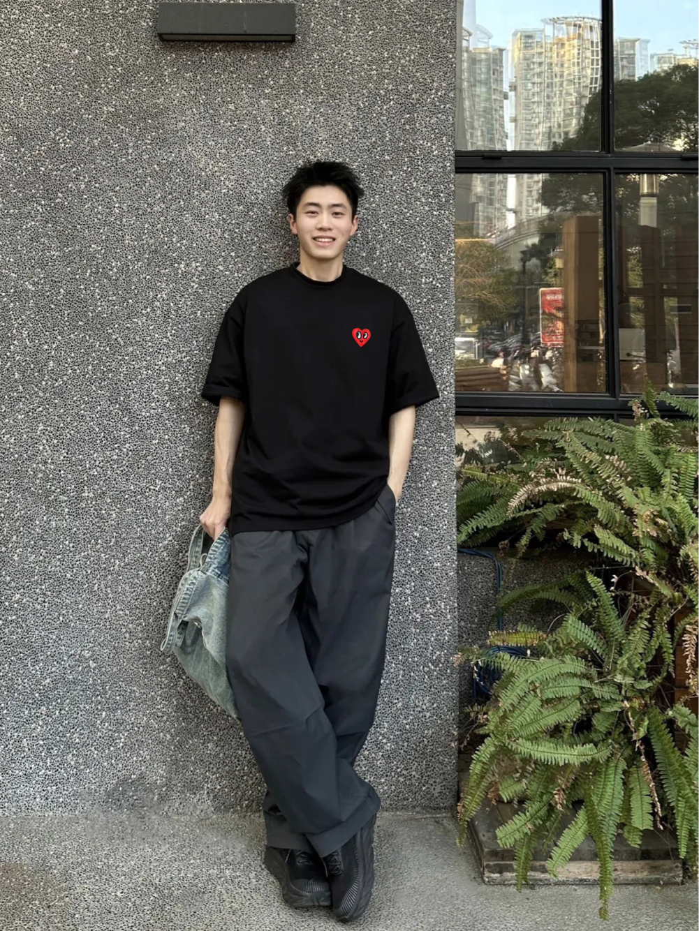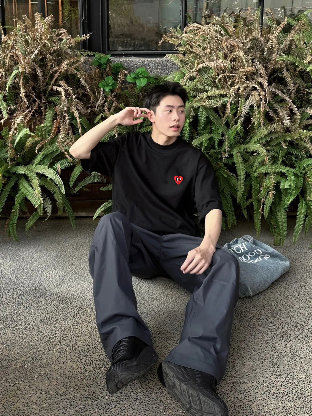 只要搭得好,同色系也可以很帅气,黑色短袖相信大家有不少,但这么特别的扑克牌印花应该是难得一见,版型做得宽松挺廓,上身就自带满满的氛围感,下身搭配一条黑灰色阔腿裤,在视觉上增加层次又很干净!是很好穿的一套