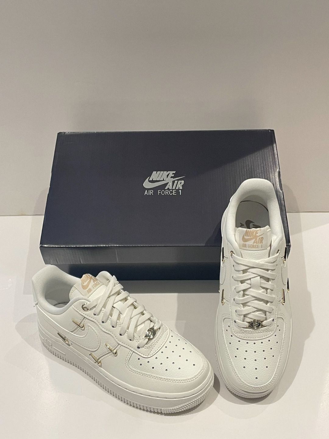 Nike Air Force 1 Low Mini Gold 白金 哈喽,宝子们大家好超百搭的AF1又出新配色啦,第一眼看到它就被它独特醒目的左右两边四个金光闪闪的四勾V吸引住了!没有那个女生能拒绝的吧!真的太好看了! 色:整体配色采用非常温柔色系的米白呈现,非常百搭,看上去奶呼呼的一眼就非常心动!左右鞋身四个小Logo十鞋头小金属标都采用金光闪闪的亮金色打造,非常时尚具有特色。 鞋面采用非常有质...