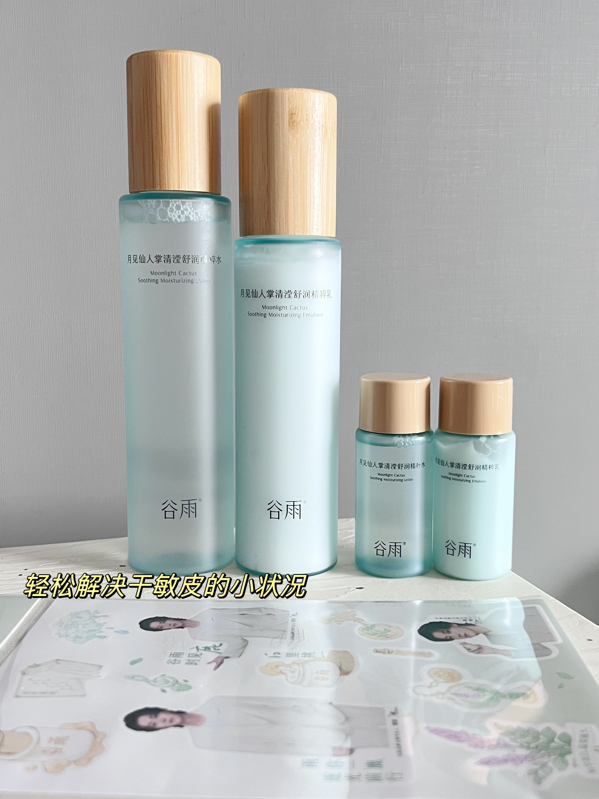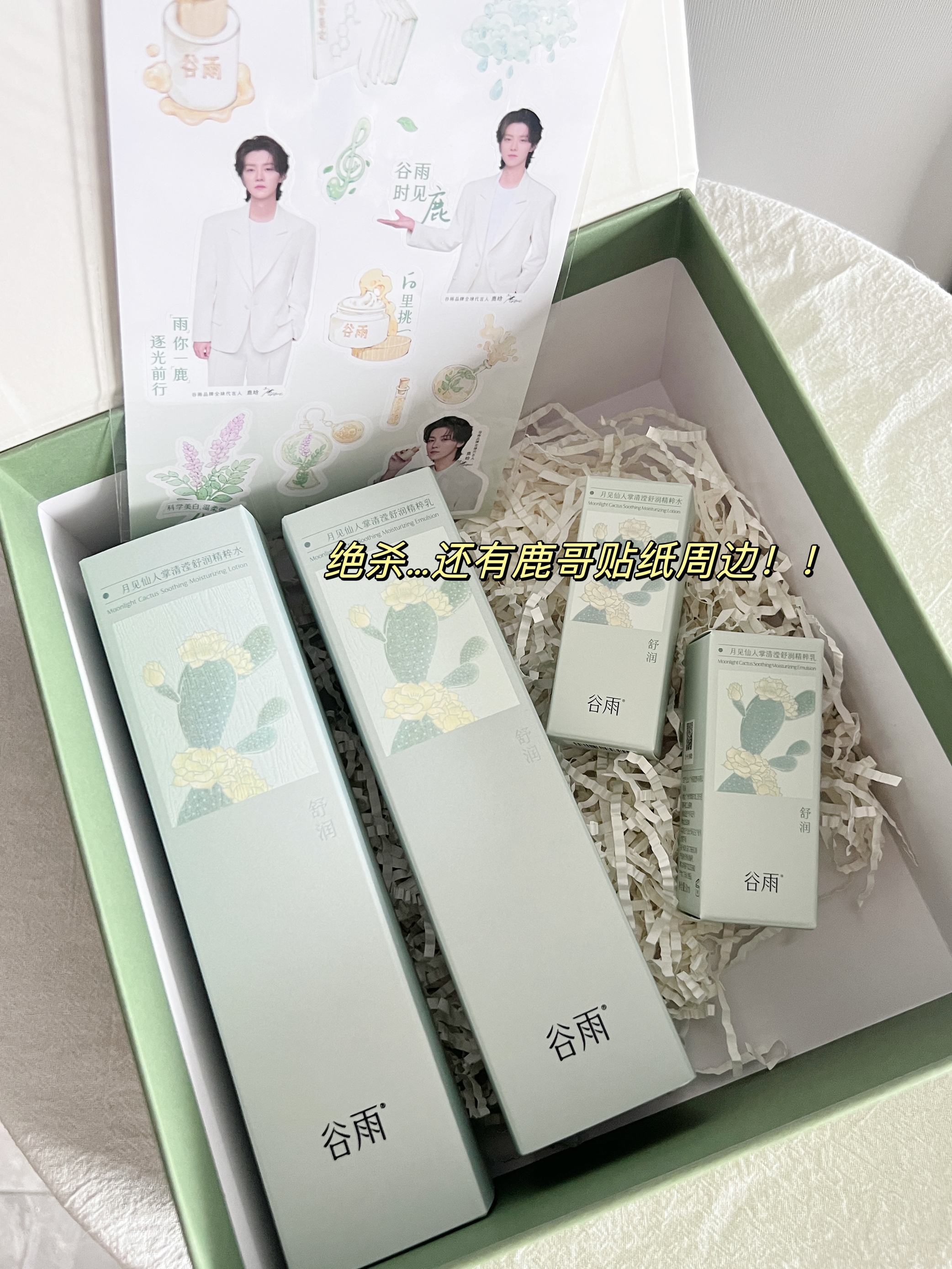 是谁!拥有了鹿哥同款护肤礼盒…是我!!哈哈哈 谷雨你到底怎么拿下鹿晗代言的啊!双厨狂喜啊~ 这次的新品仙人掌水乳也好好用啊~ 我是干皮,换季这个时候会有点敏感… 这个新品的出现也太及时了哈哈哈哈 我买的礼盒还有鹿晗的贴纸,谷雨我真的会爱你 水乳都还挺清爽的,干皮补水也不错,我敏感用过之后皮肤也蛮舒服的~好喜欢 而且味道也有点仙人掌的清香~酷 嘿嘿嘿嘿嘿