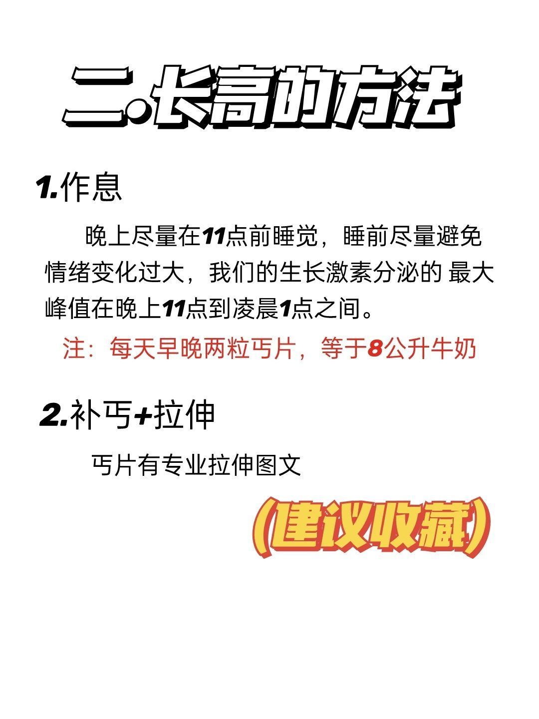 本人男21岁用两个月长高10CM 💟食物方面 多食用小麦胚芽、虾、鸡肉、猪腿肉、牛奶、豆类等富含氨基酸与蛋白质的食物。 少喝果汁、可乐、甜点等(因为这些食物糖分较高,极易影响钙质吸收,若是食用过多此类食物,容易影响骨骼发育) 📝最为重要的四大类; 1⃣️牛奶 牛奶中含有丰富的矿物质钙、磷、铁、锌、铜、锰、钼。最难得的是,牛奶是人体钙的最佳来源,而且钙磷比例非常适当,利于钙的吸收,可以非...
