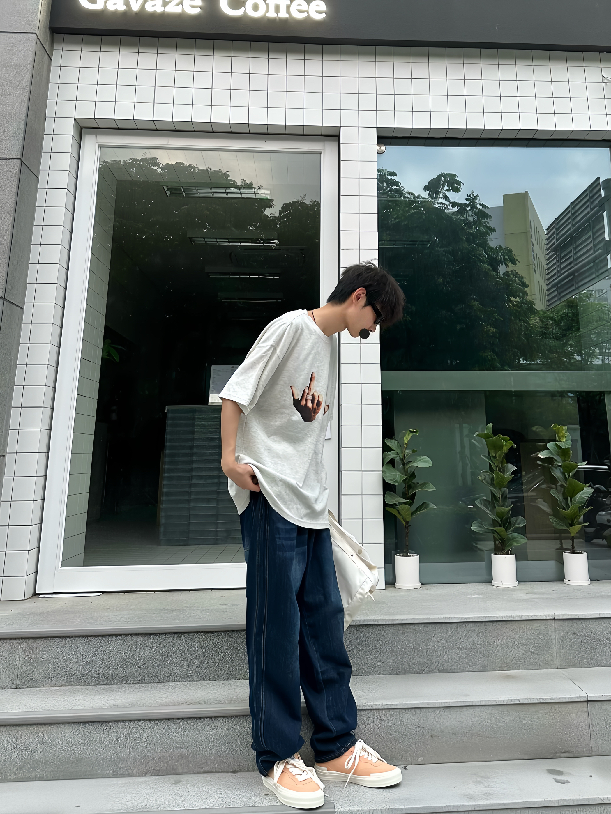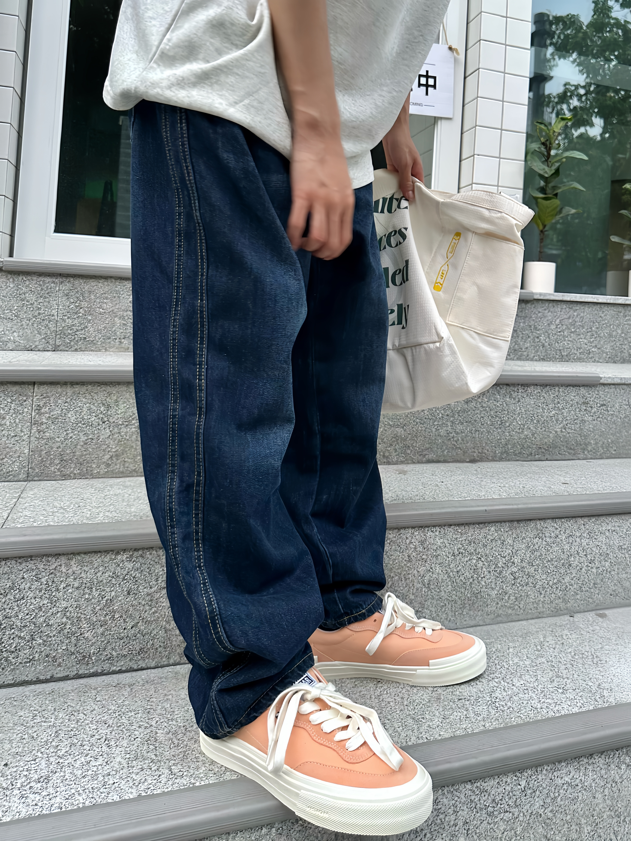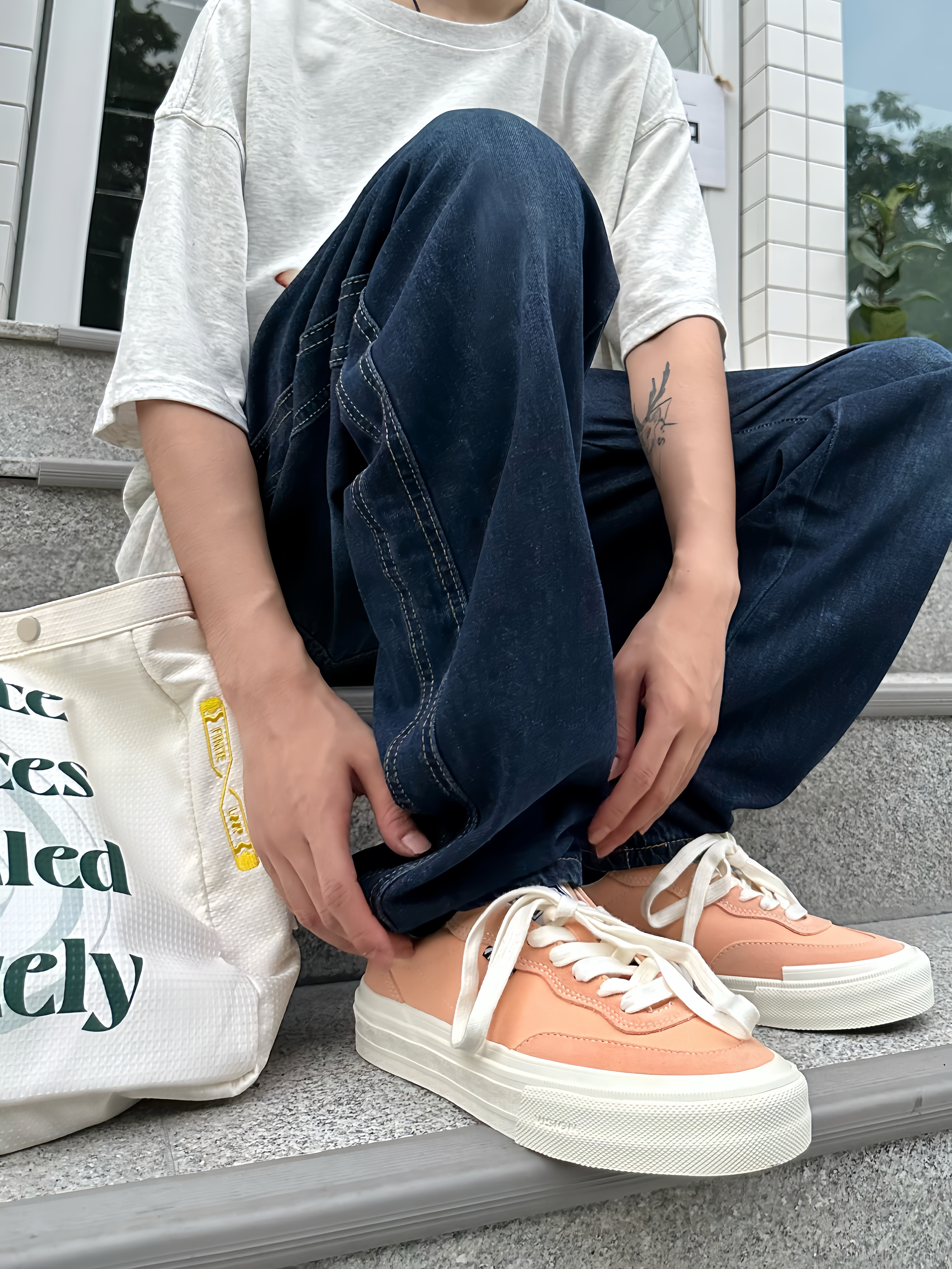 哈喽!这里是于老板的穿搭分享! 这样穿真的很夏天!一件浅灰色的恶搞T恤搭配一条适合夏天的透气牛仔裤👖穿在身上比较舒服~ 这种经典牛仔裤也比较好搭配各种板鞋 👟,就像我今天搭配的这双桃子🍑配色的滑板🛹鞋 就比较有调性 ,很适合小情侣穿👩🏻❤️👨🏻~ 👖: Jeep 👟 vision street wear 👔: ICONSLAB