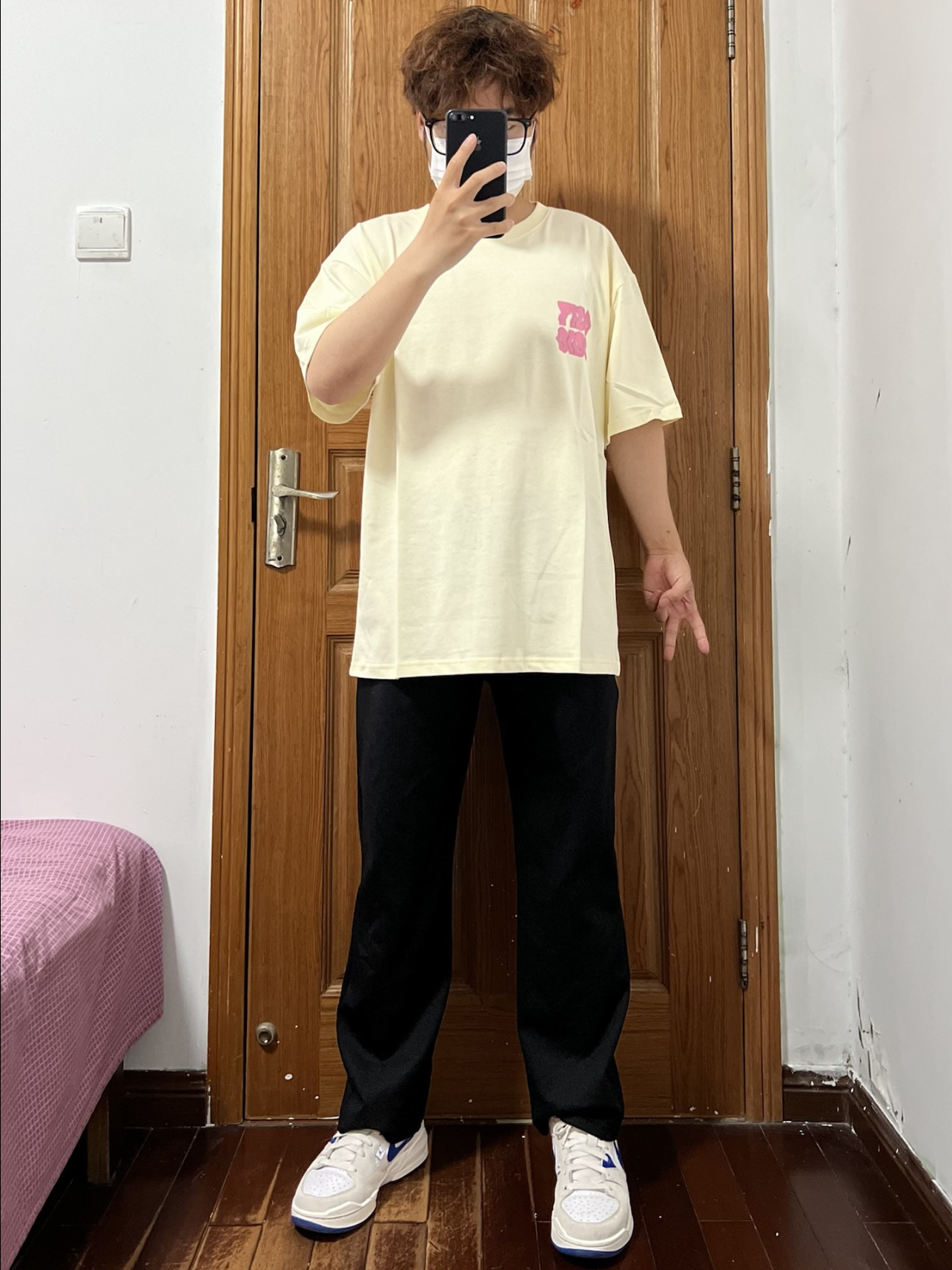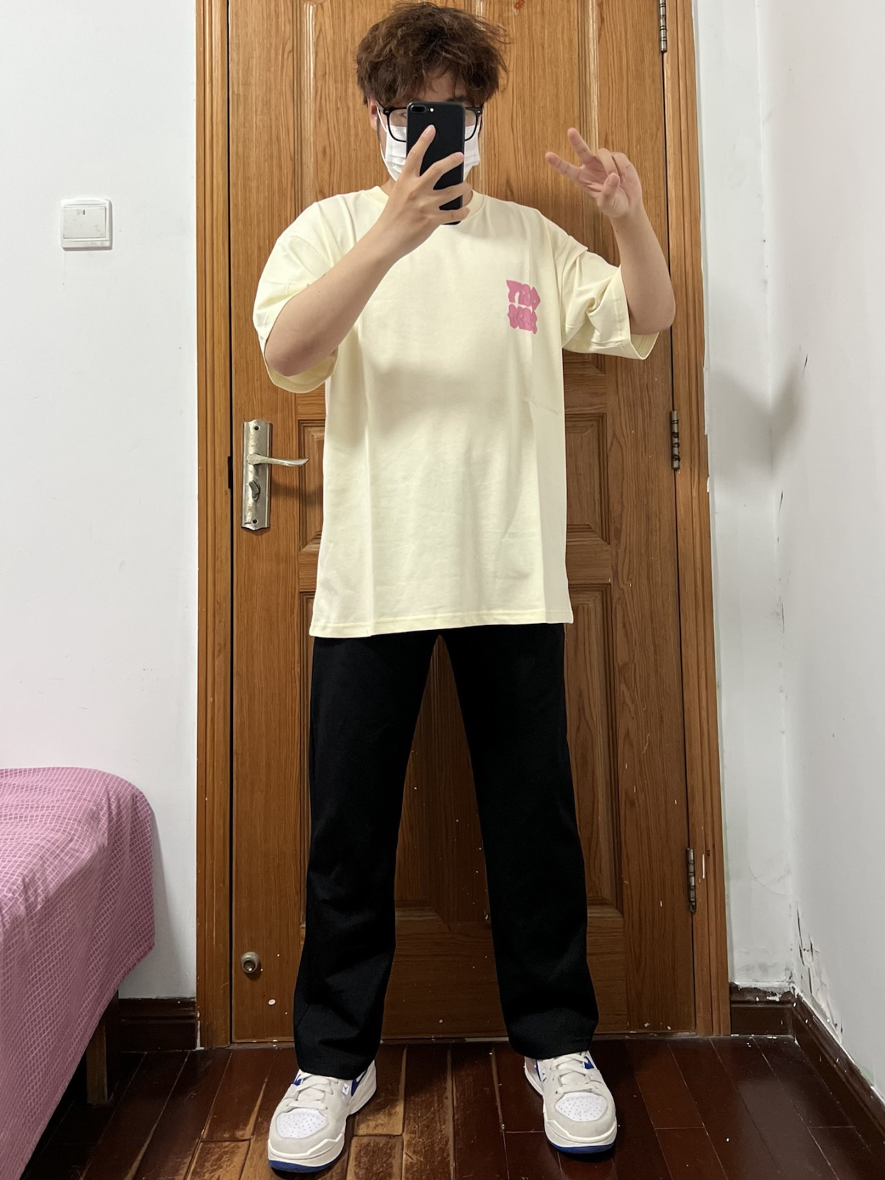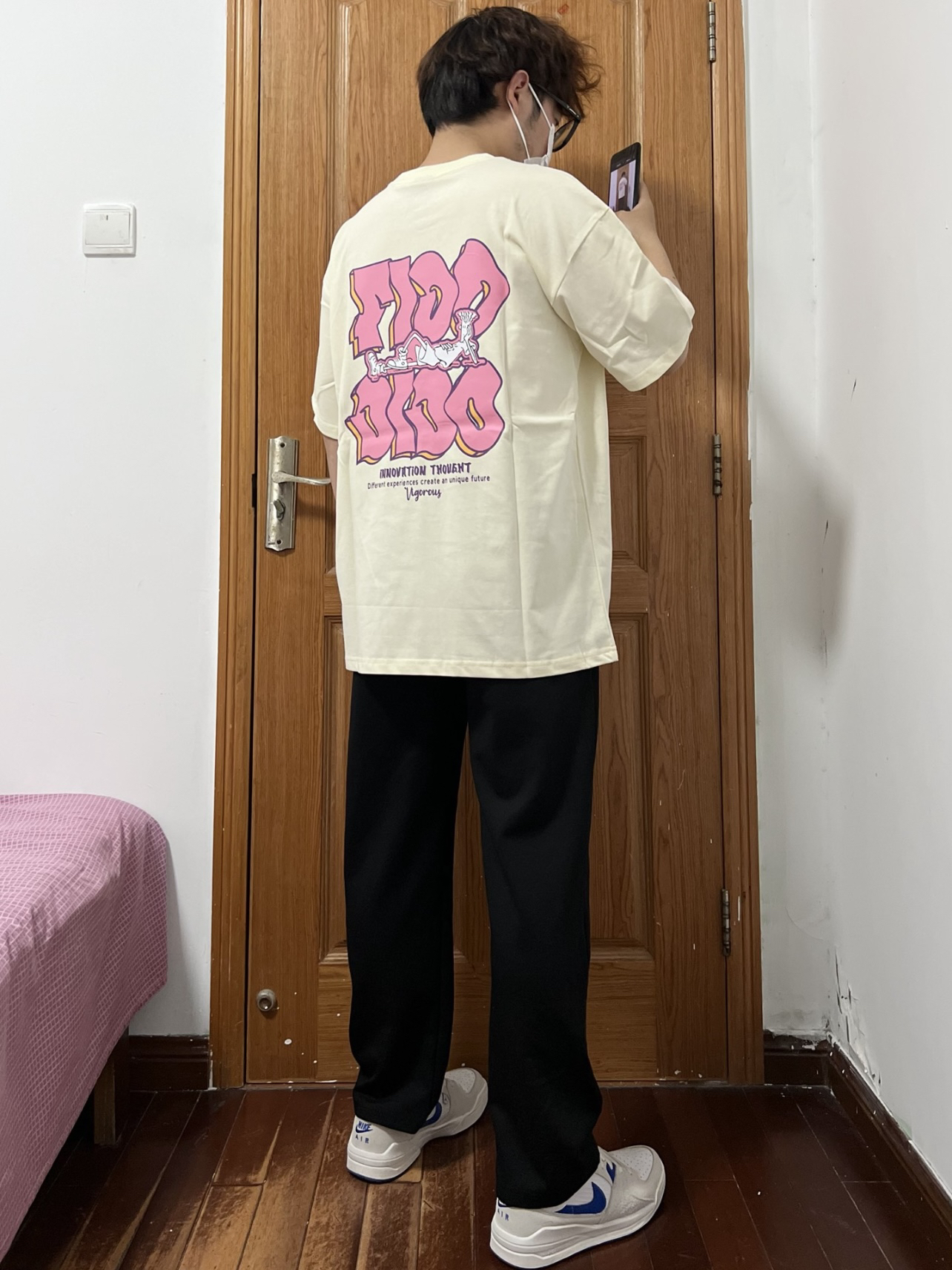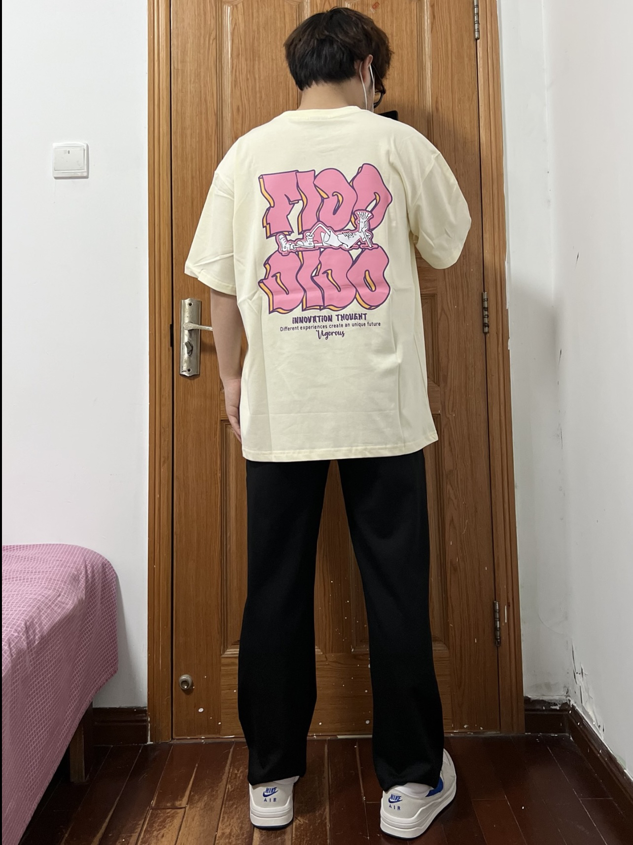 今日份穿搭分享🎉 FIDO DIDO 扭曲字母Logo印花短袖 正面是简单的logo印花背后超大扭曲印花 杏色与粉色的碰撞非常好看呢❗️ 版型略宽松是属于夏天的短袖 杏色也非常的亮眼好搭配衣服没得说 是属于那种谁穿谁好看谁帅气的那种 搭配一条黑色长裤和蓝色Nike绝了 👔 FIDO DIDO 👖 黑色长裤 👟 Nike 🙋♂️ 170/120斤 XL 持续带来最真实的穿搭体验和球鞋开箱 喜欢...
