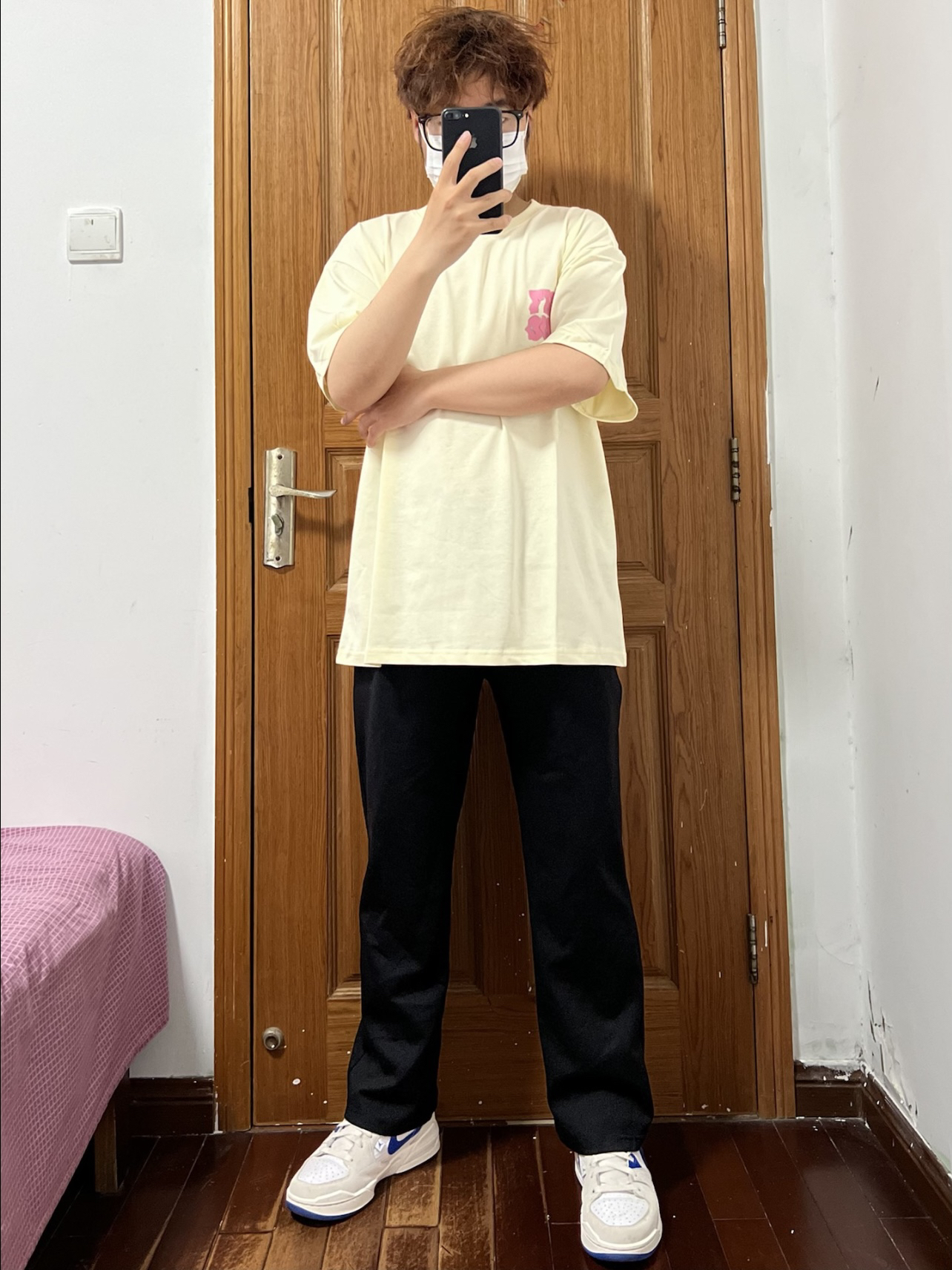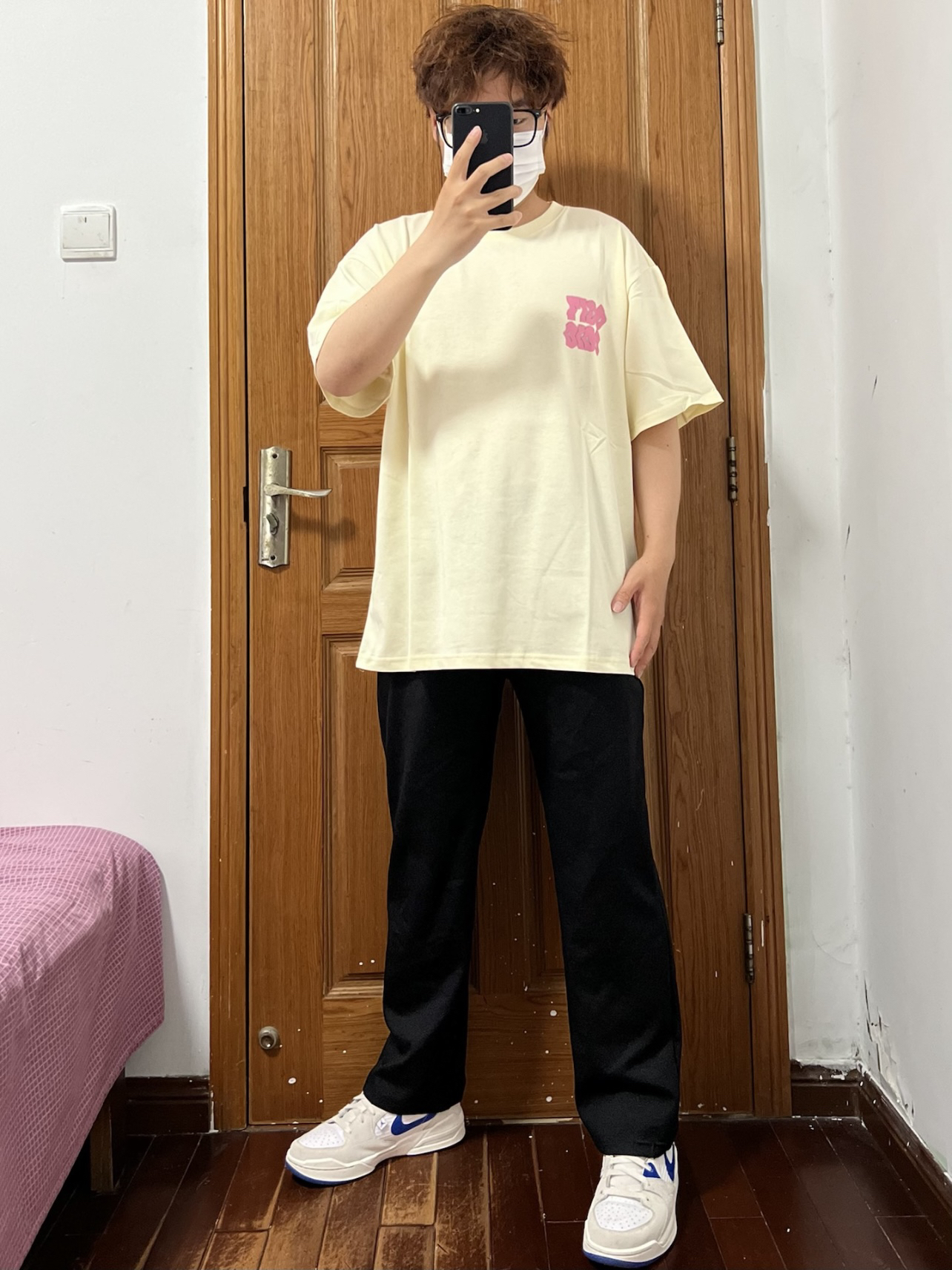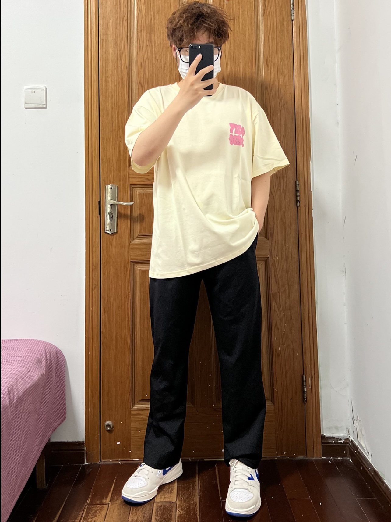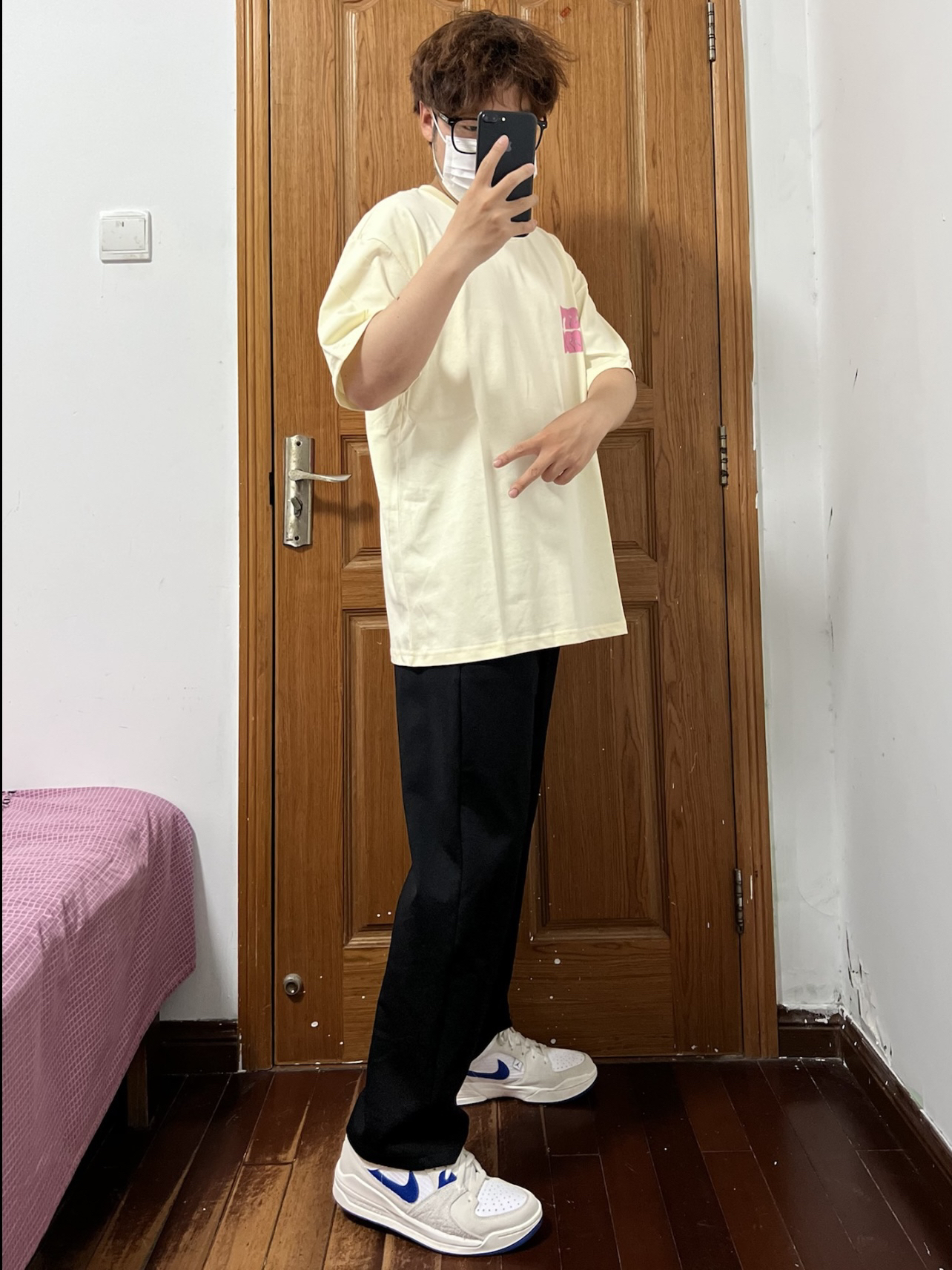 今日份穿搭分享🎉 FIDO DIDO 扭曲字母Logo印花短袖 正面是简单的logo印花背后超大扭曲印花 杏色与粉色的碰撞非常好看呢❗️ 版型略宽松是属于夏天的短袖 杏色也非常的亮眼好搭配衣服没得说 是属于那种谁穿谁好看谁帅气的那种 搭配一条黑色长裤和蓝色Nike绝了 👔 FIDO DIDO 👖 黑色长裤 👟 Nike 🙋♂️ 170/120斤 XL 持续带来最真实的穿搭体验和球鞋开箱 喜欢...