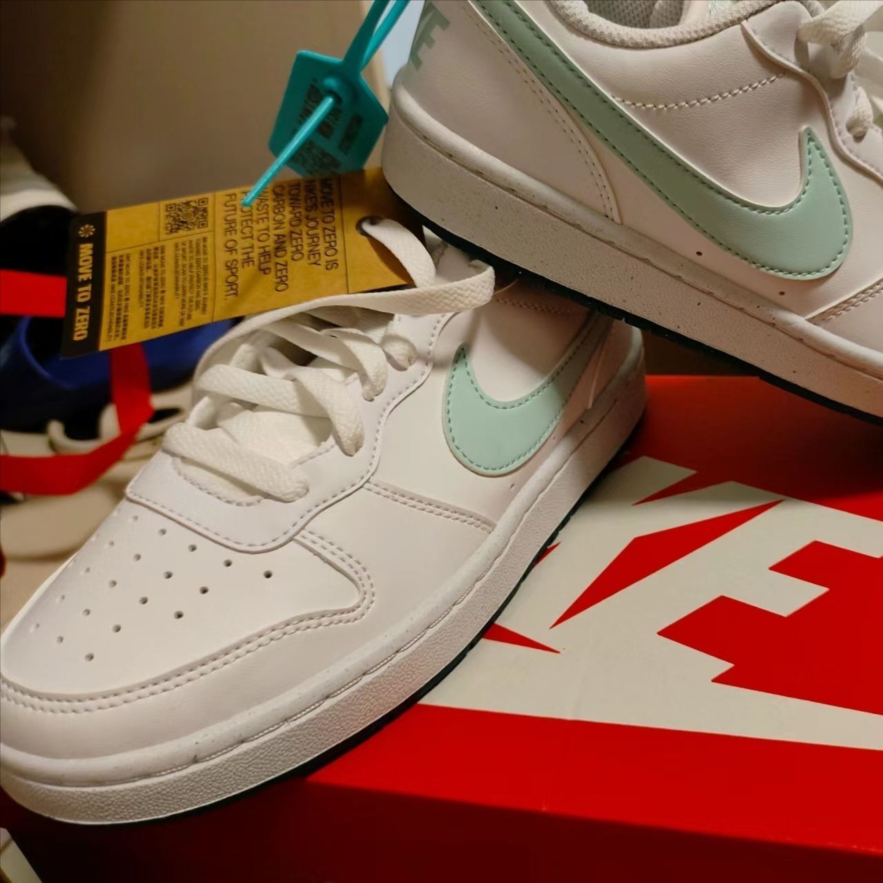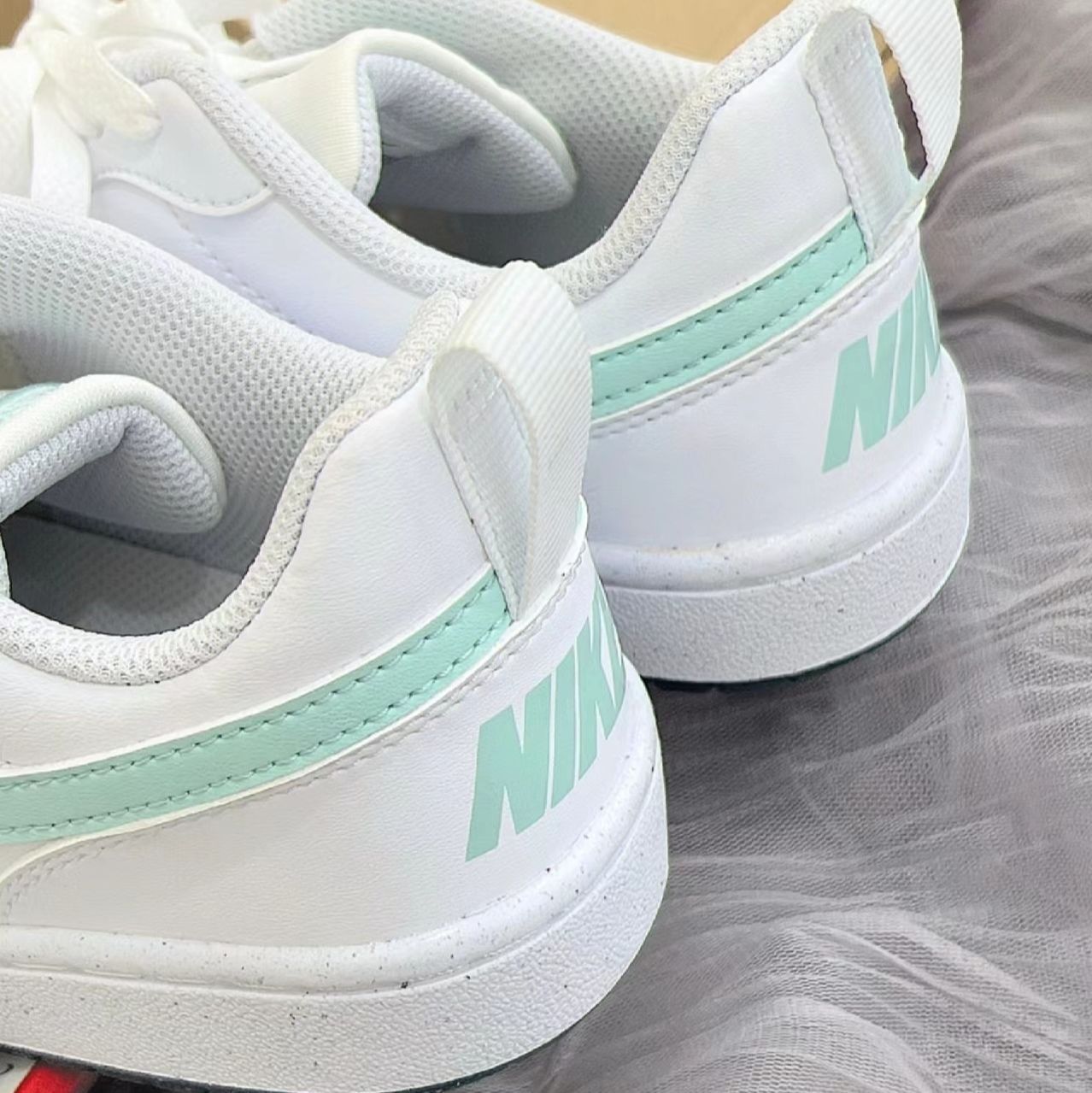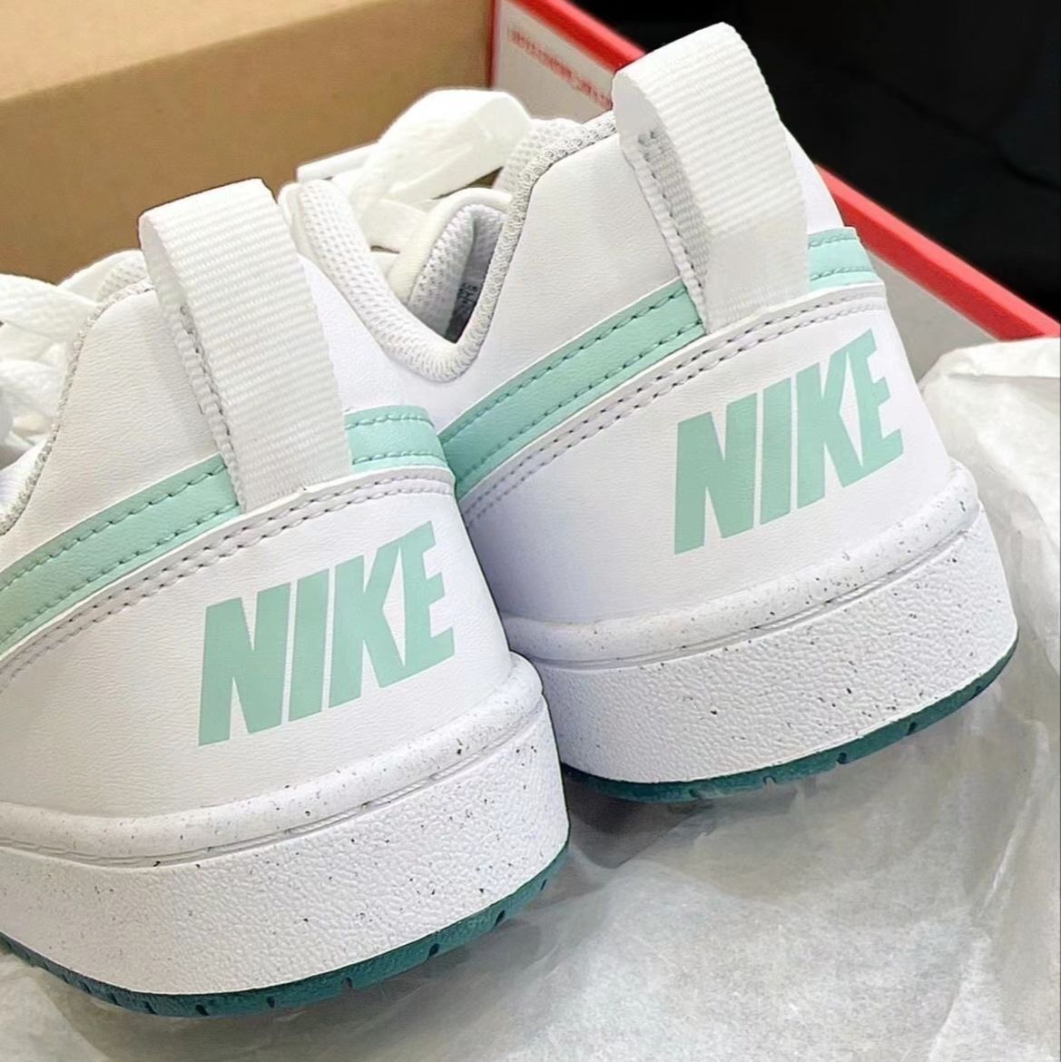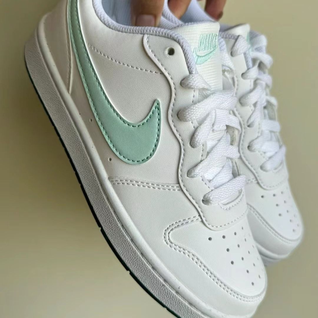 白绿配色尽显青春活力#NikeCourt白蓝绿Nike这双板鞋虽然采用合成革材料但是皮质手感还是比较细腻柔和的 court鞋型非常非常显脚小在视觉上呈现出腿部的细长 刷漆工艺以及鞋舌处的刺绣增加了鞋子的层次感 但是小小缺点这个鞋子偏硬同时雨天湿滑路面体验感欠佳 总体上无论是颜值还是性价比这双Nike Court Borough Low2在同价位鞋子比较中还是值得购买的