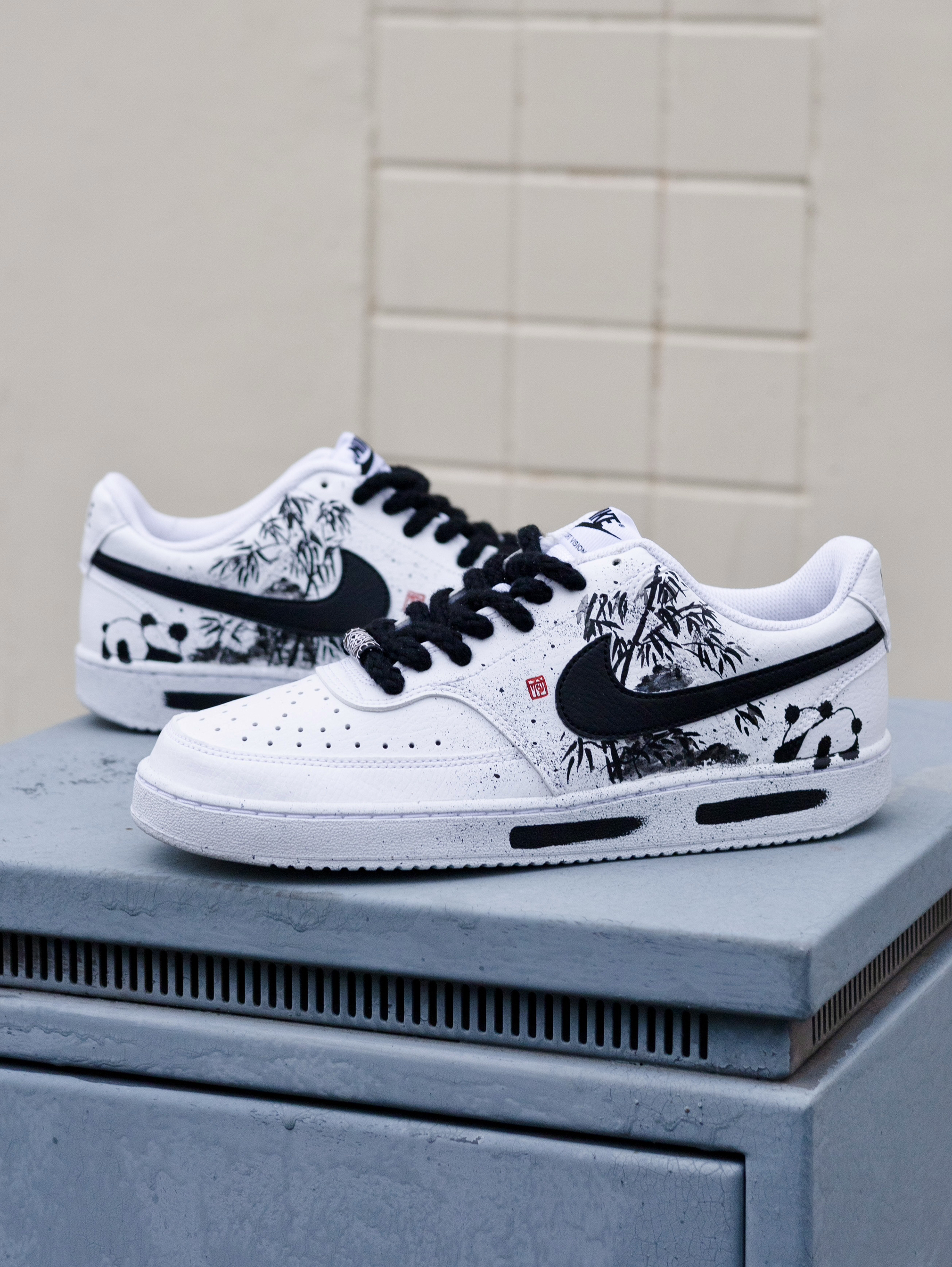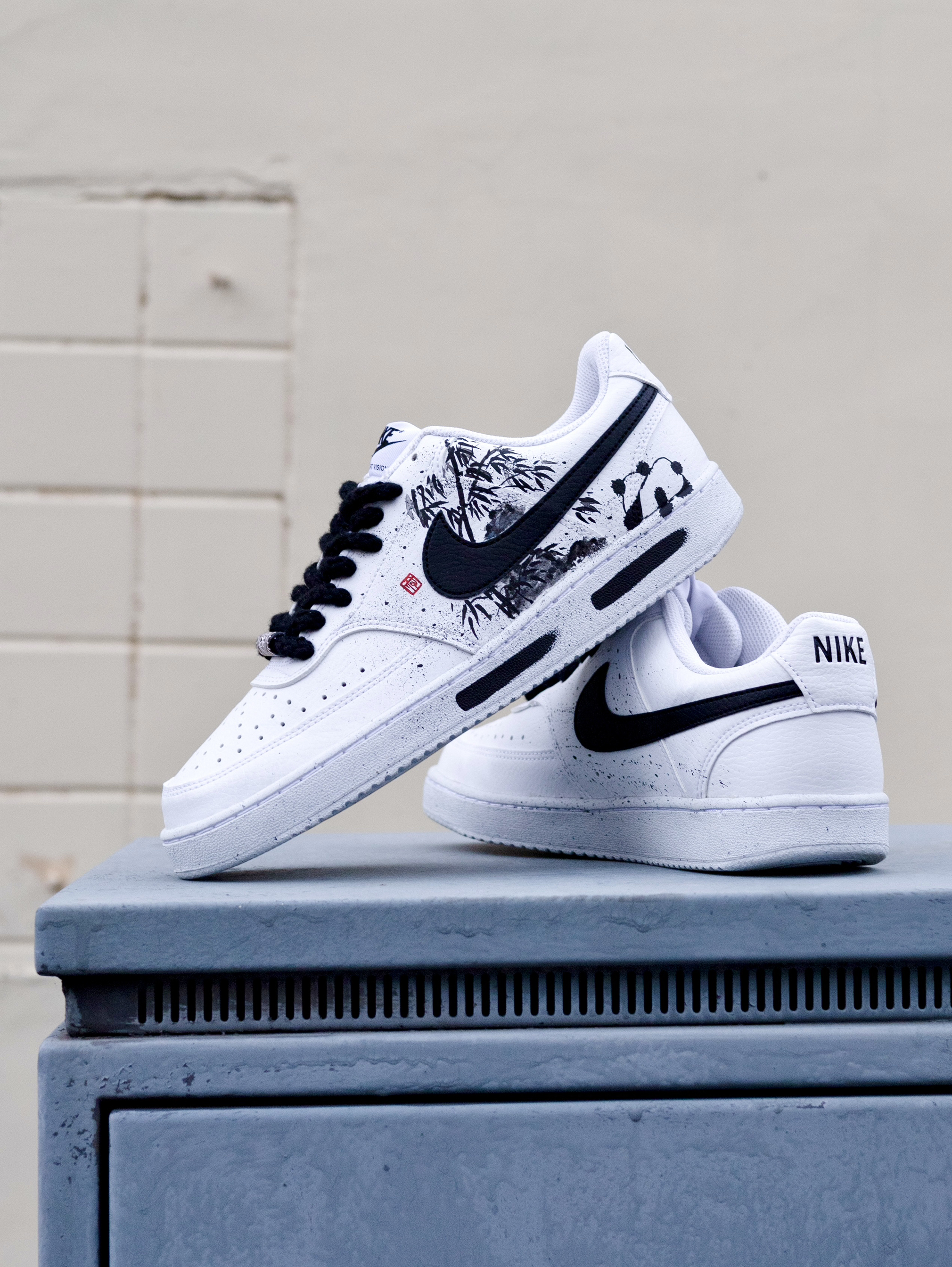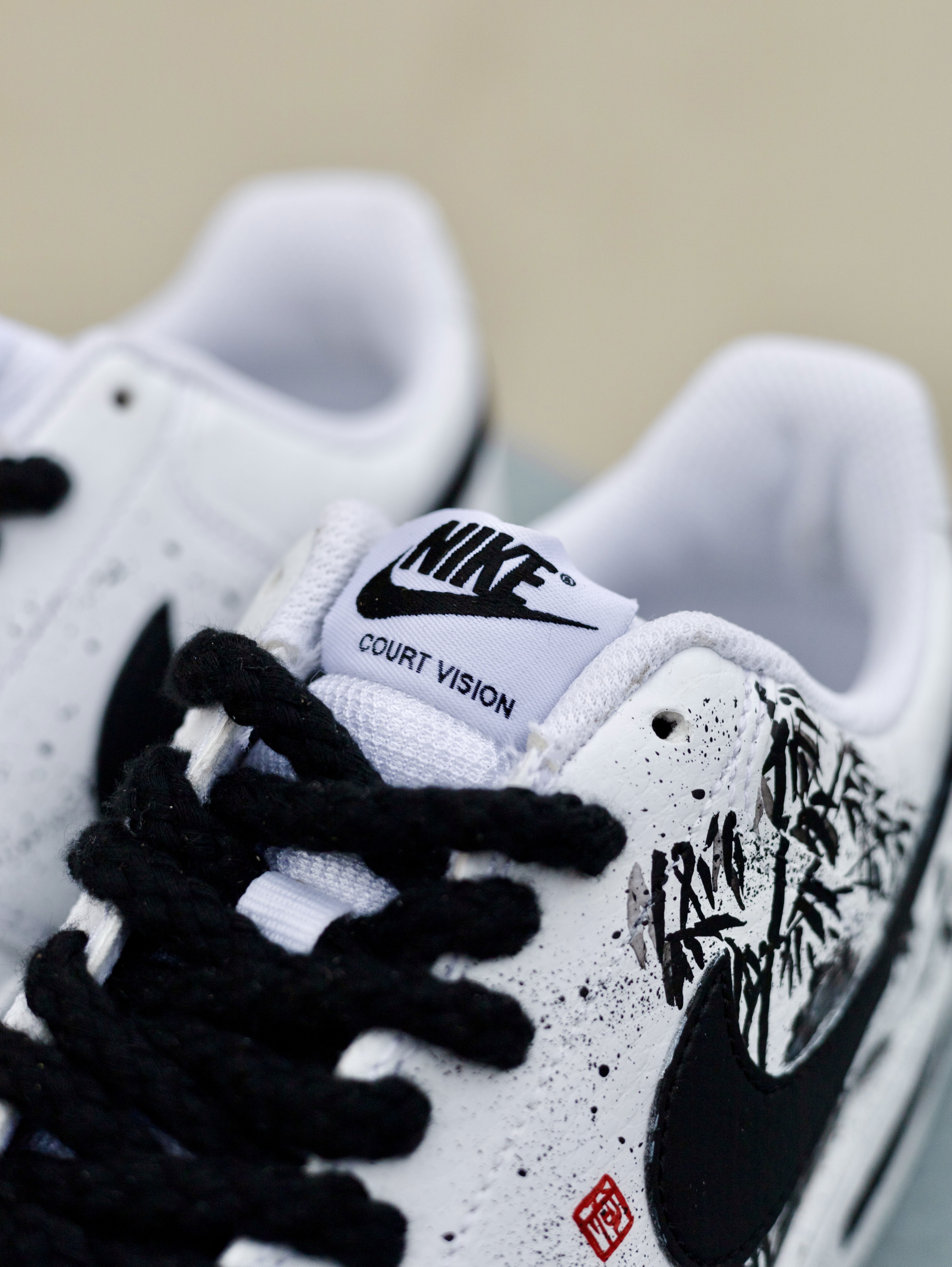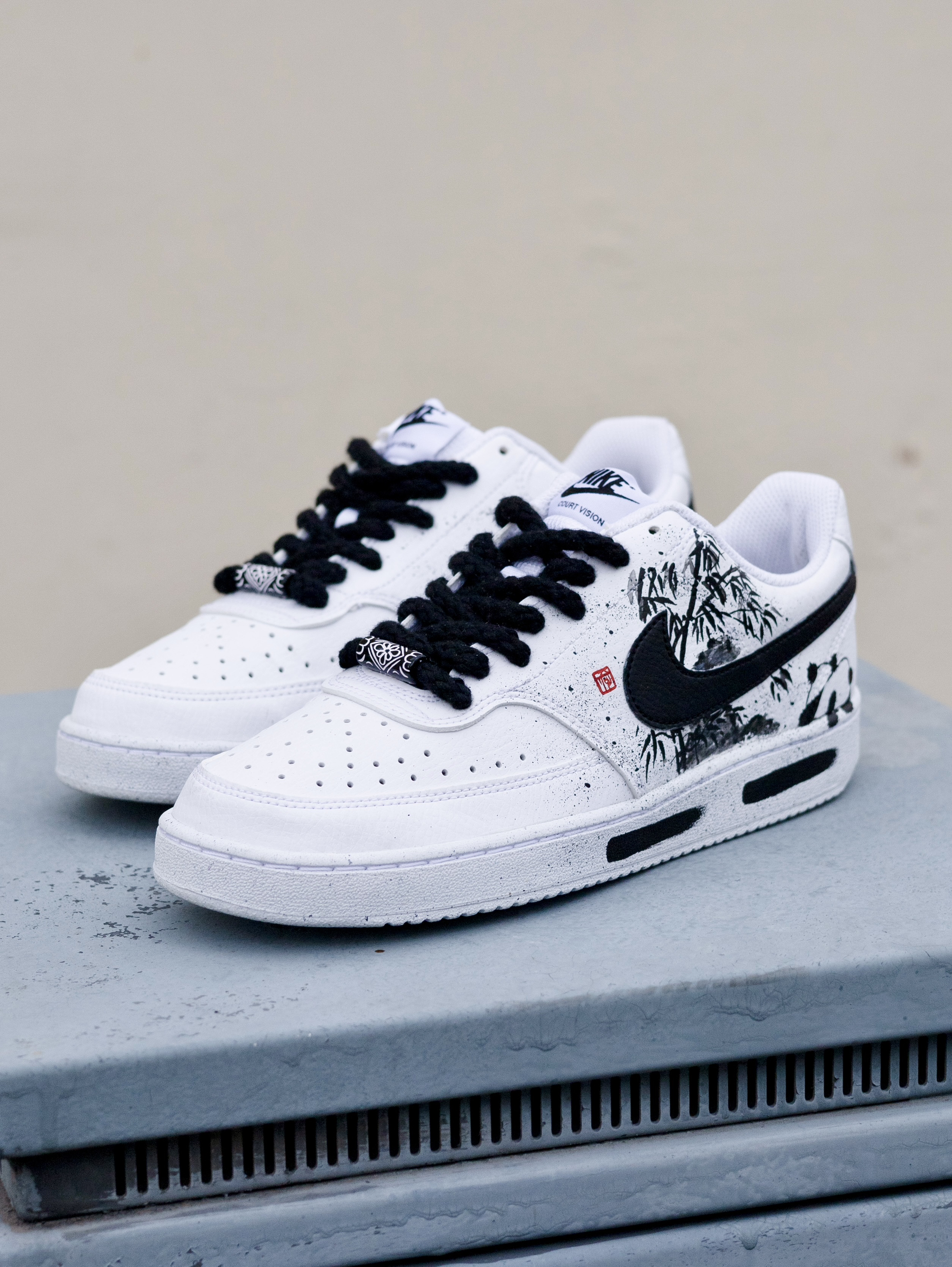 今天给大家分享这双很有国风味道的 Nike Court Vision熊猫🐼竹子水墨『黑白』👟 鞋款大面积由白色荔枝纹路皮革覆盖 鞋头密集的透气孔保证了较好的透气性 鞋尾外侧呈现有『熊猫🐼竹子』的水墨画涂鸦 白色的中底和同色多纹路的橡胶大底收尾 鞋带方面使用了一副黑色麻绳鞋带搭配天珠 整体来说这是一双兼具颜值/设计的定制板鞋👟 细节到位 百搭耐看 适合日常休闲或通勤 ⚠️尺码方面建议选择正码 脚感偏...