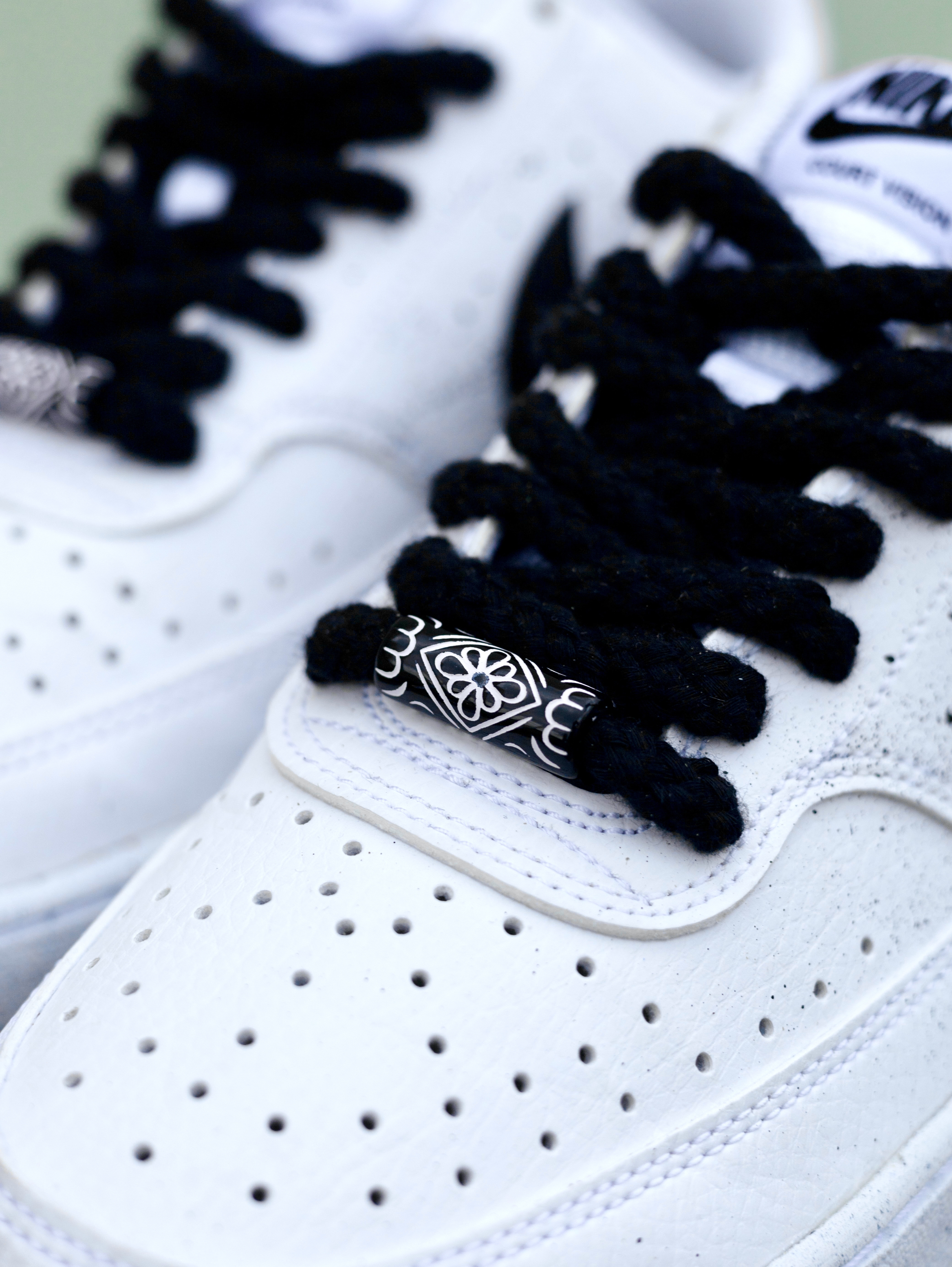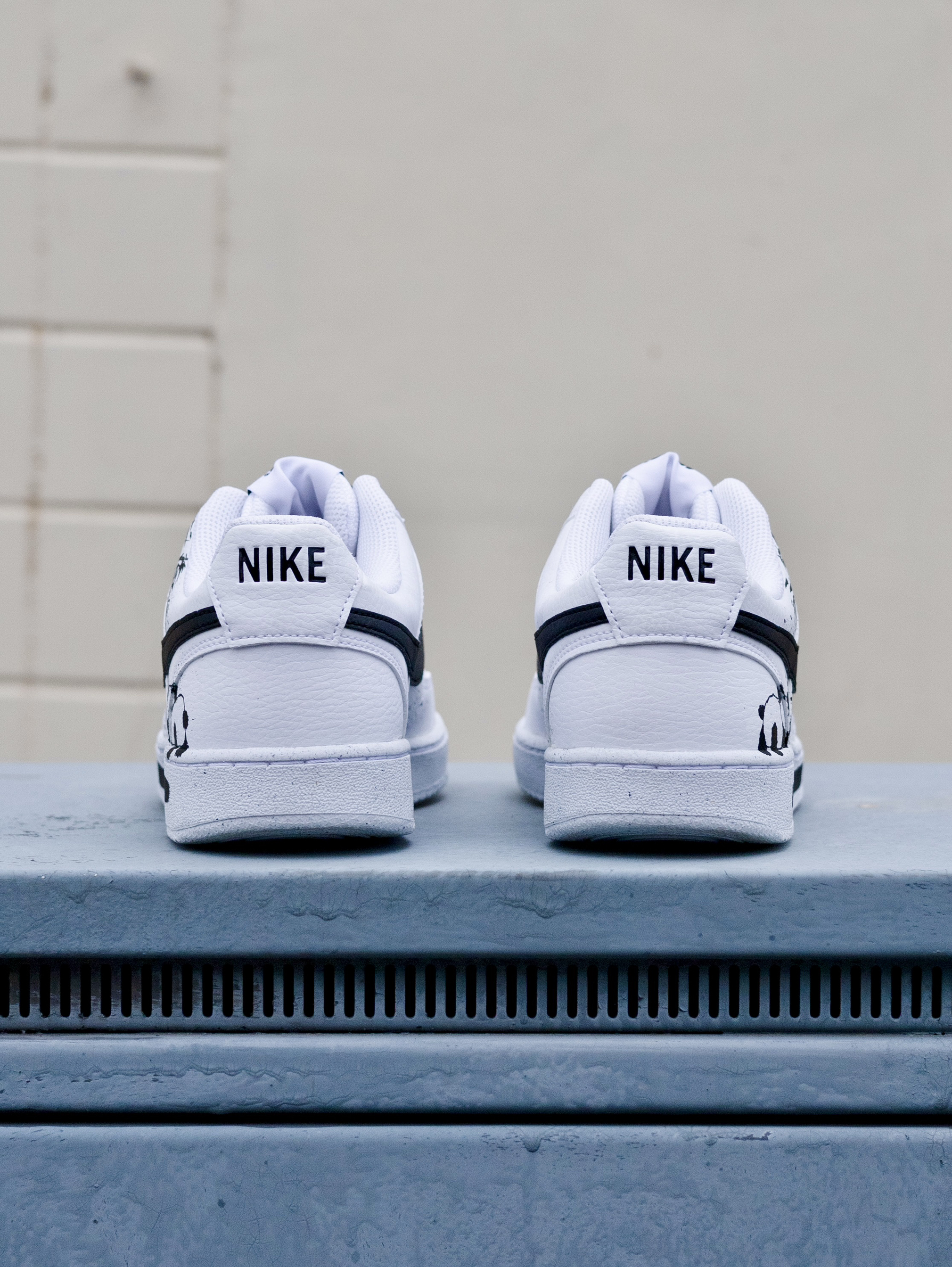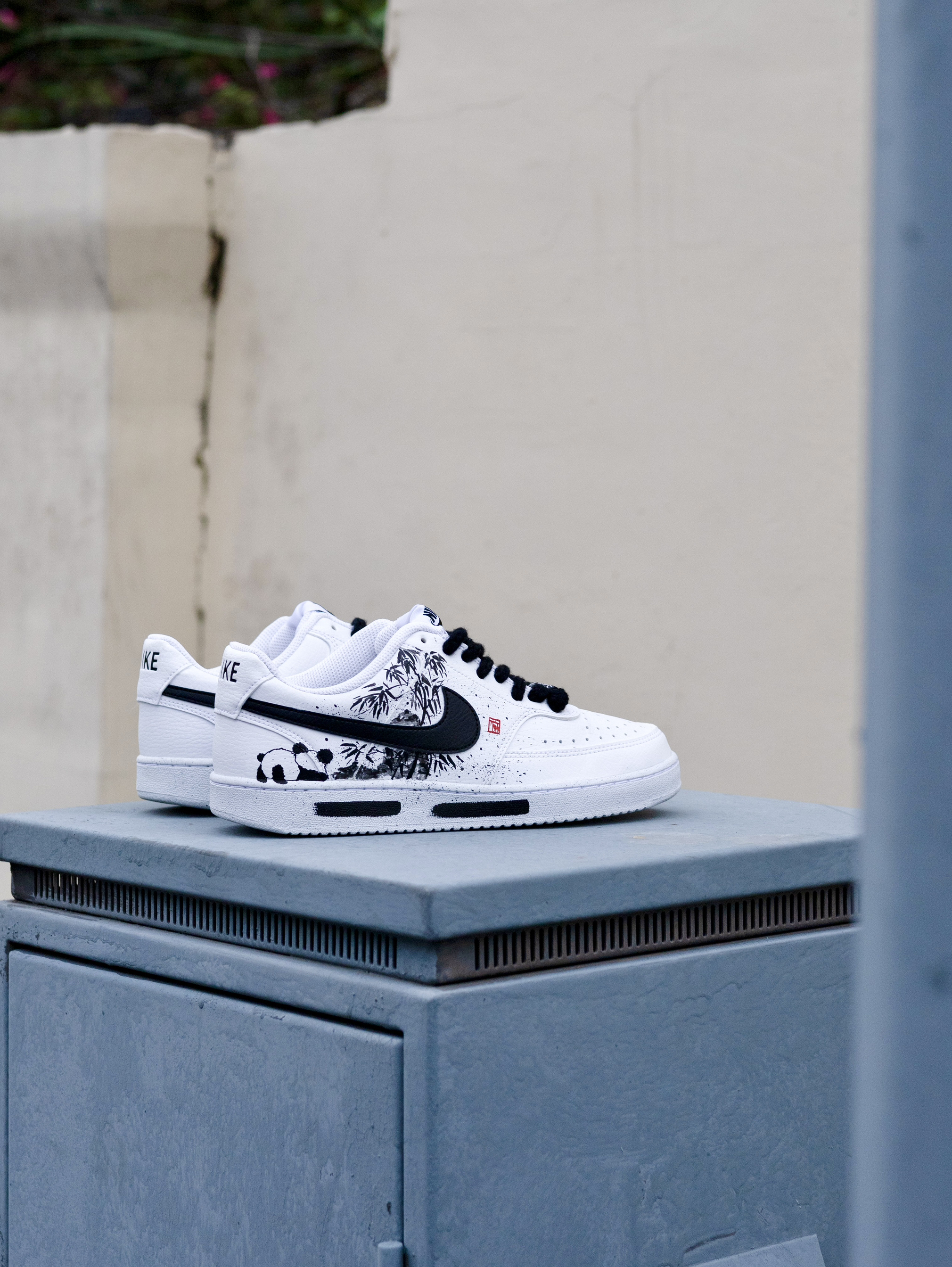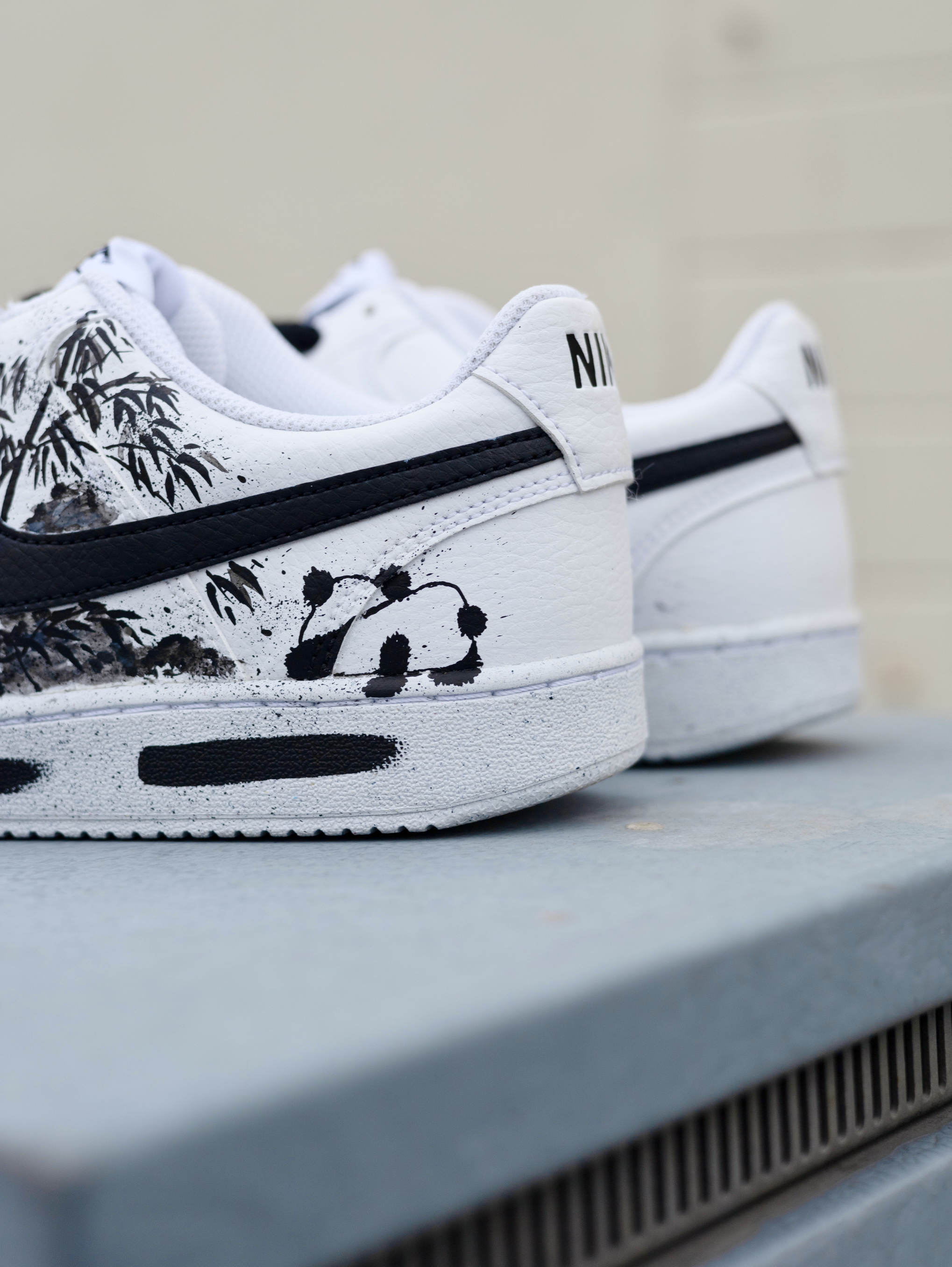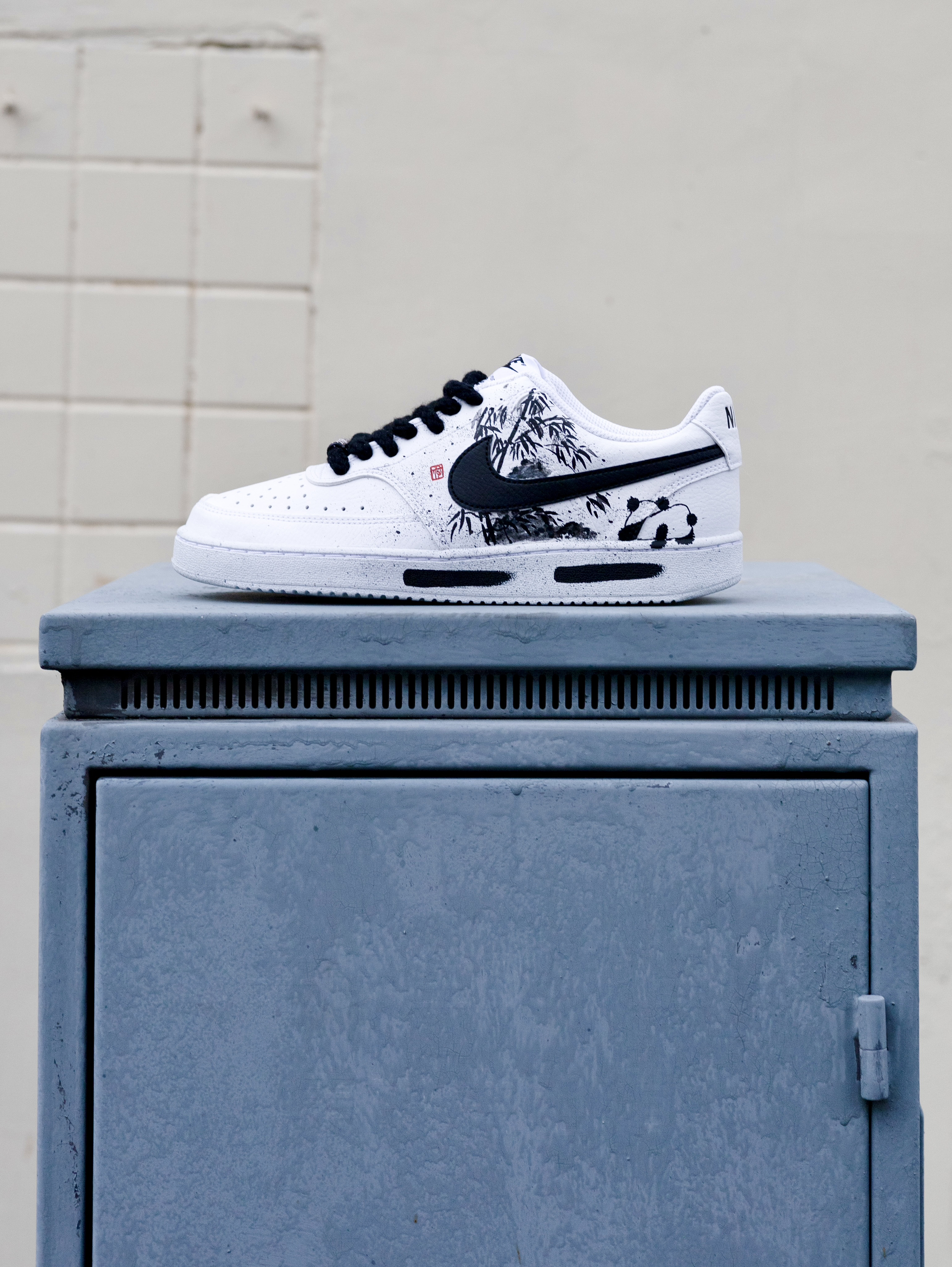 今天给大家分享这双很有国风味道的 Nike Court Vision熊猫🐼竹子水墨『黑白』👟 鞋款大面积由白色荔枝纹路皮革覆盖 鞋头密集的透气孔保证了较好的透气性 鞋尾外侧呈现有『熊猫🐼竹子』的水墨画涂鸦 白色的中底和同色多纹路的橡胶大底收尾 鞋带方面使用了一副黑色麻绳鞋带搭配天珠 整体来说这是一双兼具颜值/设计的定制板鞋👟 细节到位 百搭耐看 适合日常休闲或通勤 ⚠️尺码方面建议选择正码 脚感偏...