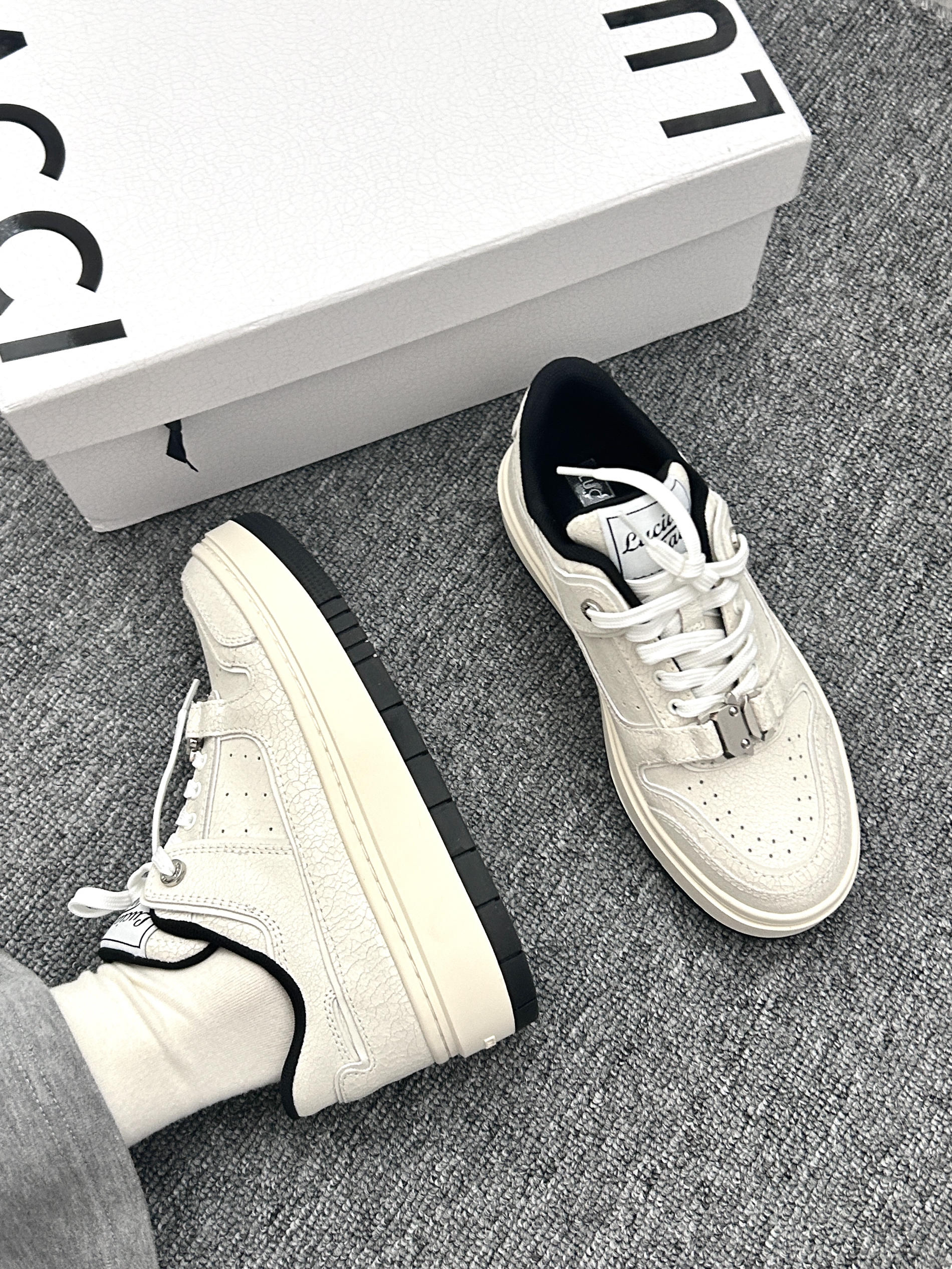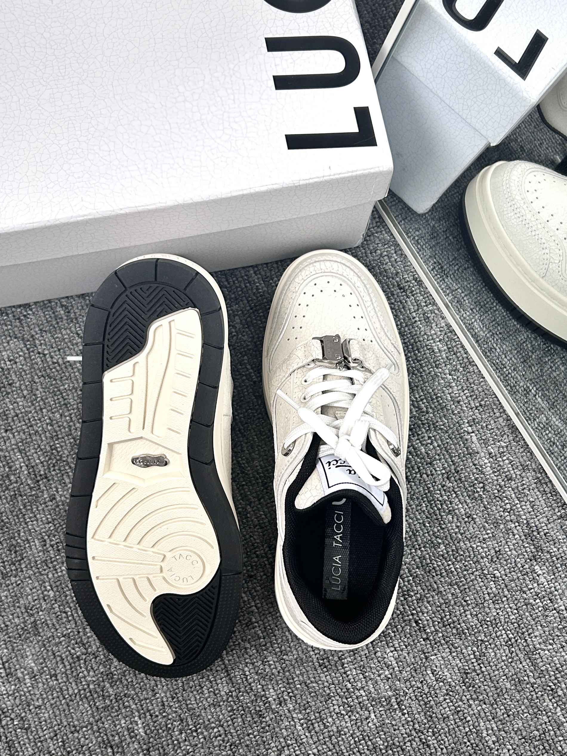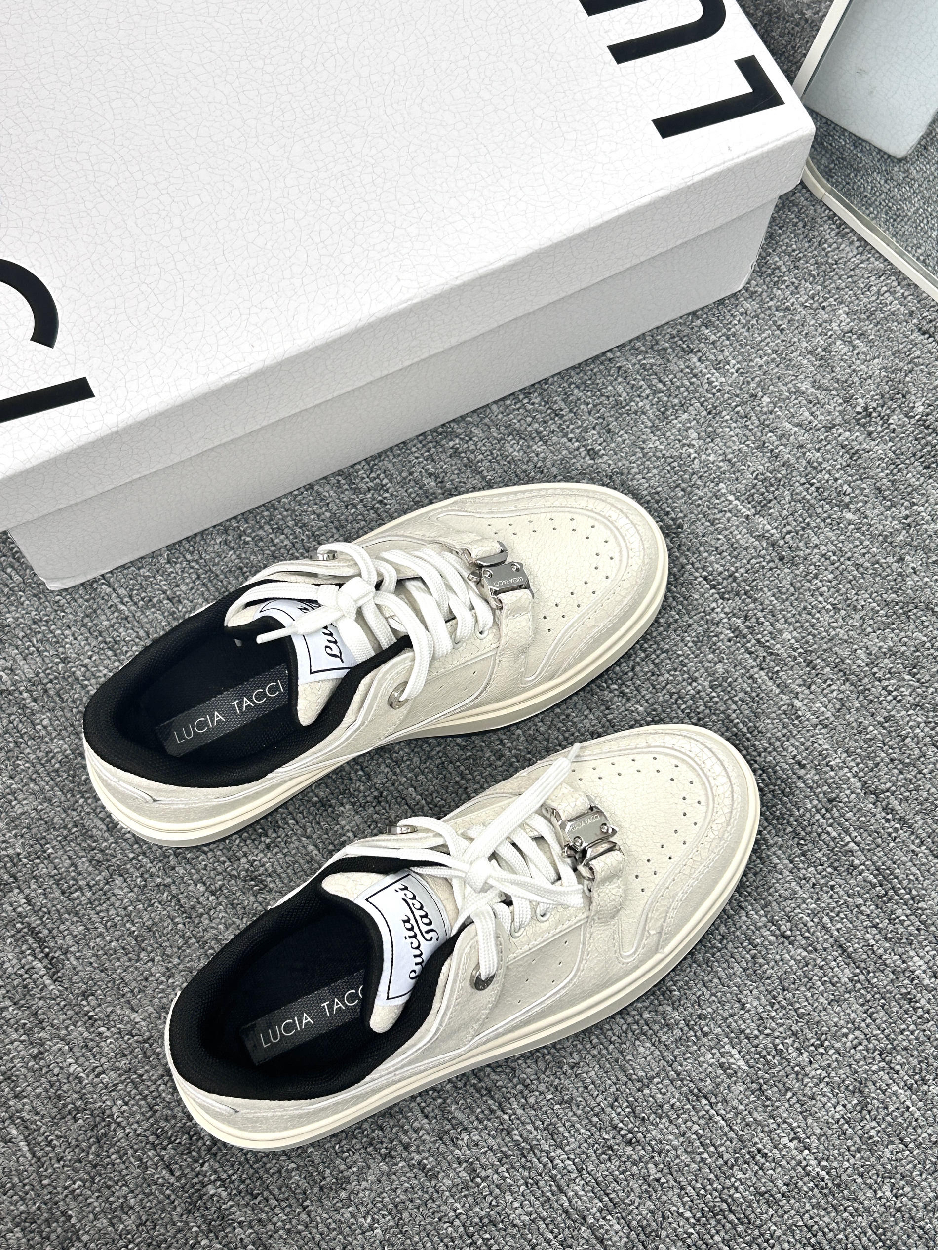 不愧是小众设计品牌啊!Lucia Tacci这双爆裂纹牛皮小白鞋上脚尊嘟好好看! 是板鞋的鞋型 4厘米厚度的鞋底 不仅仅穿上显高 搭配起来莫名的大牌感 爆裂纹牛皮的鞋面好有设计感 这种材质的实物尊嘟好有质感好好看 搭配短装、牛仔裤或者休闲裤都很有feel!这个夏天的搭配就靠它了