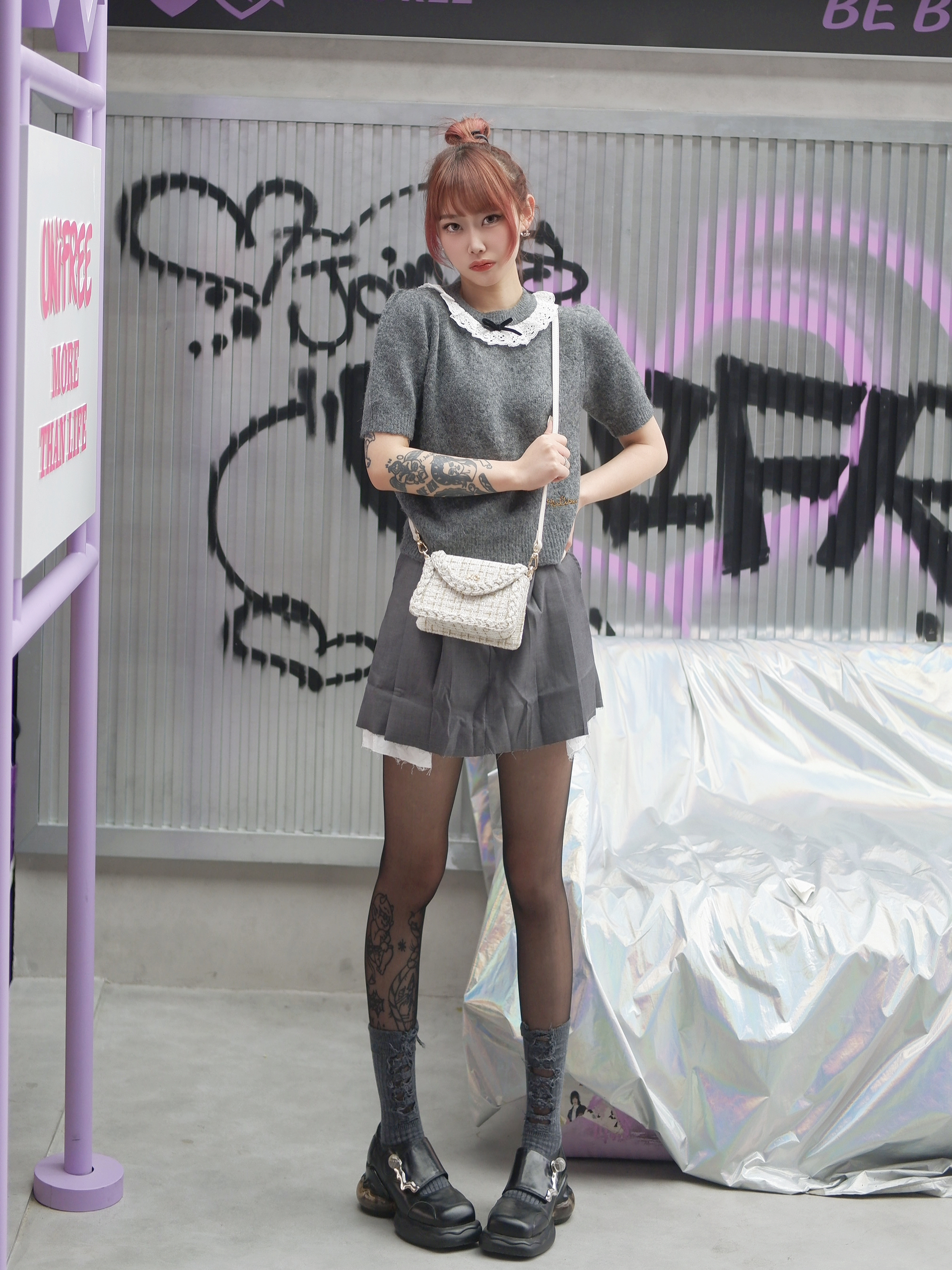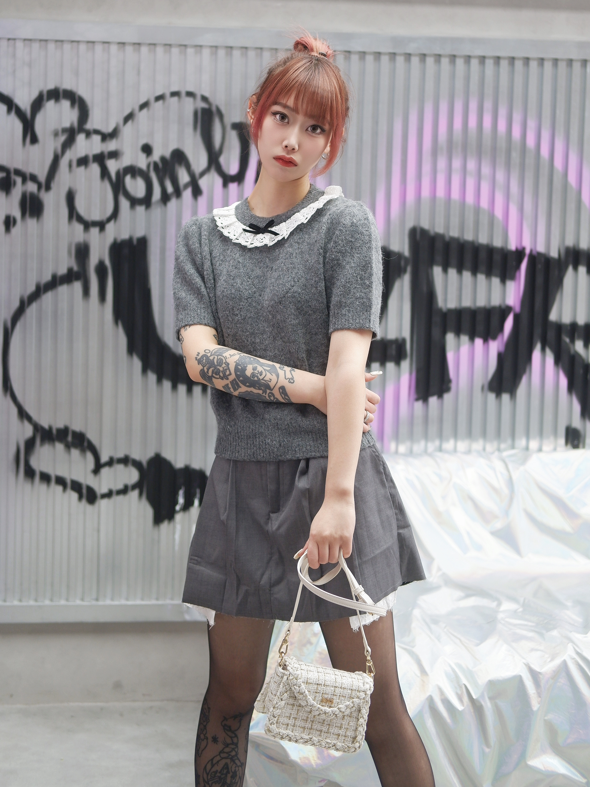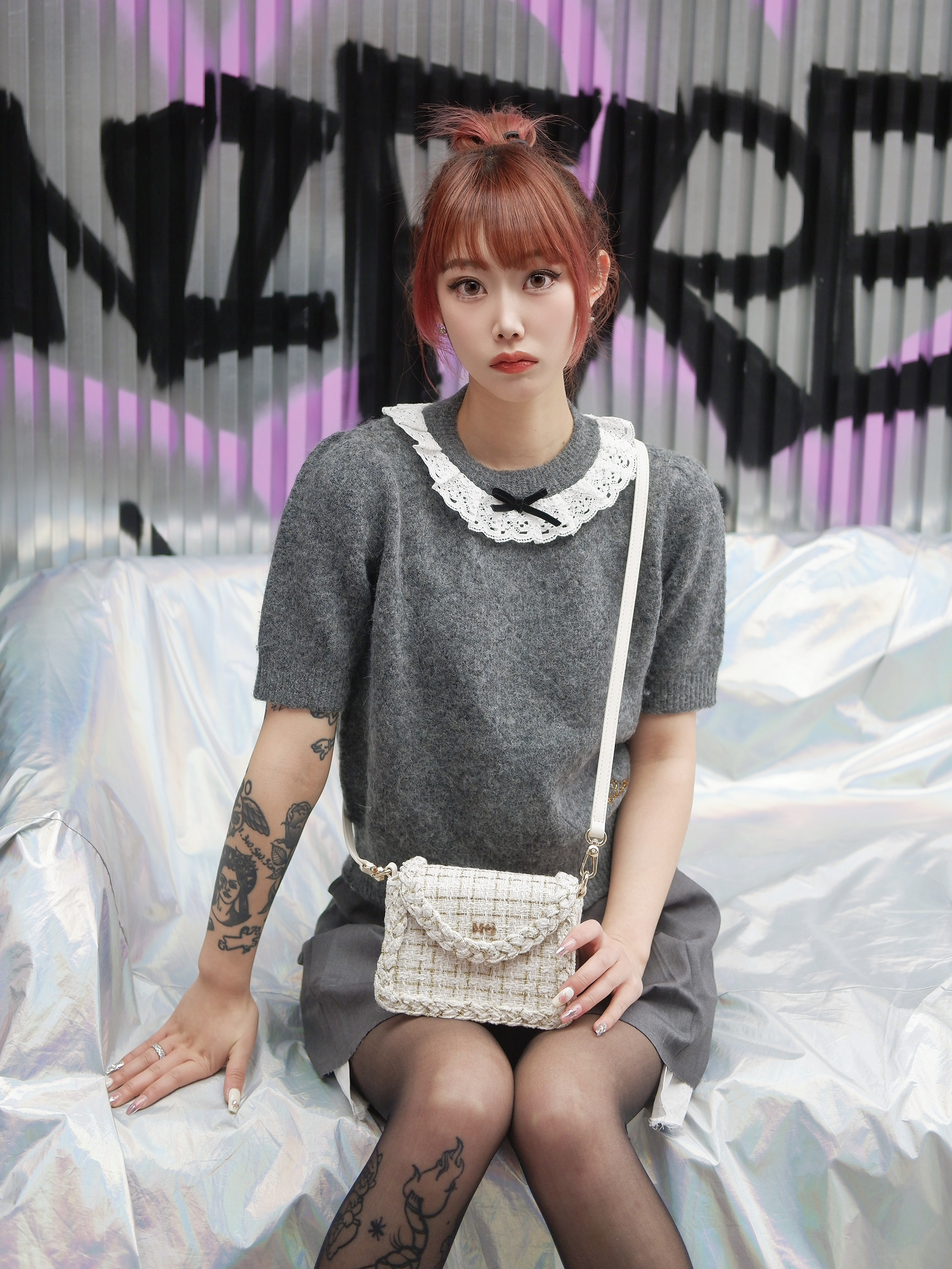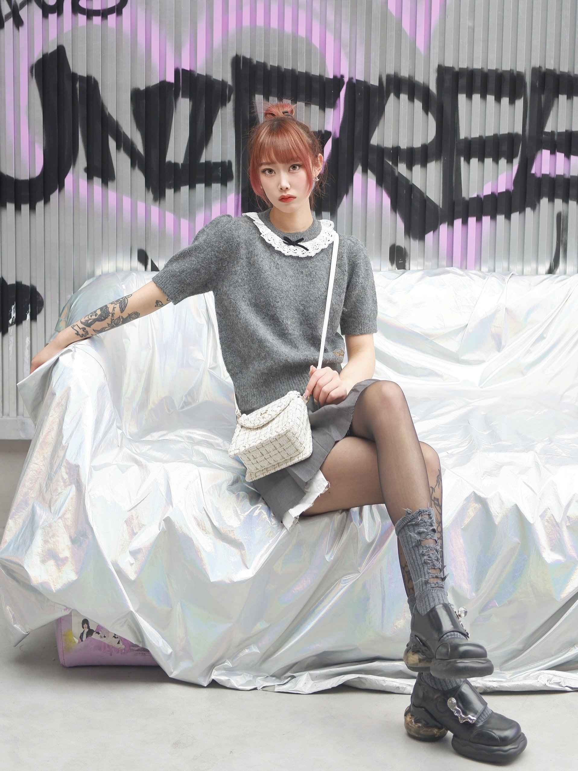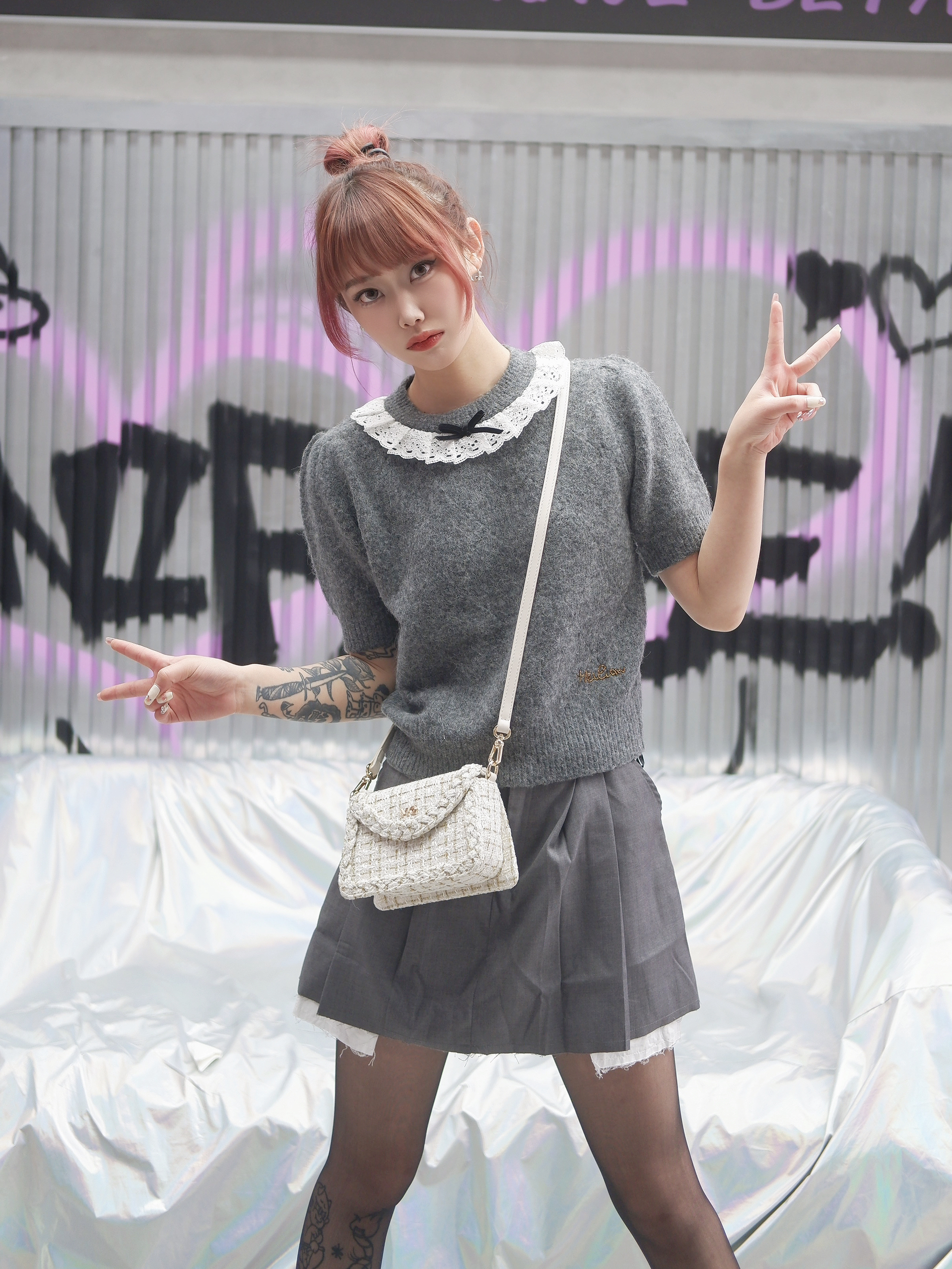 大概所有女生都抗拒不了灰色毛衣吧~ 短袖毛衣真的自带氛围感呀 蕾丝的点缀搭配依旧一绝✅ 收腰下摆无敌显瘦⚡️ 搭配灰白拼接百褶裙更有设计感~ 整体就是一种简单低调的高级感🉑 再搭配小方包信封📩包 很别致的小香风超耐看👀摸着厚实有质感~ 珍珠格纹给简约设计带来丝丝特色~🥰 精致的甜酷女孩👧简直彻底沦陷啦🙈
