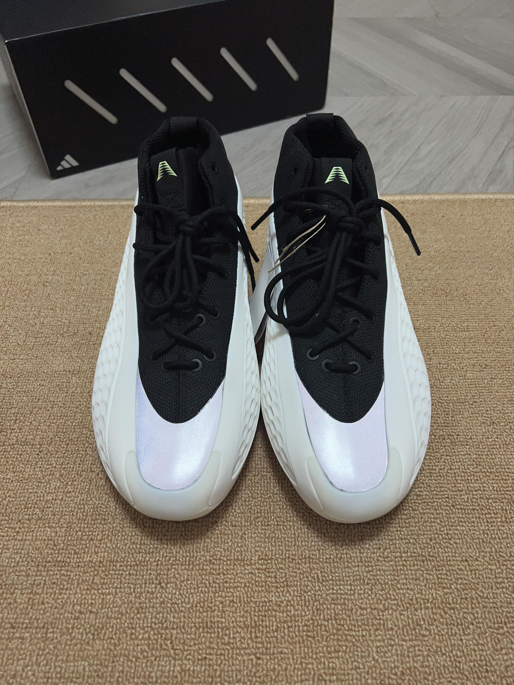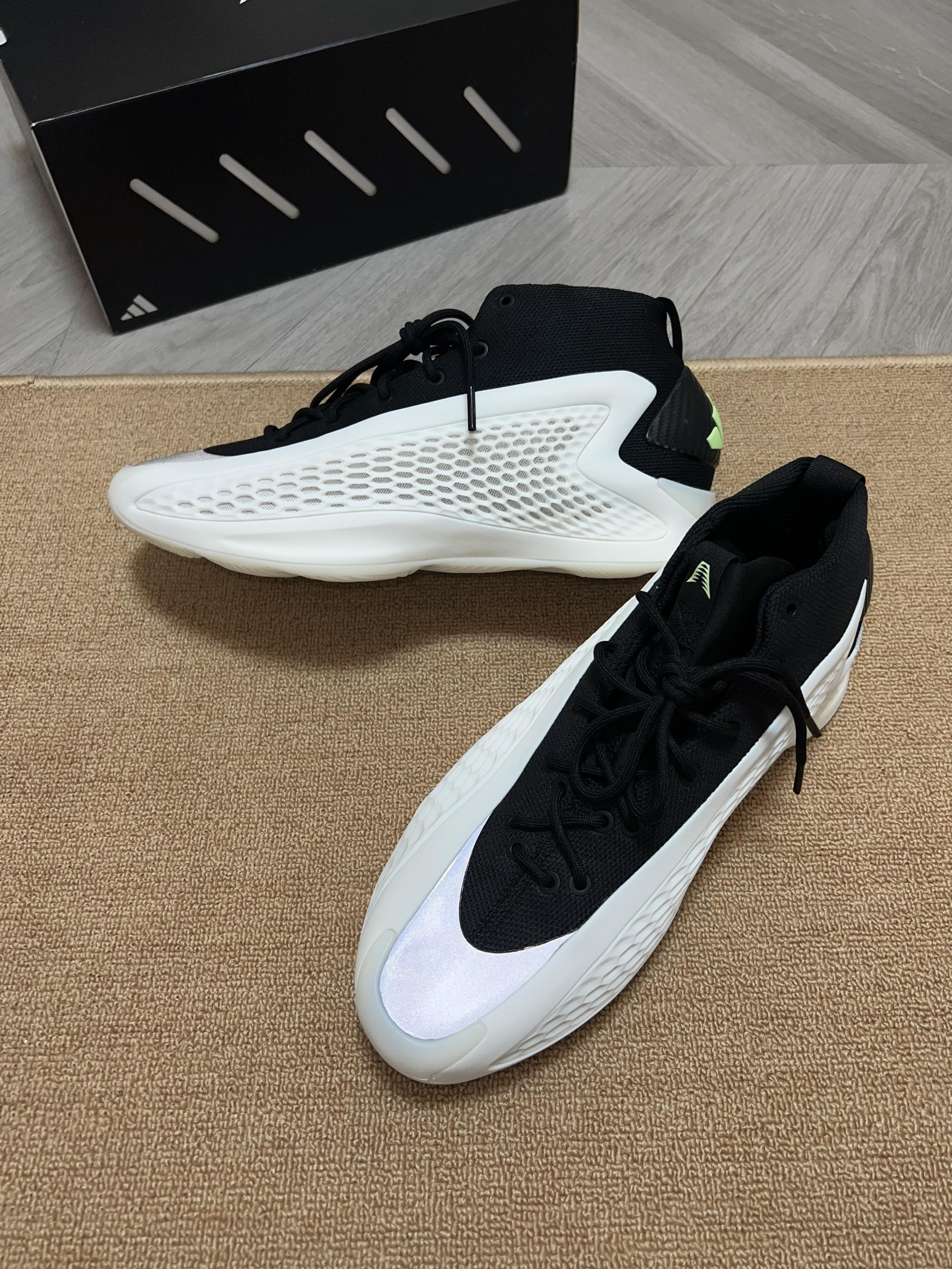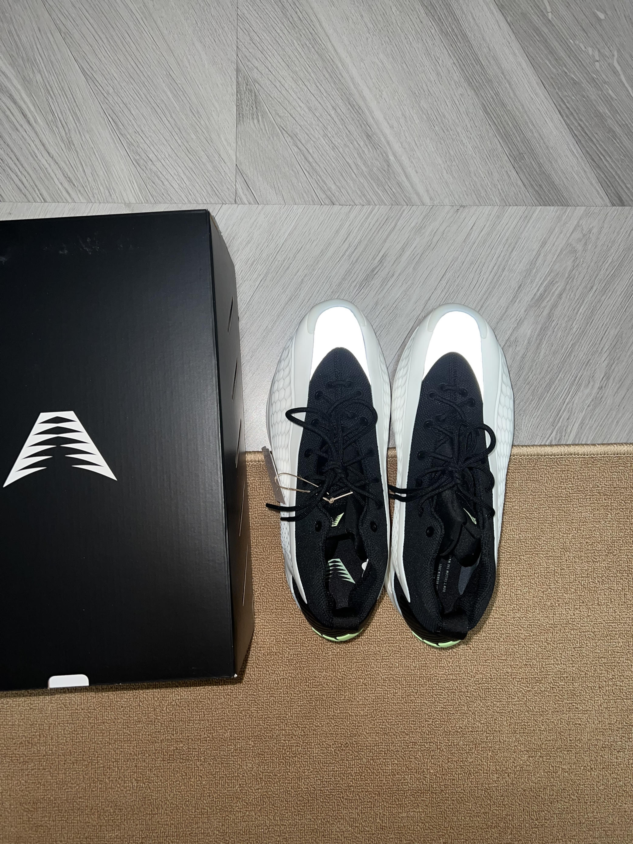 🎨鞋子采用了经典的黑白配色,大面积软质tpu加上黑色内靴,鞋头还有一块类似3m反光的银色材质,吸引眼球。(有点yeezy篮球鞋的味道了) ✨ 这次的鞋盒用了黑色的,正面是爱德华兹的个人 logo (首发的黑橙配色则是白色加迪子的logo和爱德华兹的签名) 💫 这黑白配色相对于首发的黑橙色,少了一副附赠的鞋带。(迪子这是怎么回事啊) 🌟 之前都是穿43码球鞋,这次买了44码,初上脚感觉前面有点压大脚...