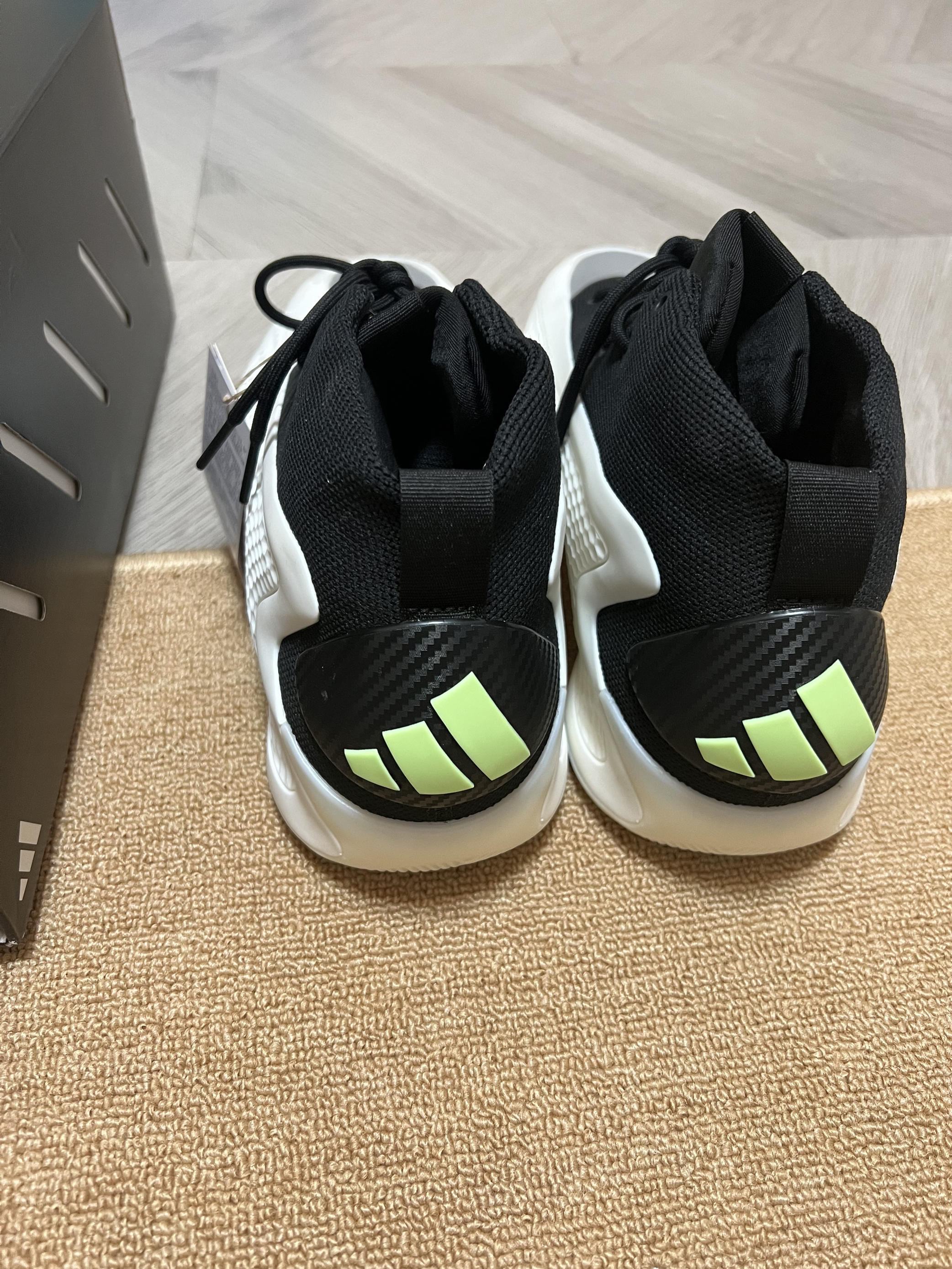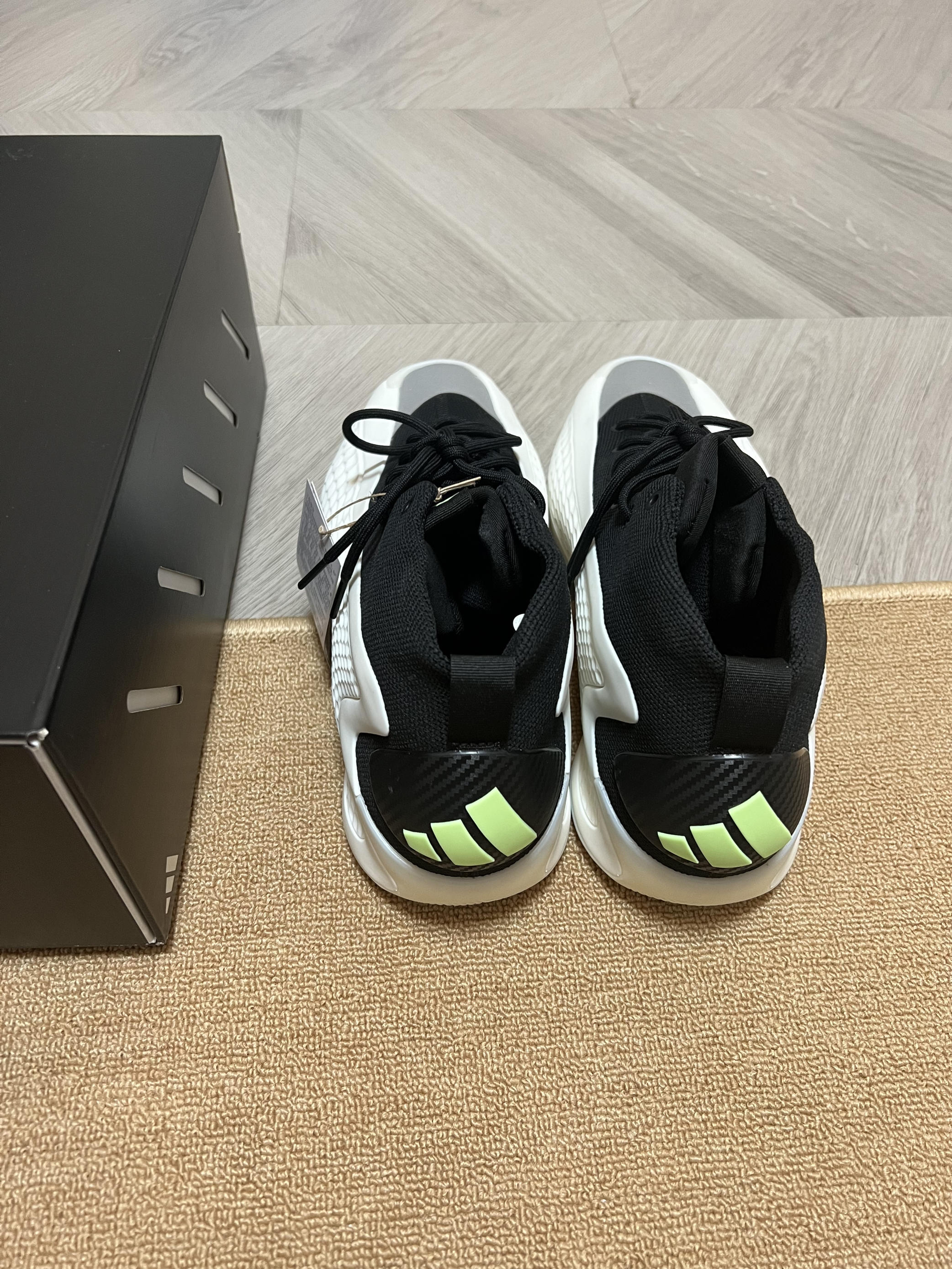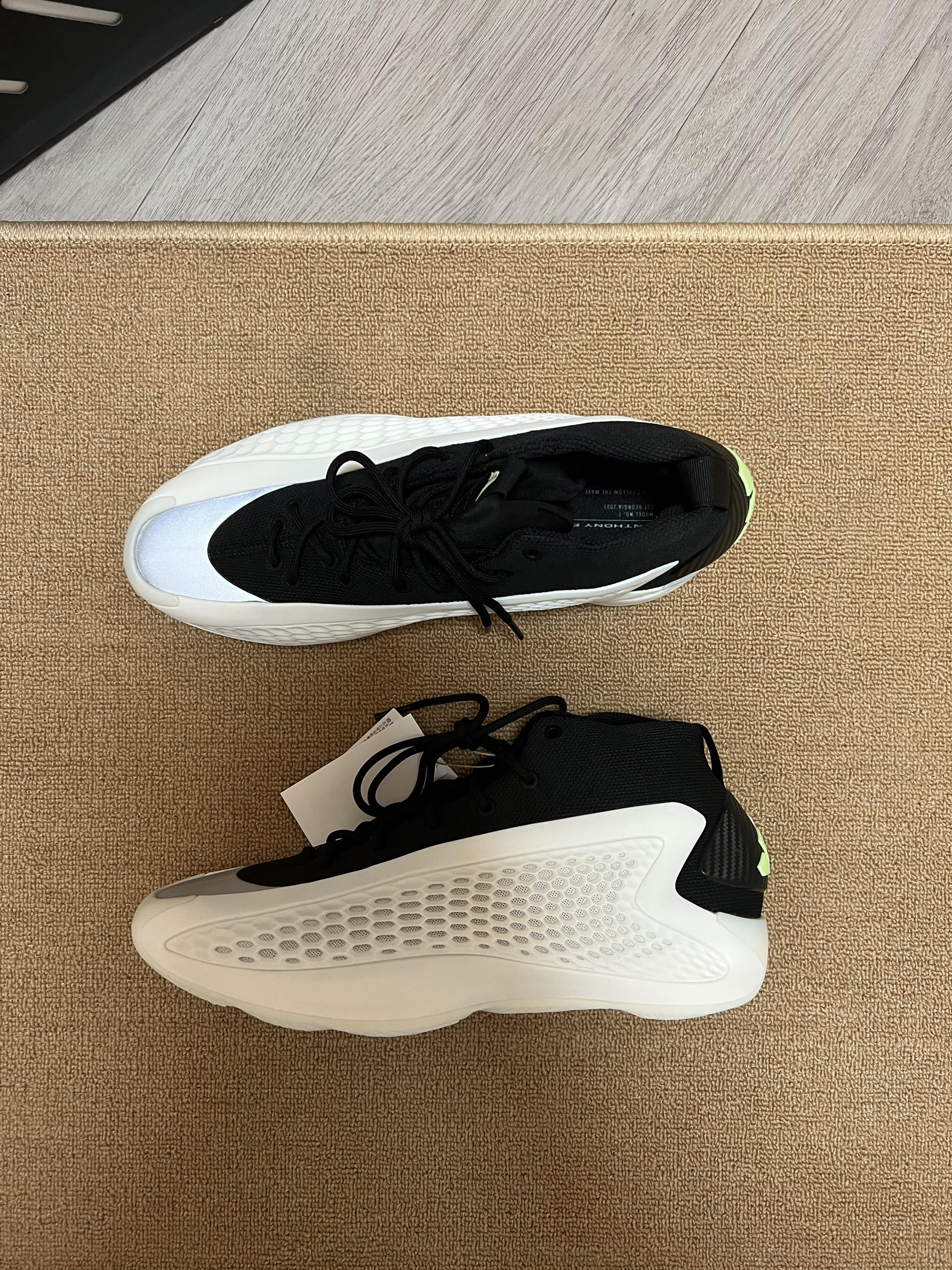 🎨鞋子采用了经典的黑白配色,大面积软质tpu加上黑色内靴,鞋头还有一块类似3m反光的银色材质,吸引眼球。(有点yeezy篮球鞋的味道了) ✨ 这次的鞋盒用了黑色的,正面是爱德华兹的个人 logo (首发的黑橙配色则是白色加迪子的logo和爱德华兹的签名) 💫 这黑白配色相对于首发的黑橙色,少了一副附赠的鞋带。(迪子这是怎么回事啊) 🌟 之前都是穿43码球鞋,这次买了44码,初上脚感觉前面有点压大脚...