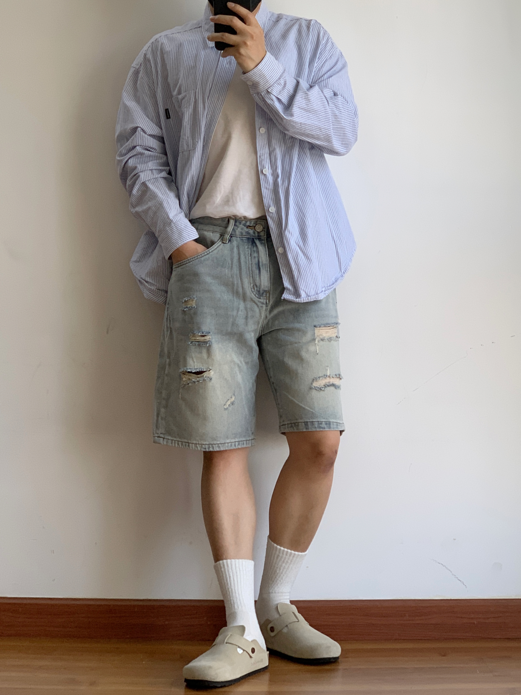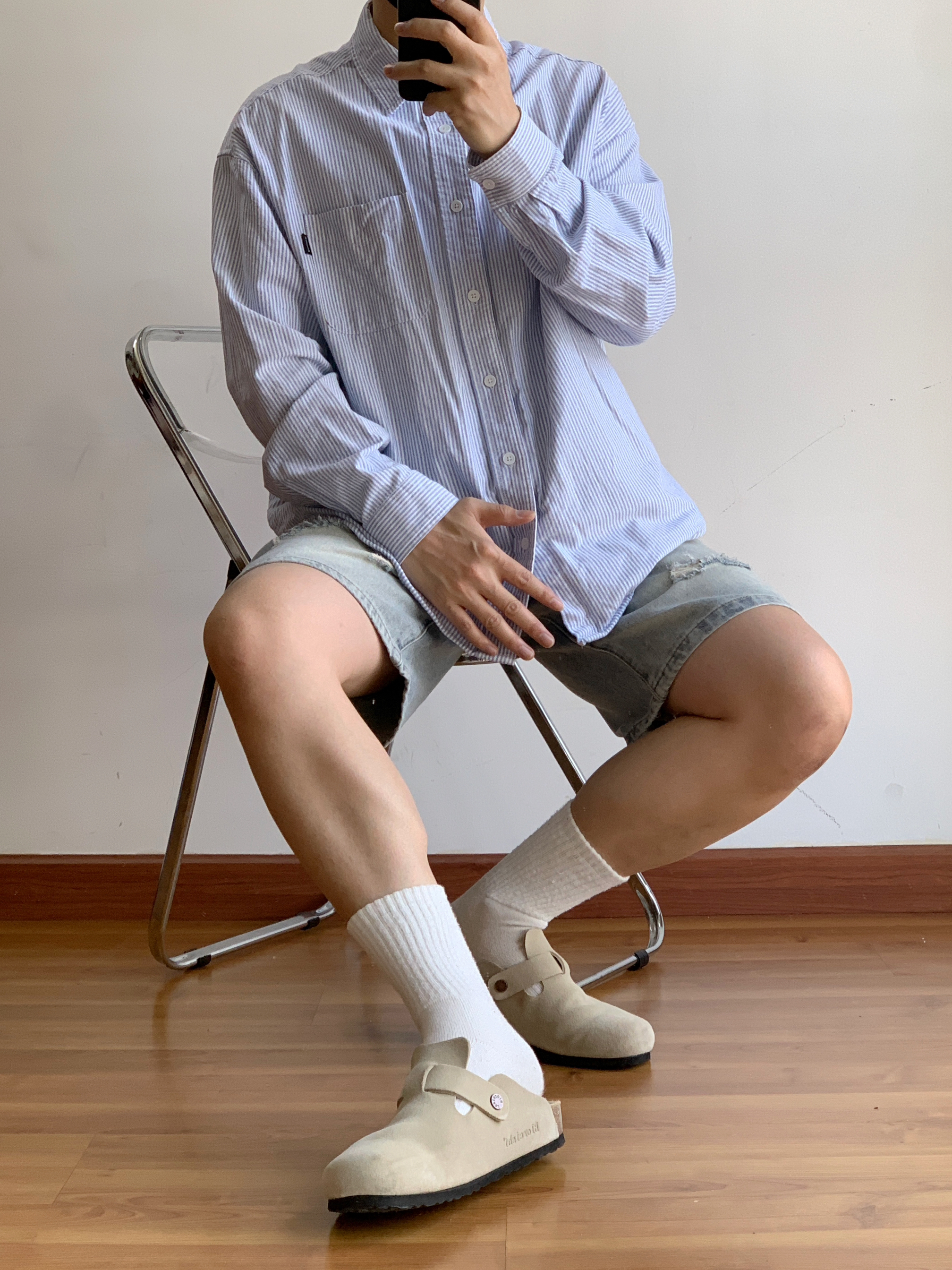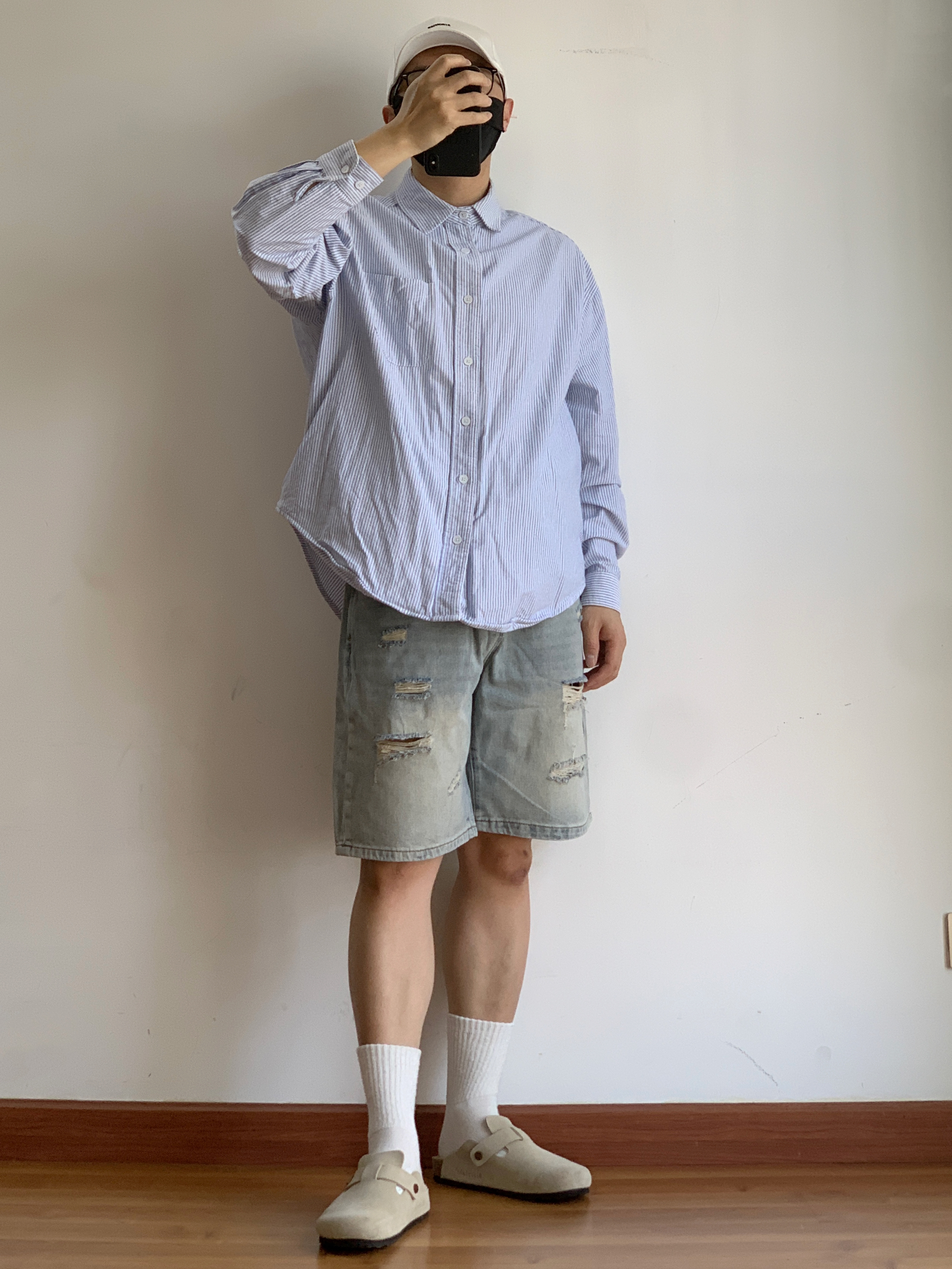 身高|体重:175/70 🧍♂️ 穿搭风格:休闲cityboy 👔 上衣:蓝色条纹衬衫 👖 下装:冰蓝牛仔裤 🩴 拖鞋:沙色勃肯拖 🎒配饰: