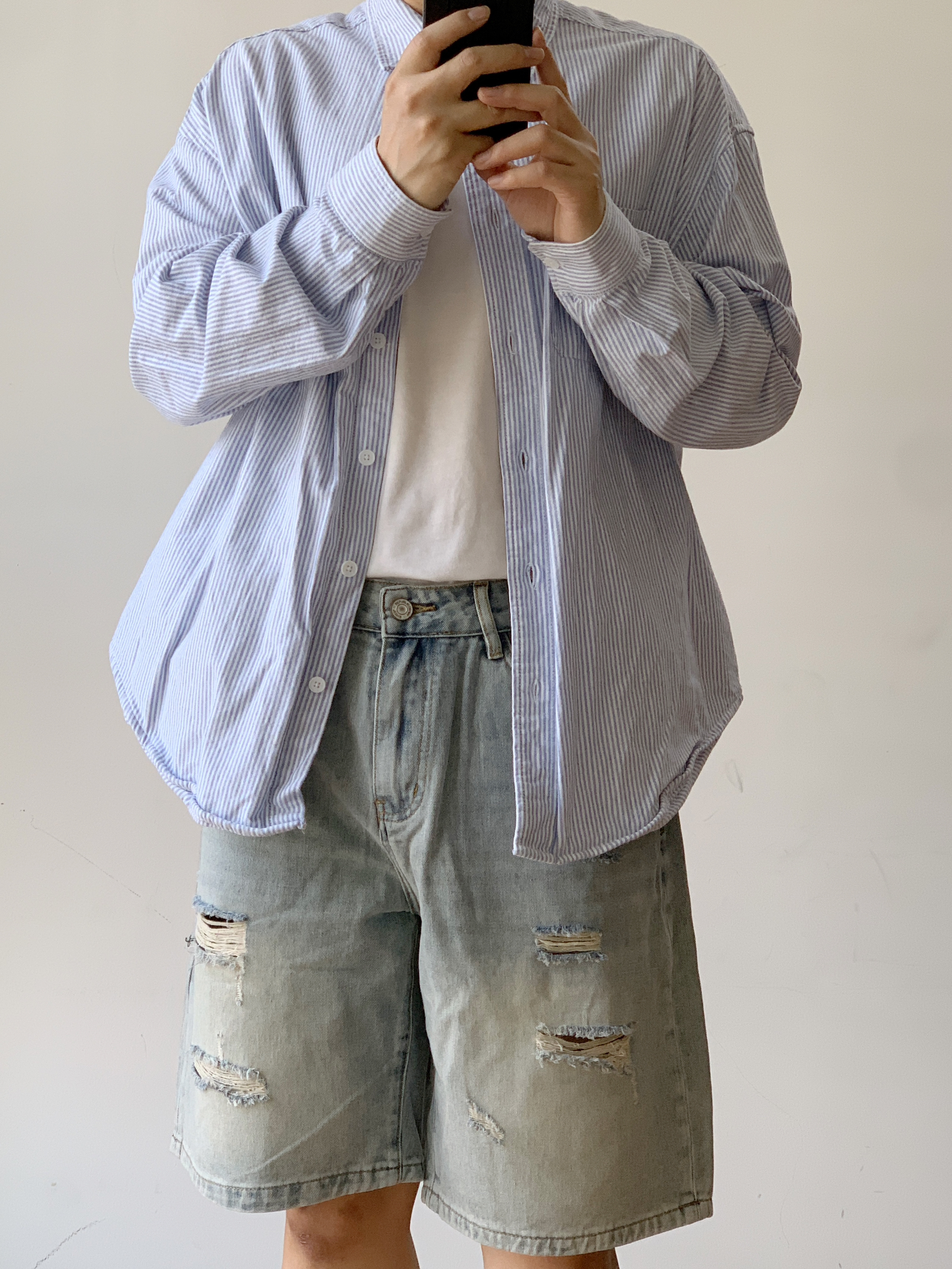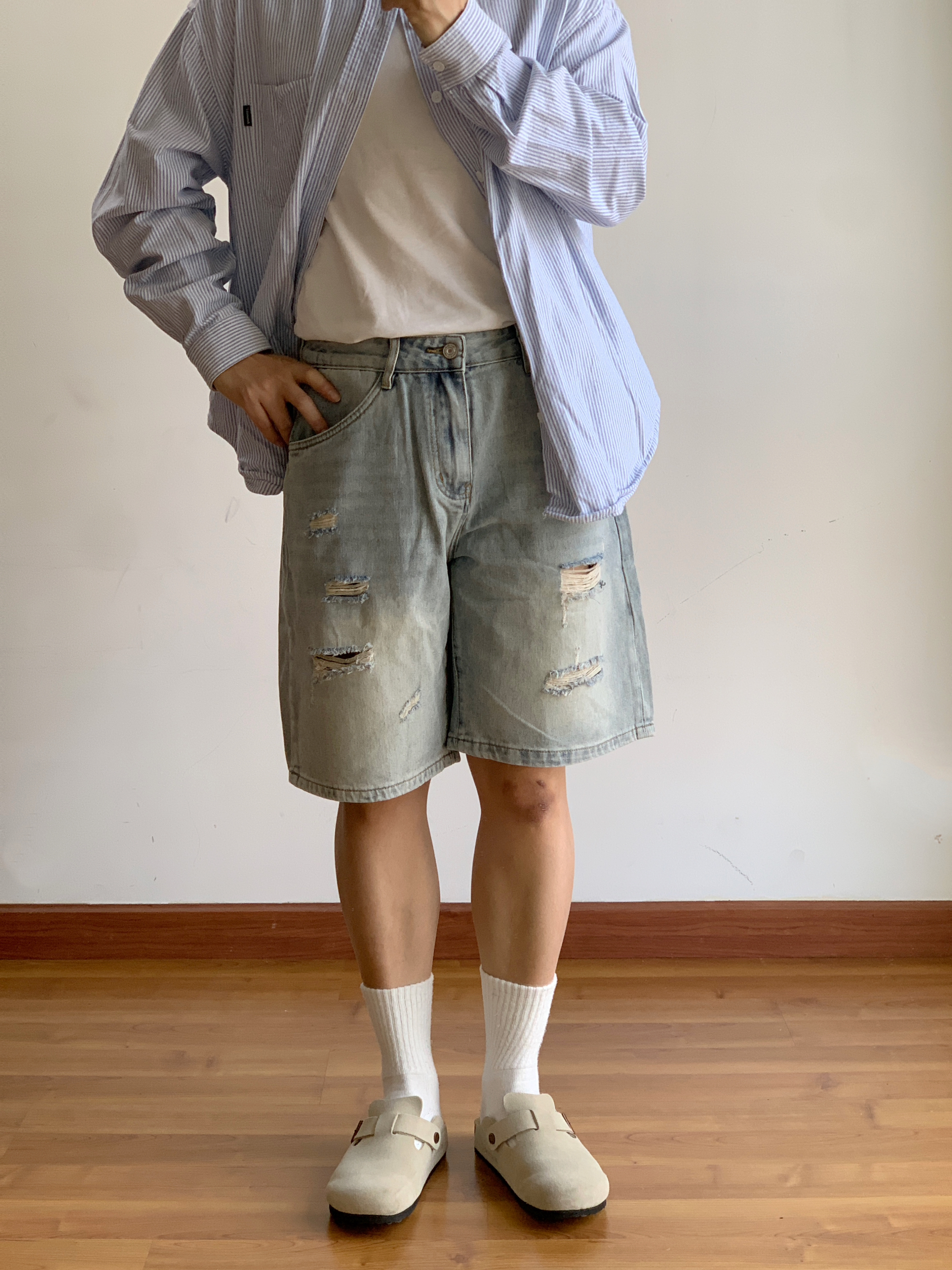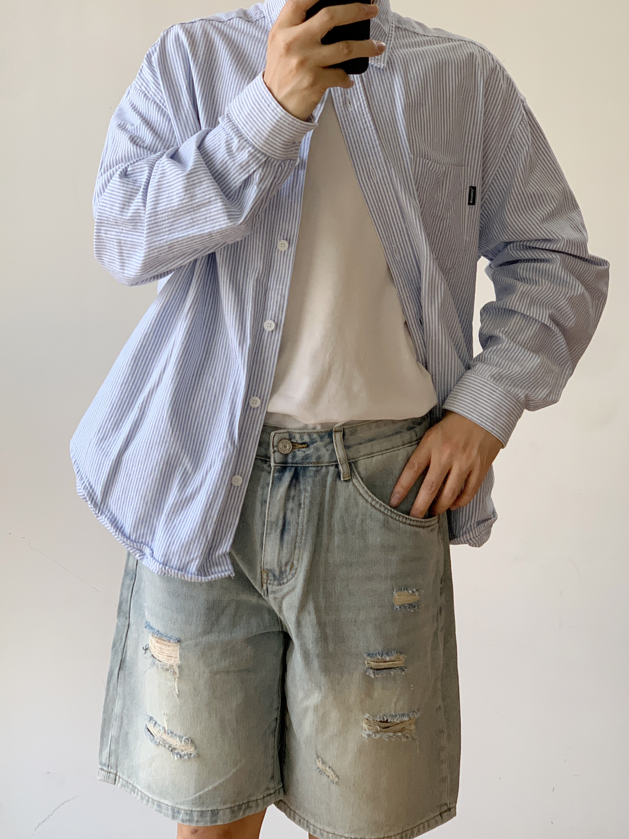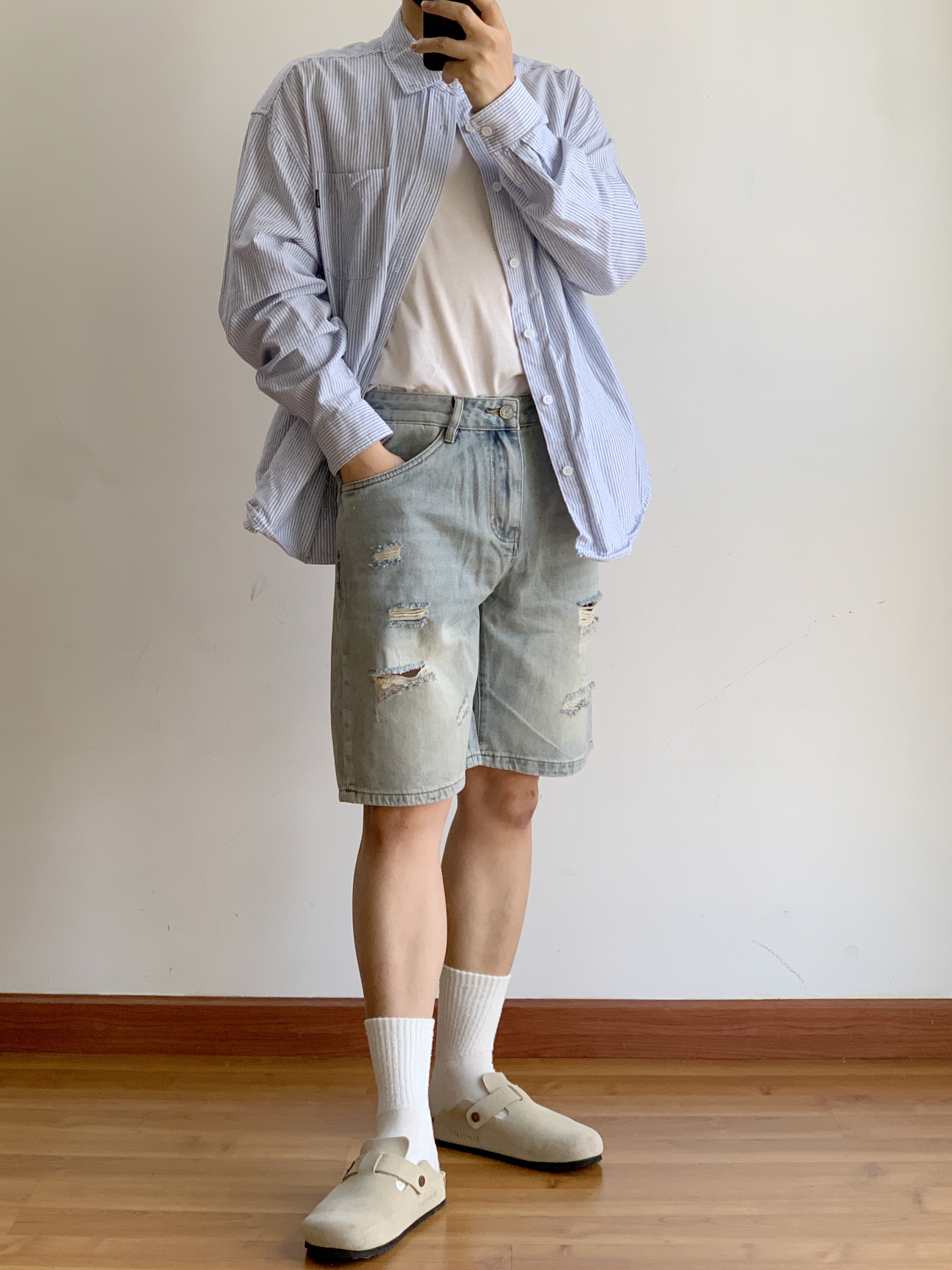身高|体重:175/70 🧍♂️ 穿搭风格:休闲cityboy 👔 上衣:蓝色条纹衬衫 👖 下装:冰蓝牛仔裤 🩴 拖鞋:沙色勃肯拖 🎒配饰:
