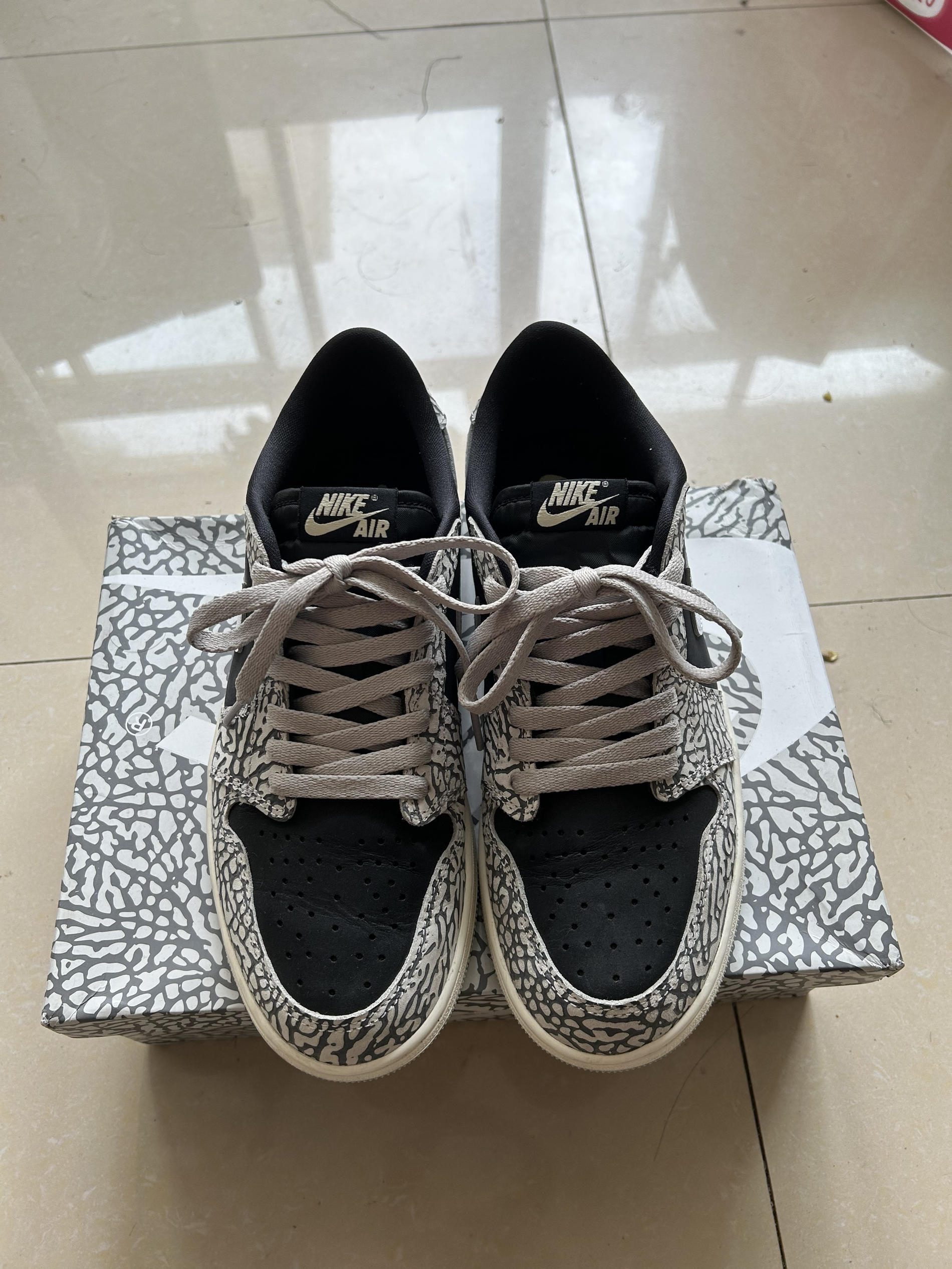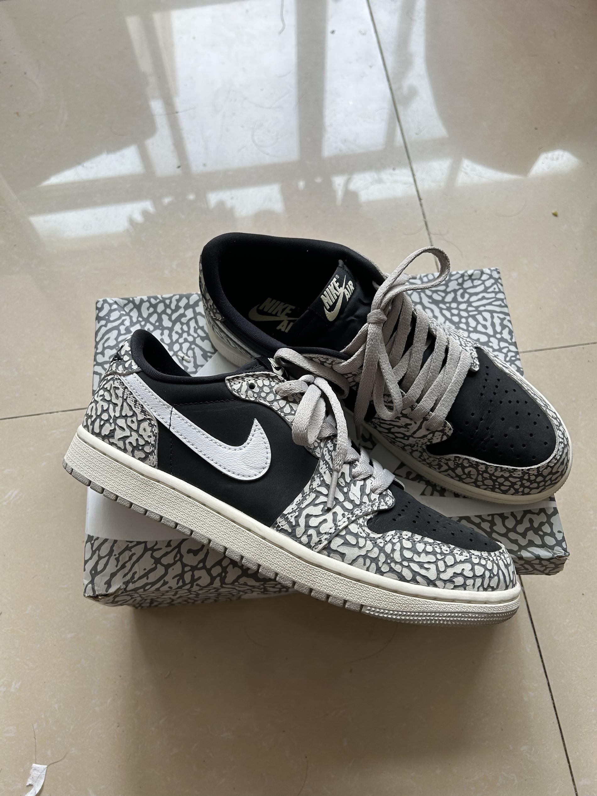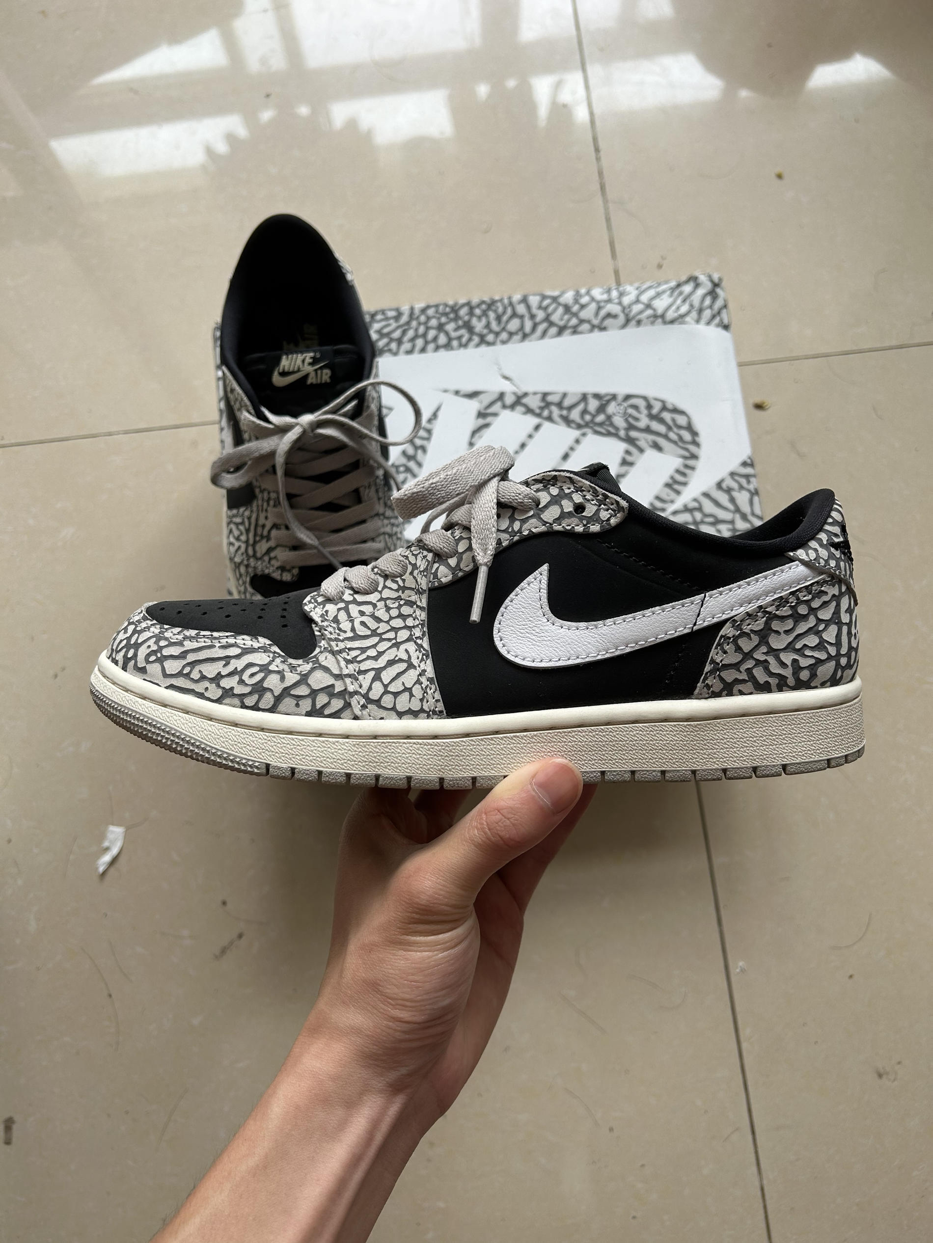 鞋子很帅⛹️🏻♀️但是这些地方你要注意了🤔 上脚的这双鞋是AJ1low OG 爆裂纹-白象,附赠一副灰色鞋带,鞋身用了黑、白、水泥灰三种颜色进行组合,颜值非常在线,也很好搭配,特别适合夏天穿着。这个鞋子也是比较耐脏,打理可以用橡皮擦擦一下就好。 ❗️❗️但是❓❓ 鞋码方面:由于是OG鞋款,鞋子尺码是稍微偏大一点点,鞋身区别于普通版本偏修长,所以导致前脚掌位置偏窄,出现卡脚趾的情况,我Nike平...