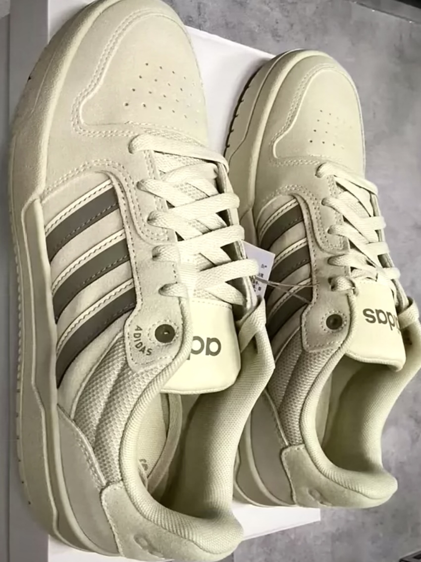 今天和大家分享一下 Adidas neo Entrap 芥末绿 鞋身采用大面积麂皮材质,质感杠杠的,在鞋舌部分拼接了织物材质。 鞋子鞋底比较偏硬,就是和板鞋脚感差不多,不过这个价格还要什么自行车呀。