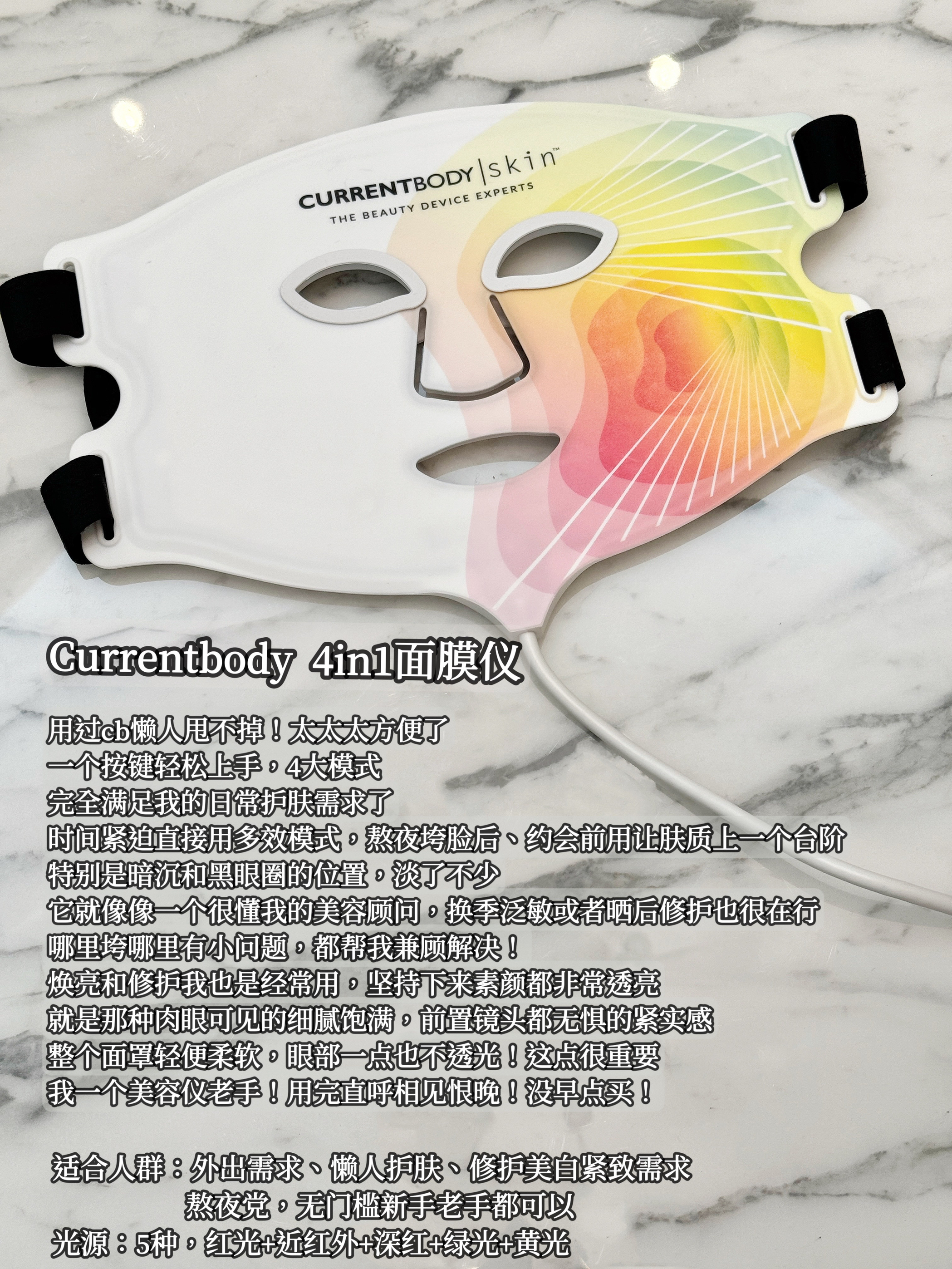 我一直都有用大排灯的习惯,没少尝试美容仪这玩意 但对于我自己来说功效不用多,实用最重要 操作方便也很重要,大大影响我的使用频率 今天就跟大家分享一下我个人这段时间很爱用的倆美容仪 理性种草按需选择哦~ · ◾️Currentbody 4in1面膜仪 「操作0难度轻便易携带|修护美白紧致allin!」 适合人群:外出需求、懒人护肤、修护美白紧致需求、熬夜党,无门槛新手老手都可以 光源:5种,红光+...