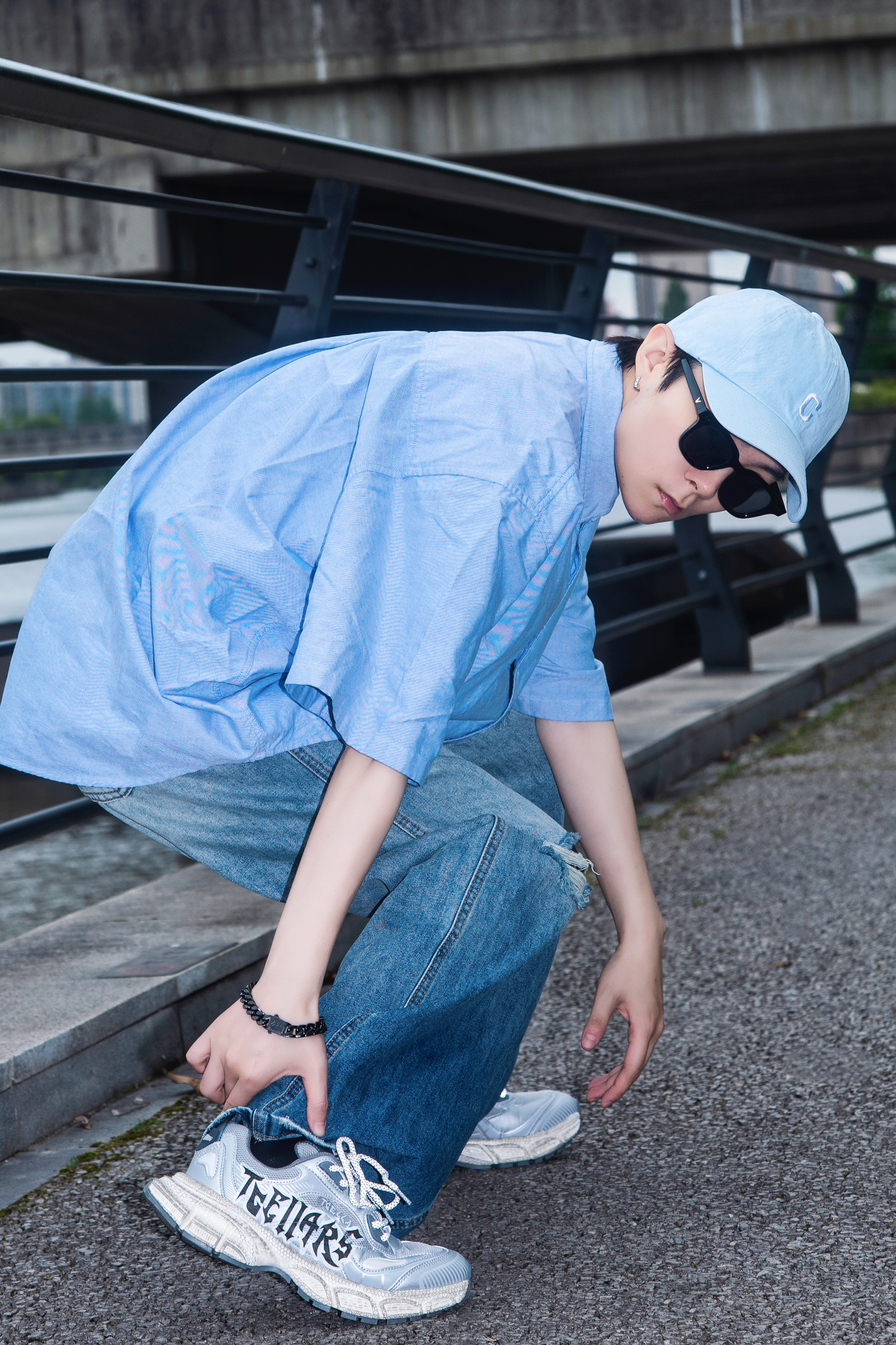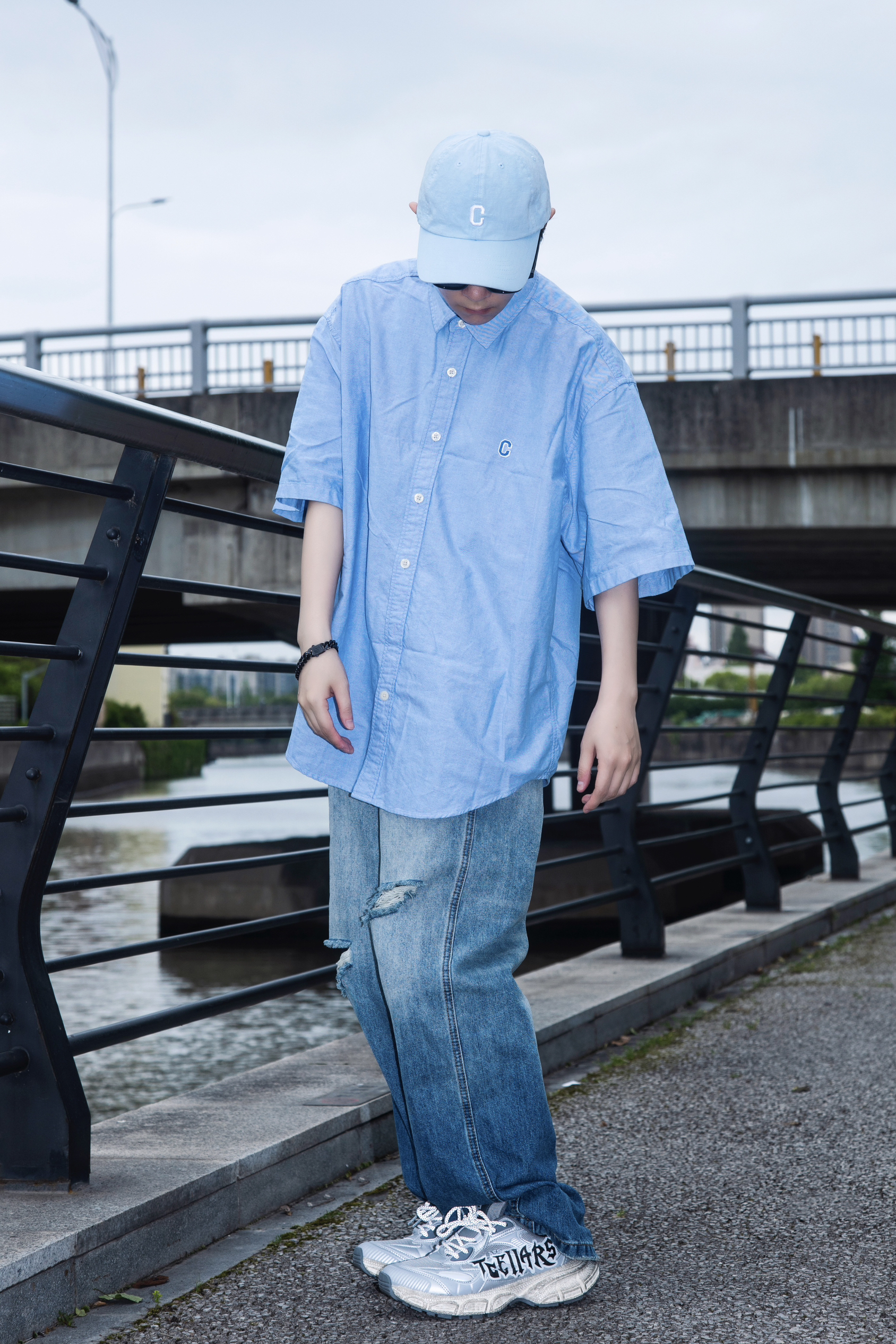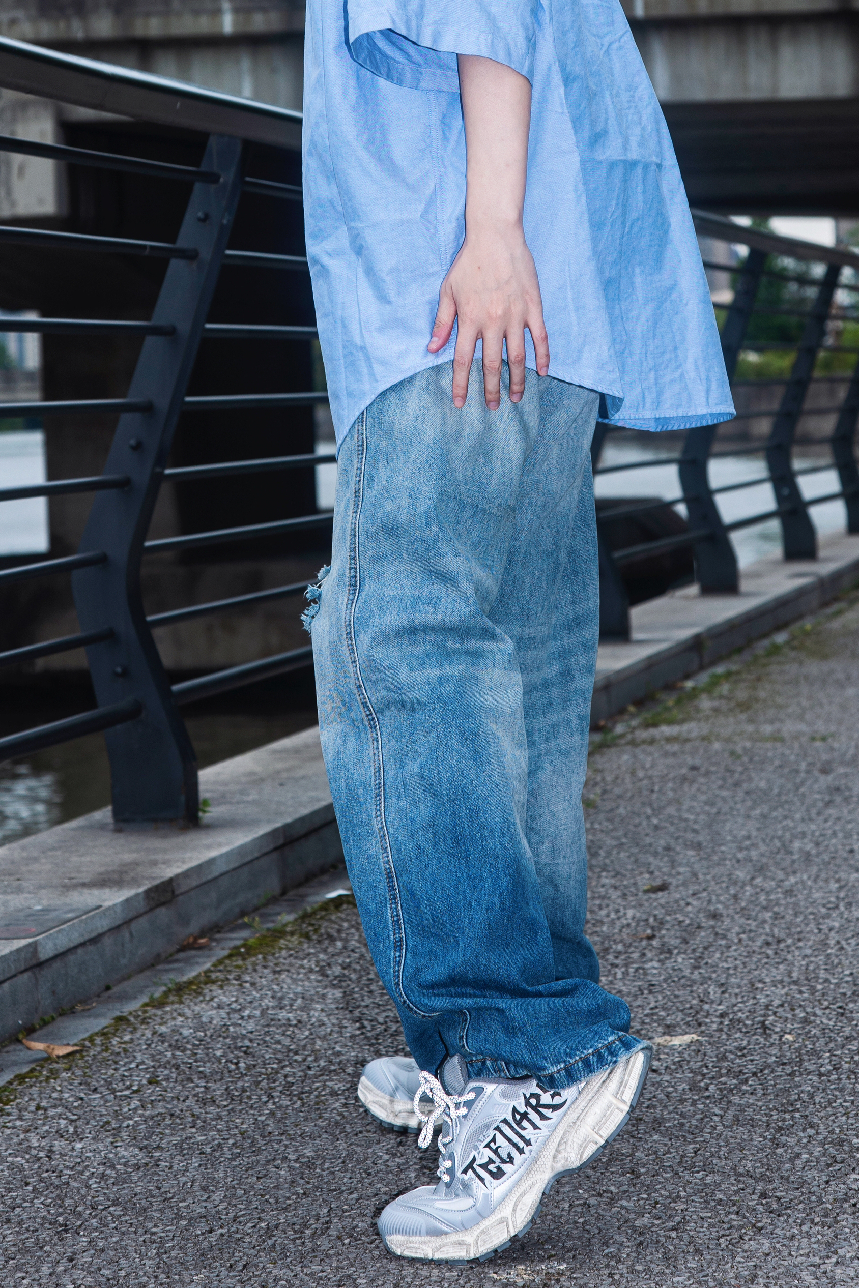 要说春日松弛感穿搭 还是衬衫配牛仔裤最能打 穿搭指南: 上身一件蓝色短袖衬衫 下身一条水洗破洞牛仔裤 整体宽松的版型自带松弛慵懒氛围 上脚一双Tcellars银色老爹鞋 鞋身做了做旧处理 搭配字母印花很街头 厚底设计 走起路来很软弹 蓝银搭配 清爽的同时又有个性