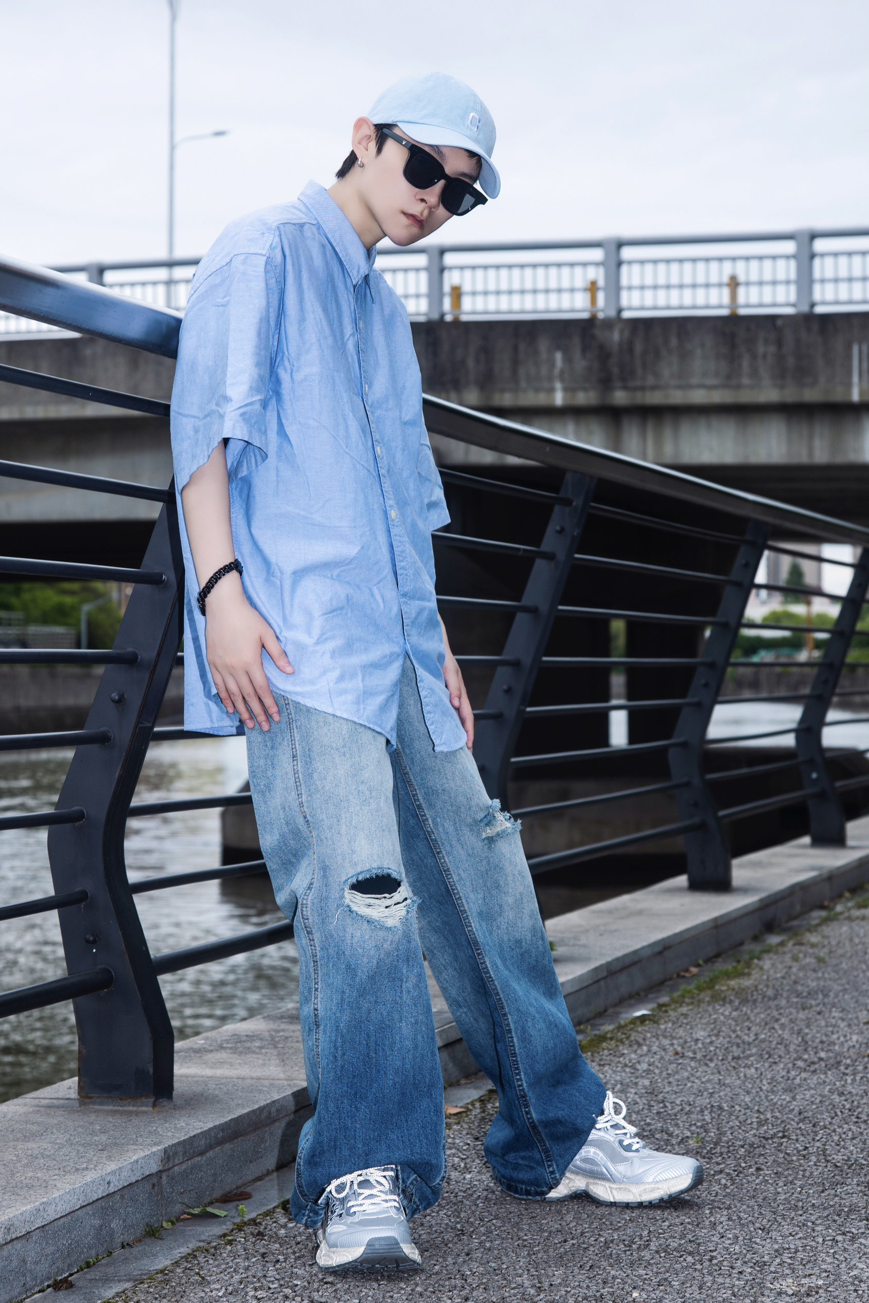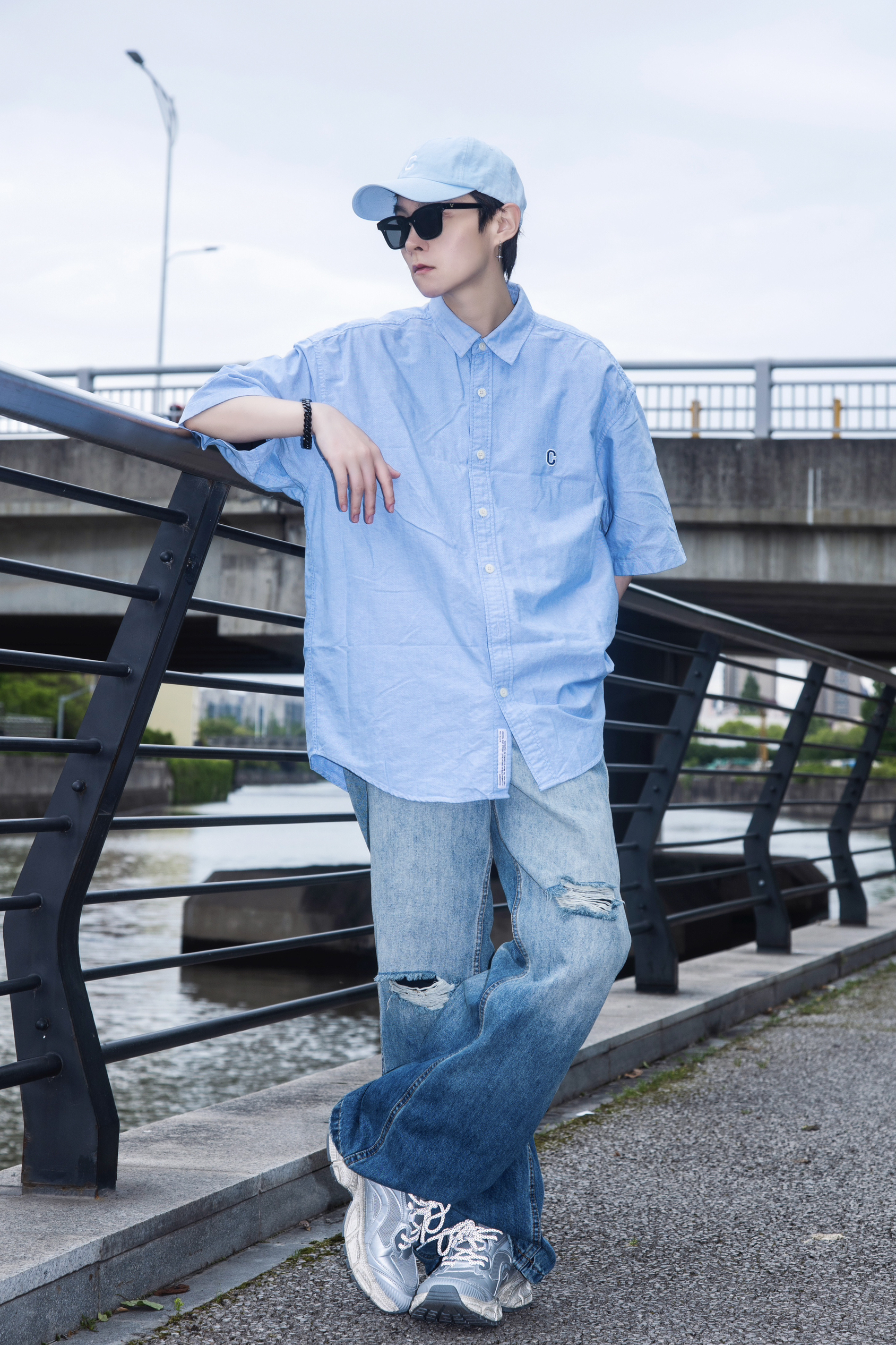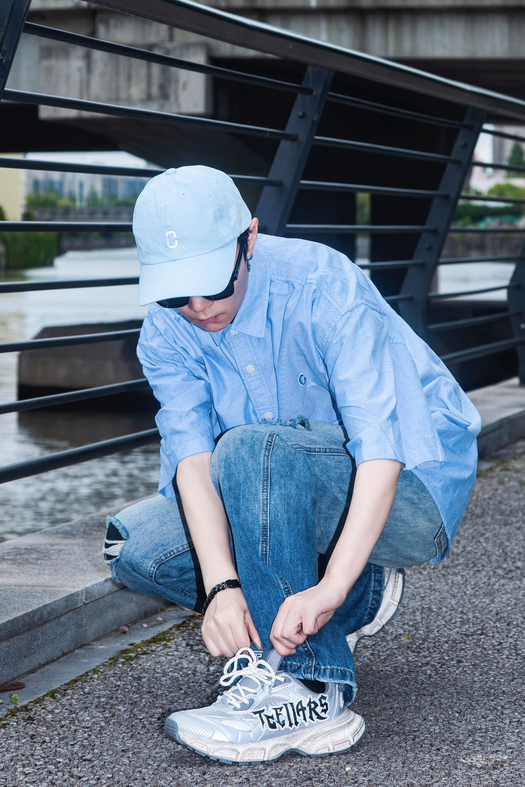 要说春日松弛感穿搭 还是衬衫配牛仔裤最能打 穿搭指南: 上身一件蓝色短袖衬衫 下身一条水洗破洞牛仔裤 整体宽松的版型自带松弛慵懒氛围 上脚一双Tcellars银色老爹鞋 鞋身做了做旧处理 搭配字母印花很街头 厚底设计 走起路来很软弹 蓝银搭配 清爽的同时又有个性