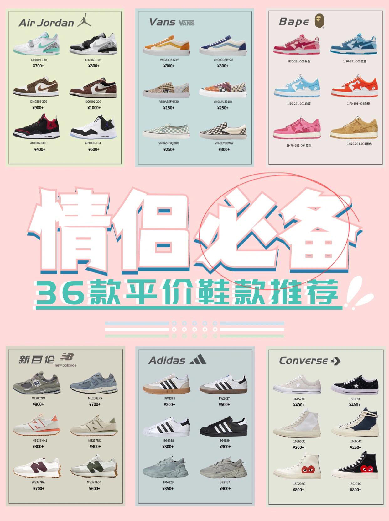 喜欢的鞋要和喜欢的人一起穿❤️ 穿上情侣鞋是不是就拥有了同频的步伐和世界~ 今天就带来了36双私藏的宝藏情侣鞋( 话不多说!快穿. 上情侣鞋美美出游吧 货号和价格已标注 1⃣️Air Jordan 乔丹 2⃣️Vans万斯 3⃣️Bape 4⃣️New Balance 新百伦 5⃣️Adidas 阿迪达斯 6⃣️Converse 匡威 希望大家可以找到合适的情侣鞋 大家有其他推荐不错的鞋...