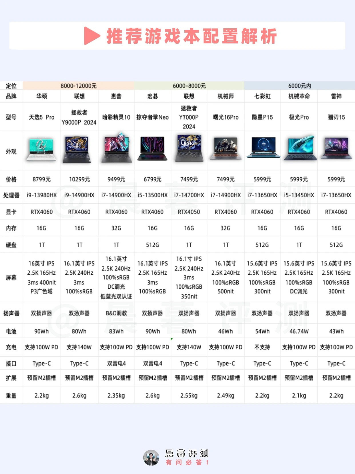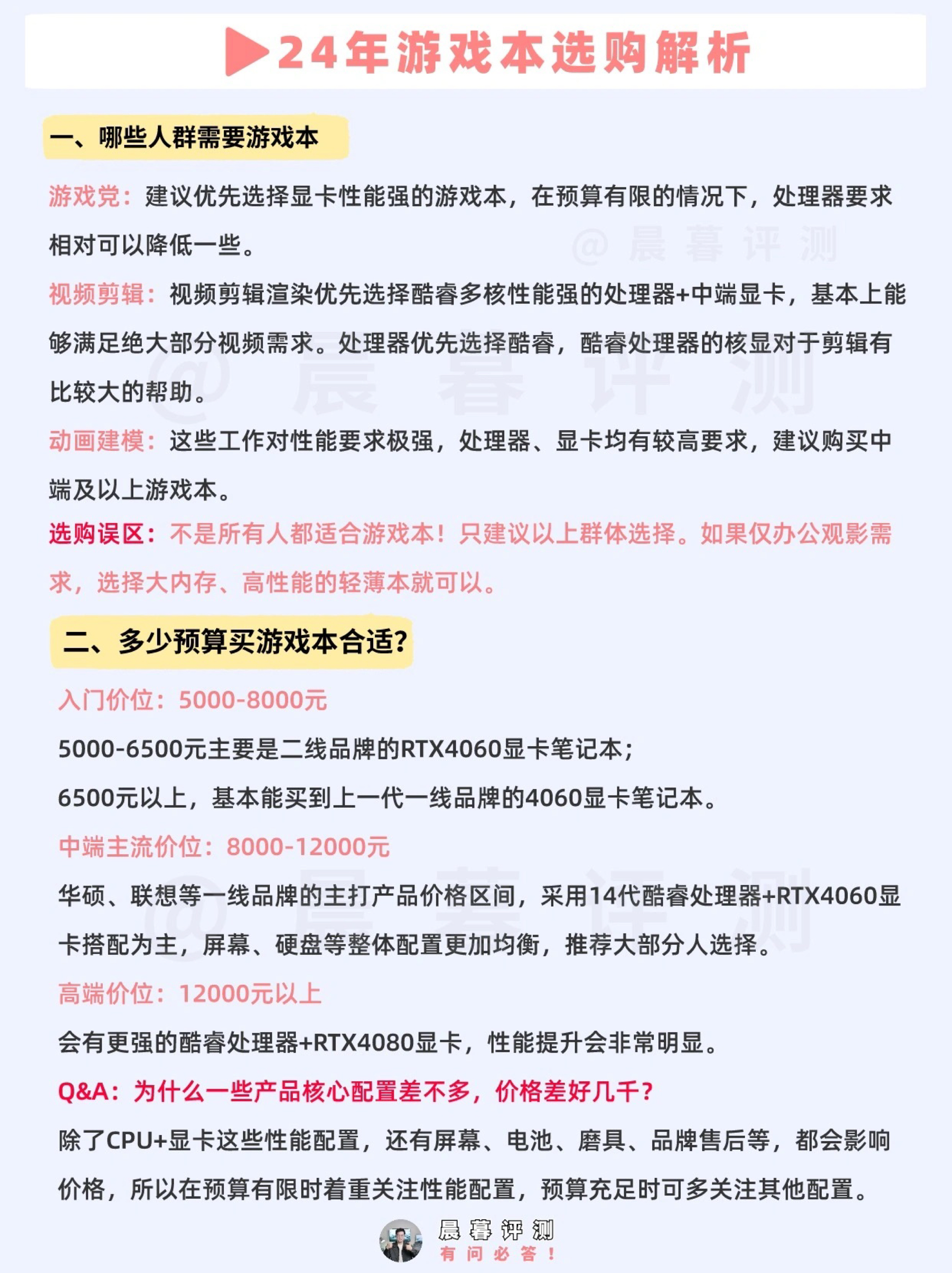 一、哪些群体需要游戏本 游戏党、视频剪辑、动画建模 选购误区:不是所有人都适合游戏本!只建议以上群体选择。如果仅办公观影需求,选择大内存、高性能的轻薄本就可以。 ~~ 二、学生党选购多少预算合适? 1.入门价位:5000-8000元 5000-6500元主要是二线品牌的RTX4060显卡笔记本; 6500元以上,基本能买到上一代一线品牌的4060显卡笔记本。 ~ 2.中端主流价位:8000-120...