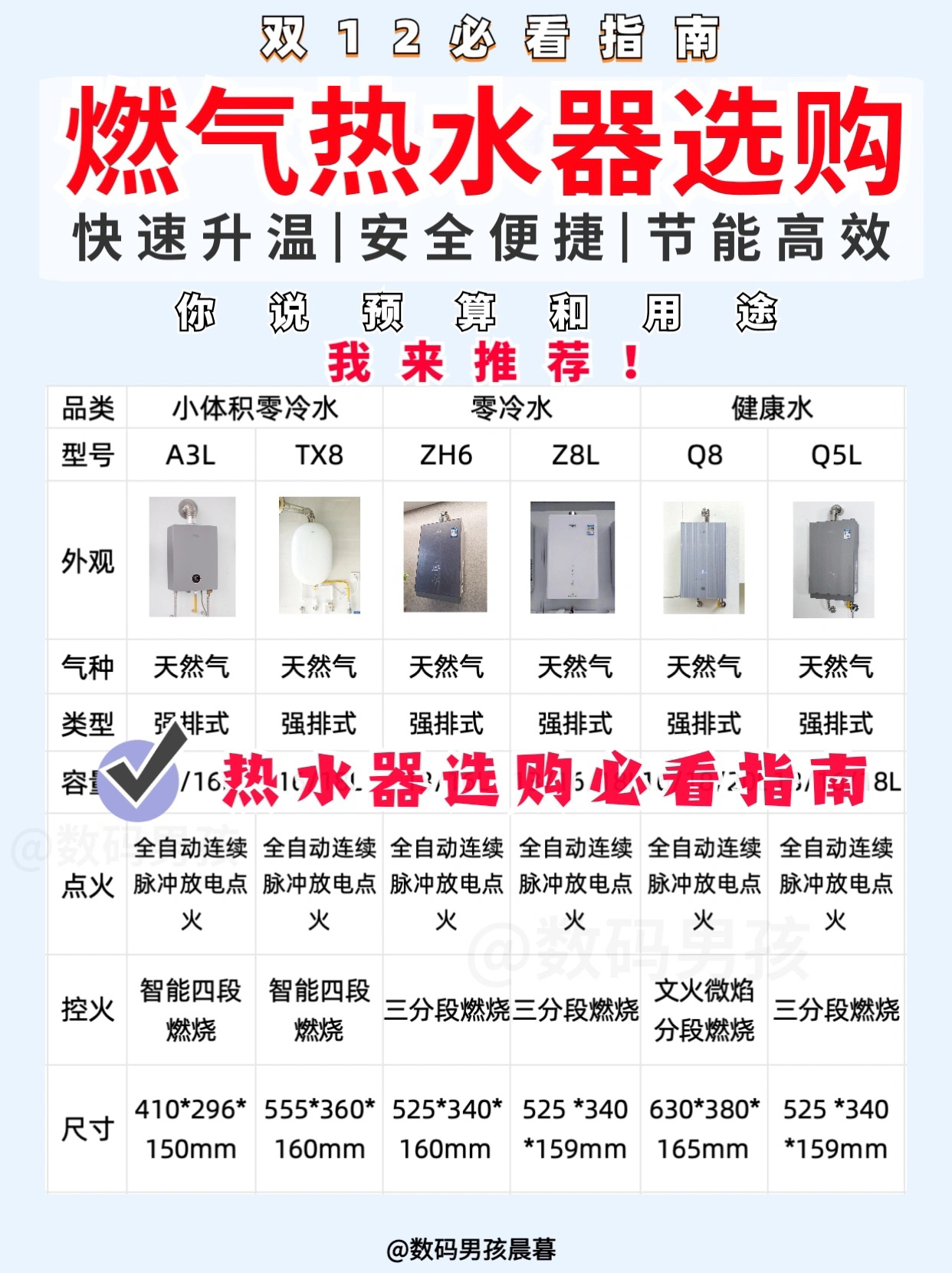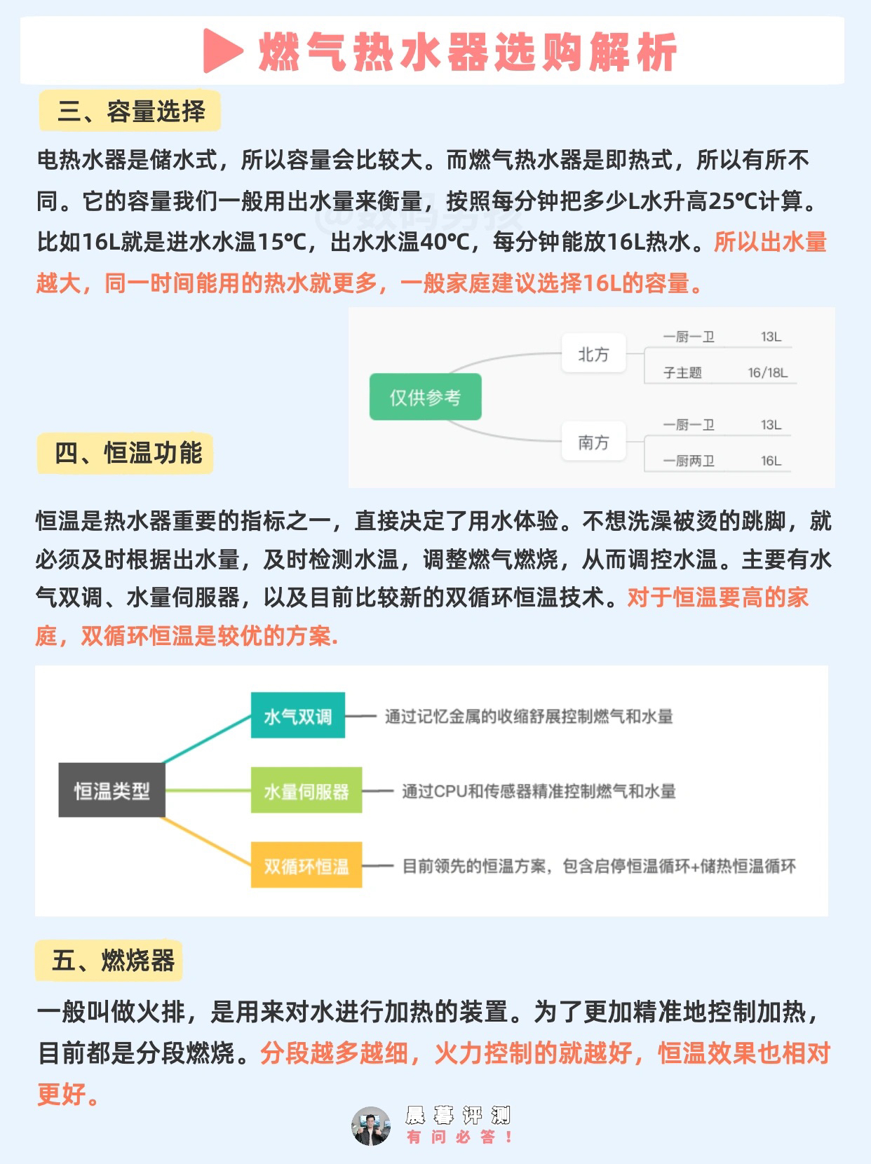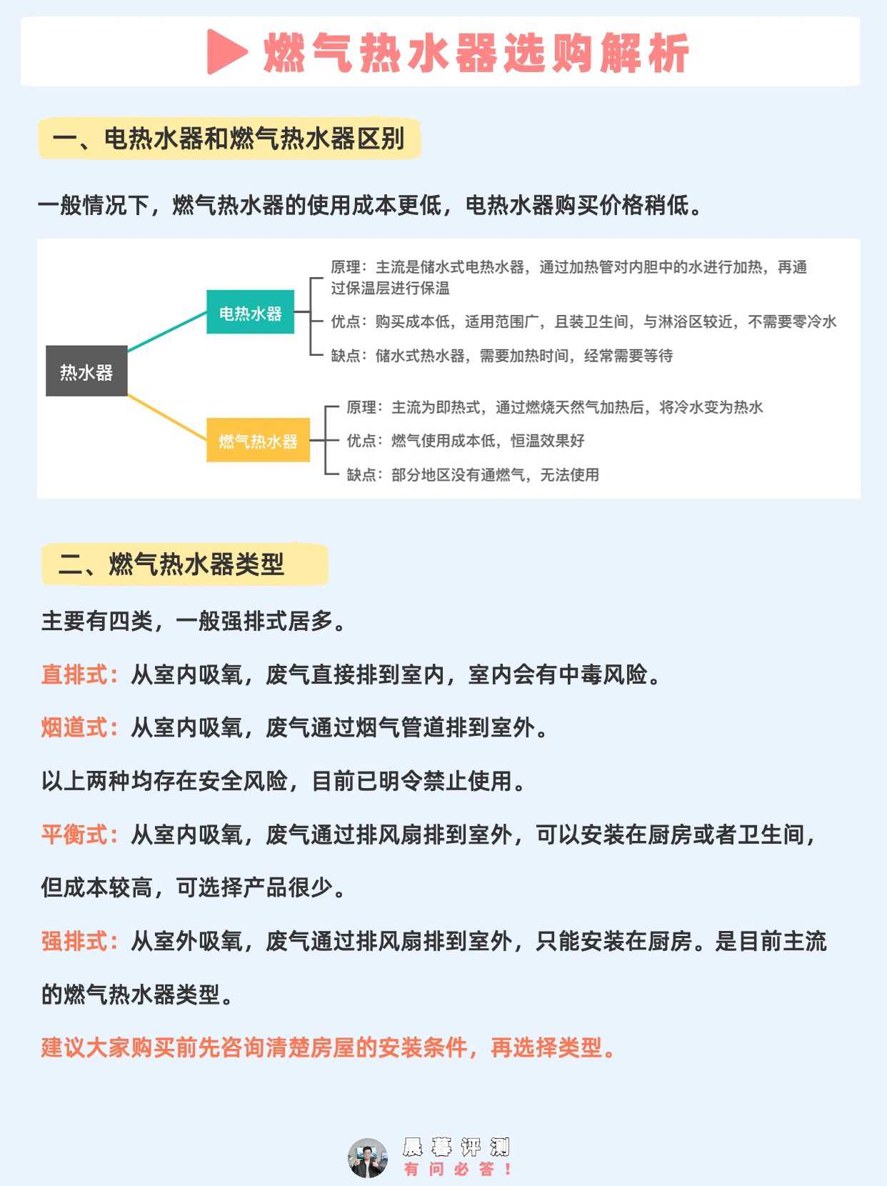 一、选电热水器or燃气热水器 一般情况下,燃气热水器的使用成本较低,但有些地区不通燃气。 ~ 二、燃气热水器类型 有直排式、烟道式、平衡式、强排式四类,一般推荐强排式比较多,结构更加安全。 ~ 三、容量选择 电热水器是储水式,所以容量会比较大。而燃气热水器是即热式,所以有所不同。它的容量我们一般用出水量来衡量,按照每分钟把多少L水升高25℃计算。比如16L就是进水水温15℃,出水水温40℃,每分钟...
