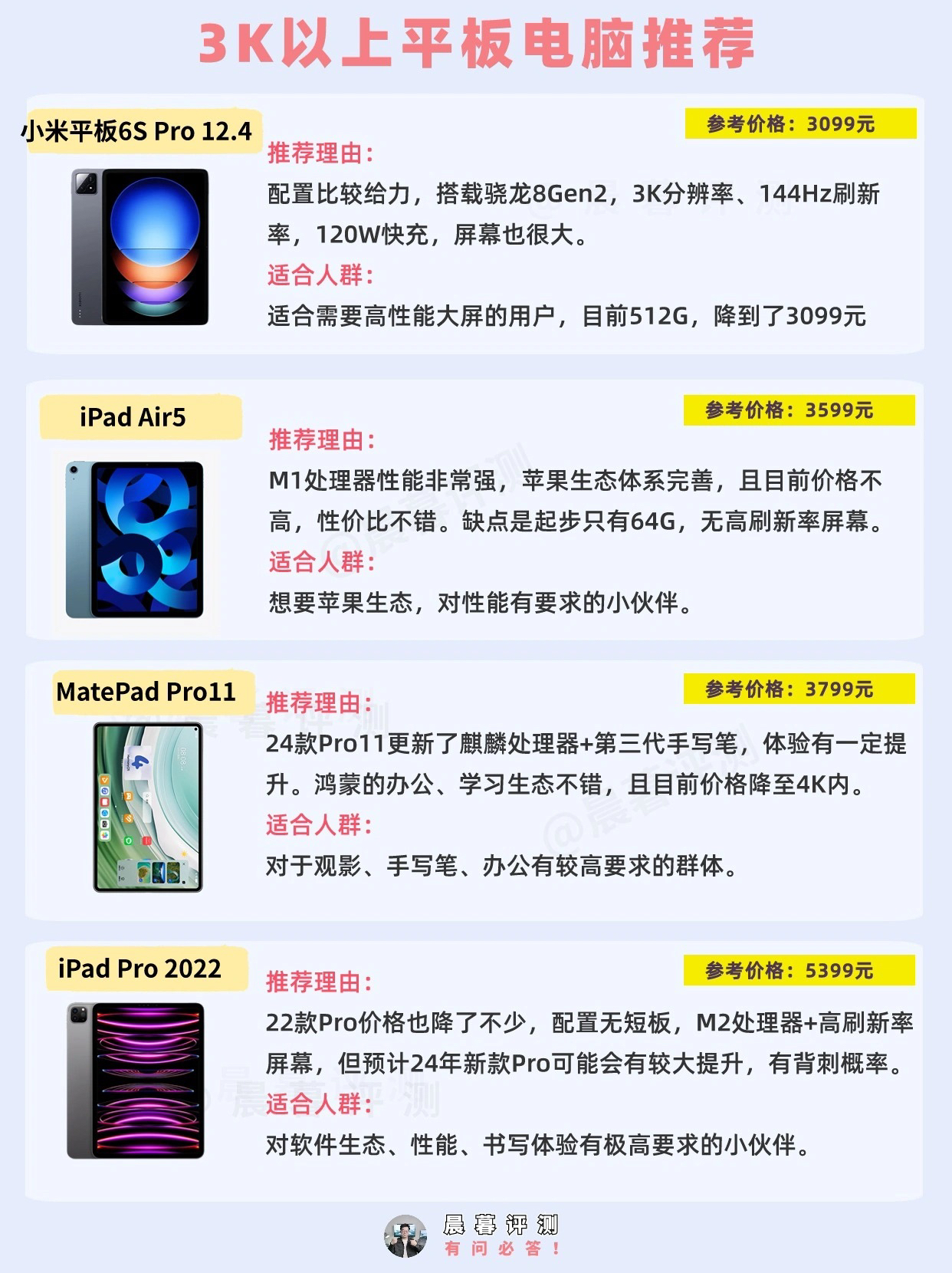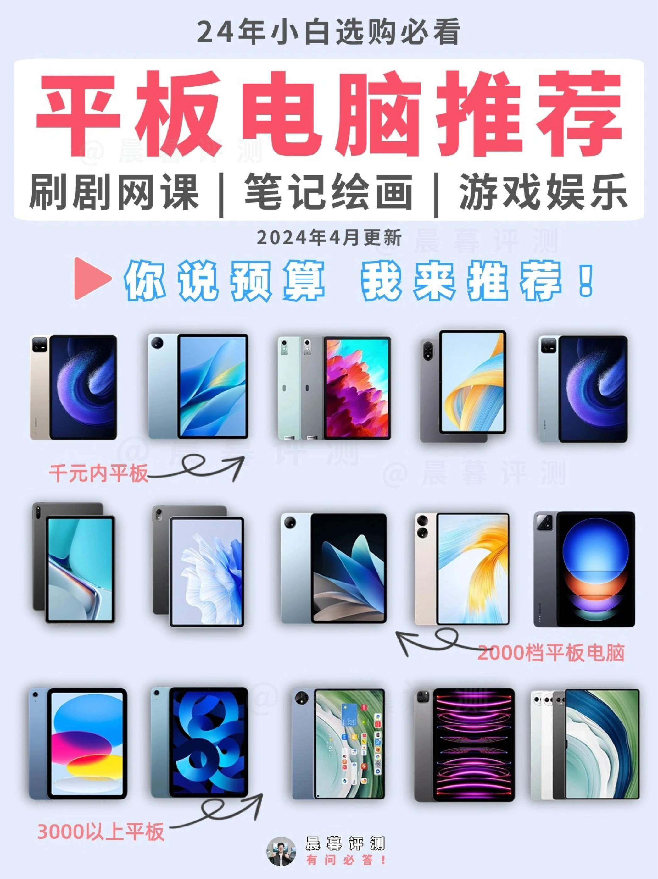 Hello这里是晨暮,给大家更新一期24年3-4月平板电脑选购,近期还是有不少平板在降价的。 千元平板 联想小新Pad2024:配置都一般,主要图个便宜,适合看剧网课。 vivo Pad Air:配置和小米平板6差不多,但竟然更便宜。 联想小新Pad Pro12.6:配置该给的都给了,价格不到1400的大屏平板。 荣耀V8 Pro:配置均衡,笔记体验不错。 ~ 2000档平板 华为MatePad1...