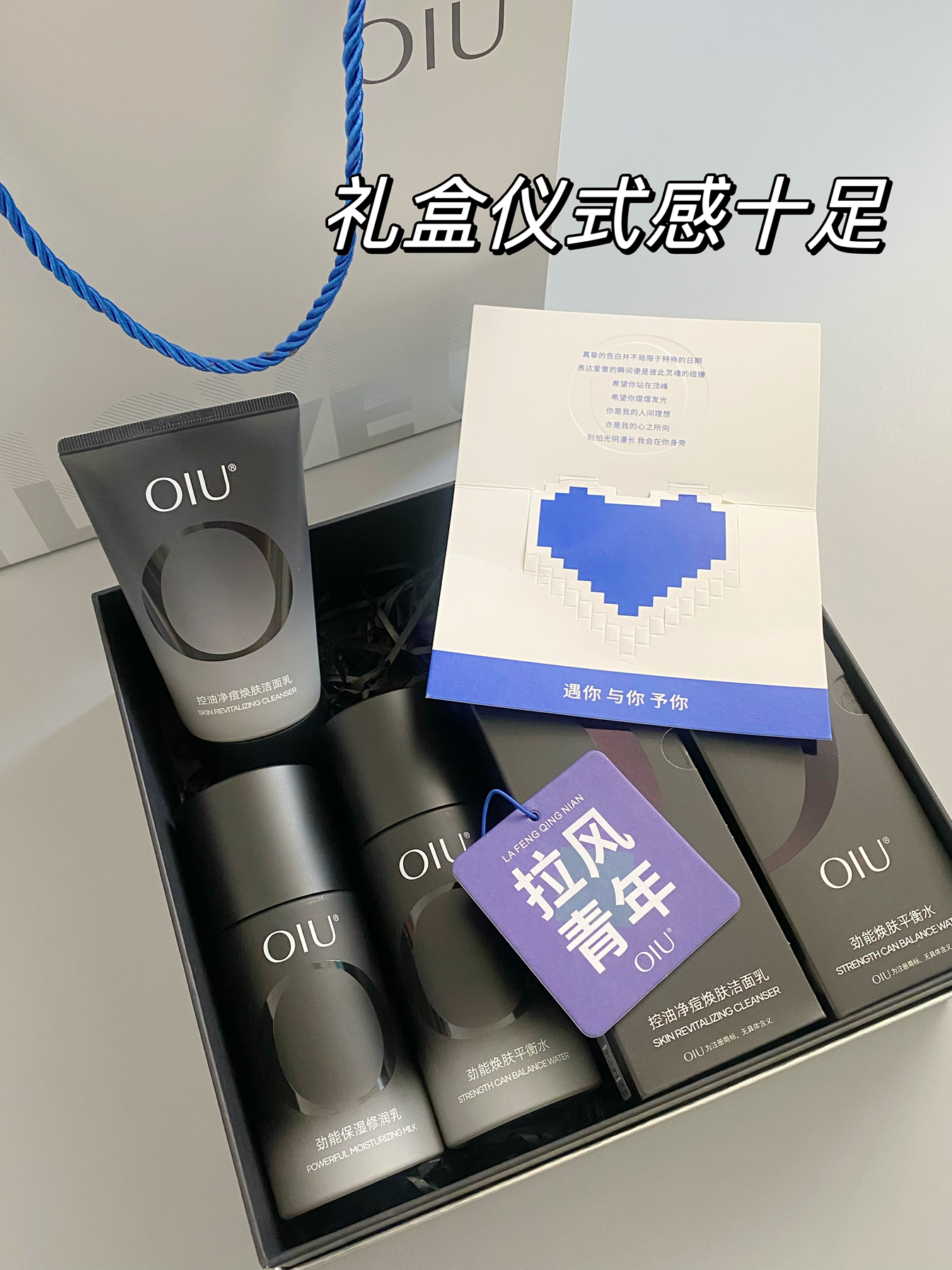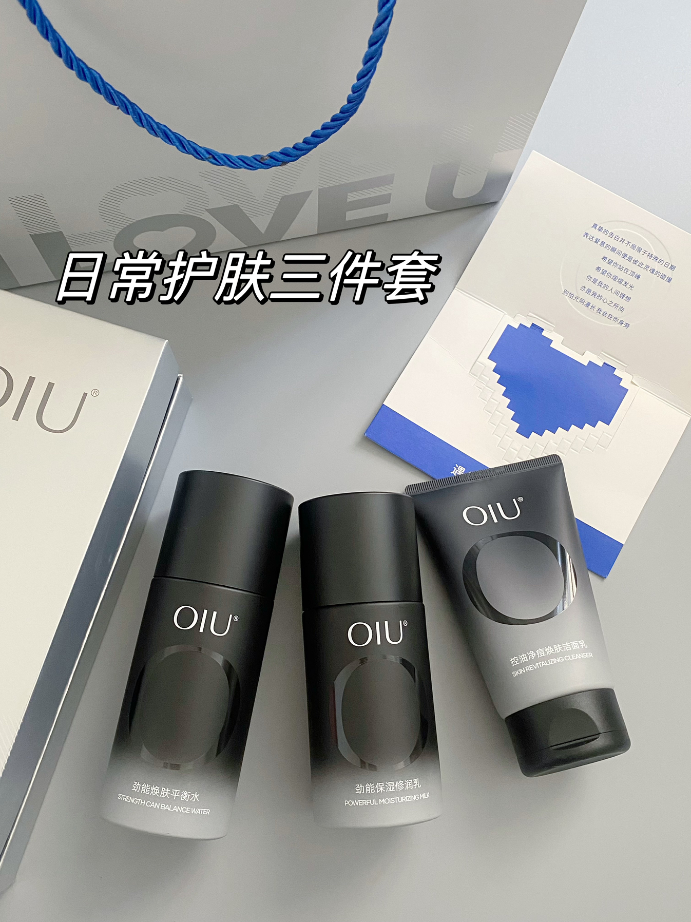 我发现真的很会选礼物欸 这次520就给对象准备了满满一大箱礼物 里面除了夏天会用到的防晒喷雾、他喜欢的公仔、耳机 还有就是这个oiu的护肤礼盒啦 里面是洁面、水、乳三件套 hin适合油痘肌的男朋友 质地都是清爽水润的那种 大油皮用着也不用担心会油腻腻的 而且才100+,银色的礼盒尊嘟很上档次 还有爱心贺卡和香片 打开都是香喷喷的 实用和惊喜并存的礼物 男朋友一定会喜欢呀!