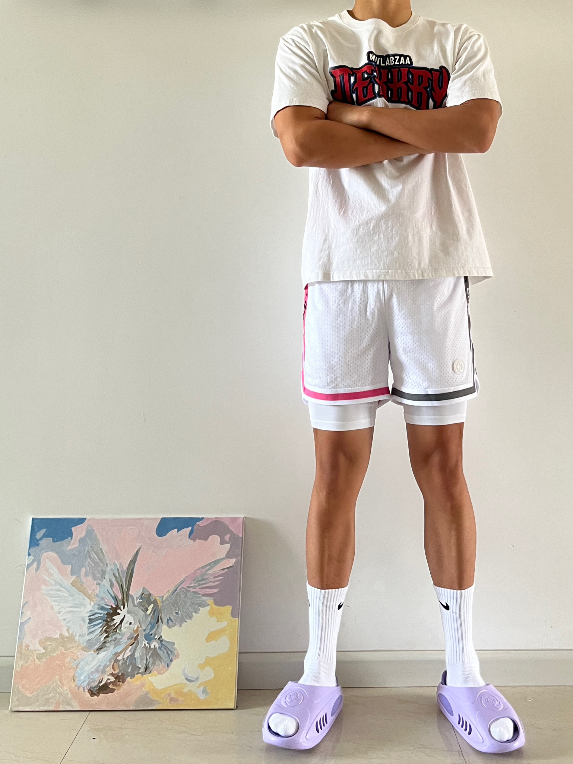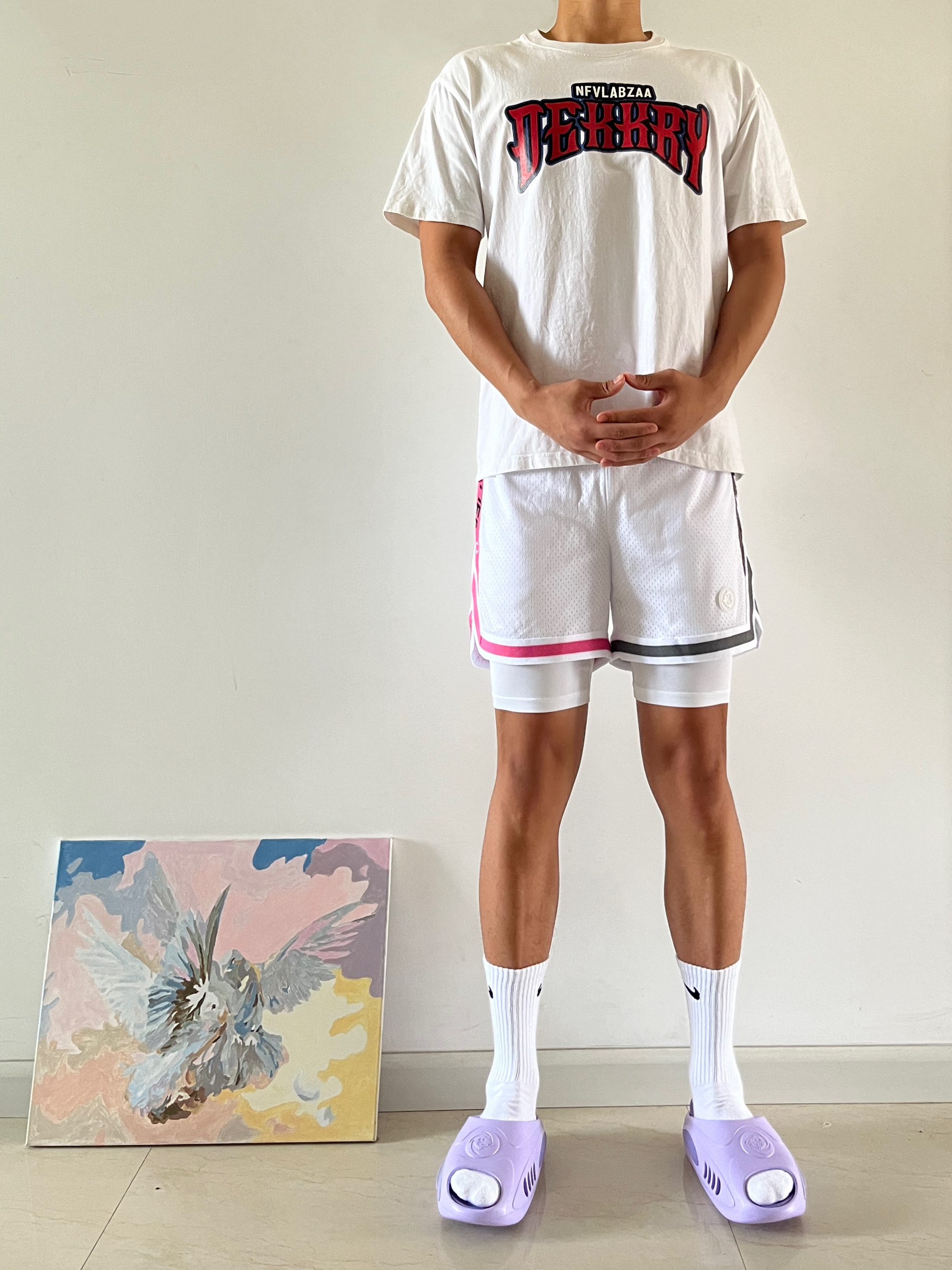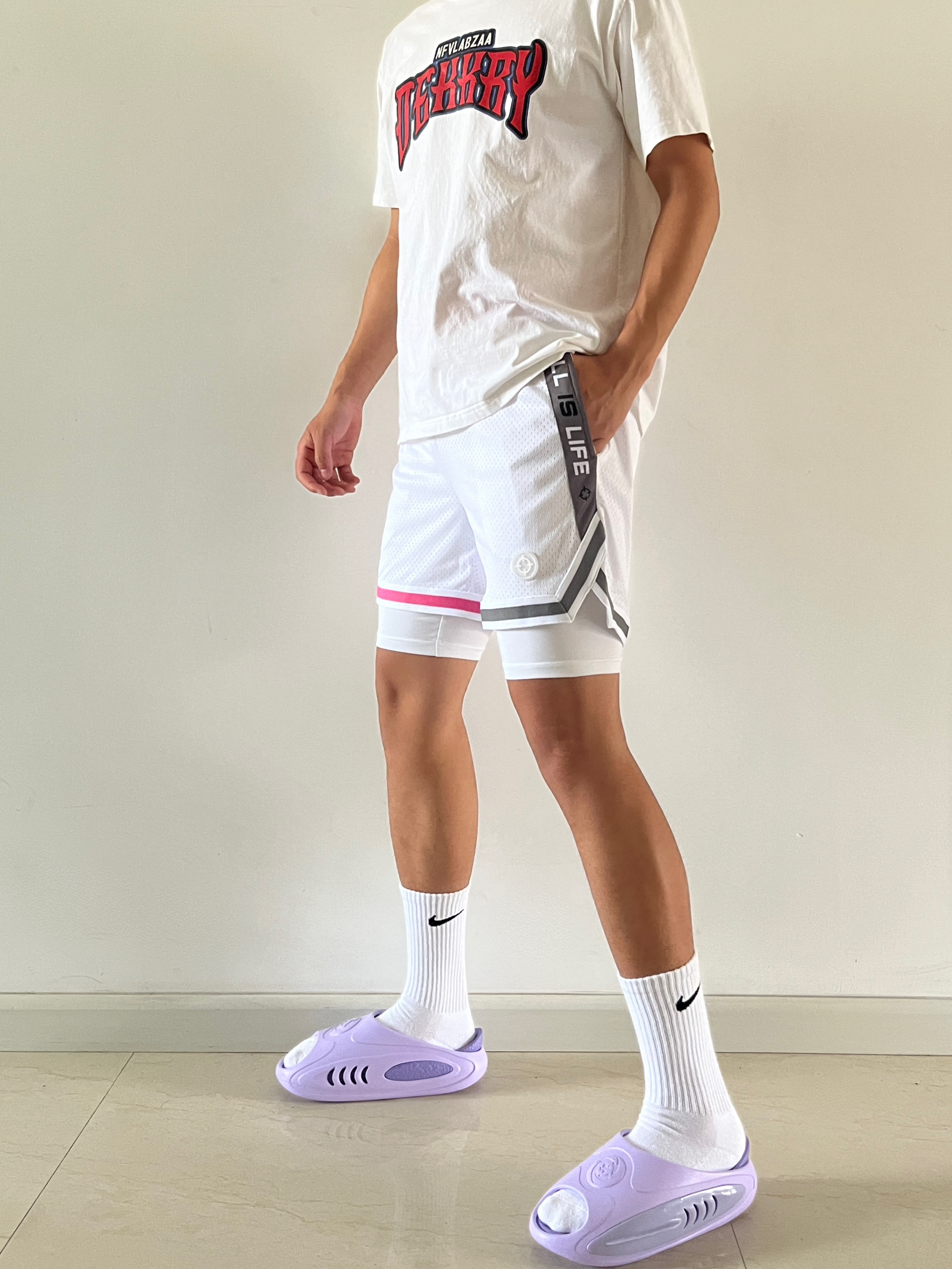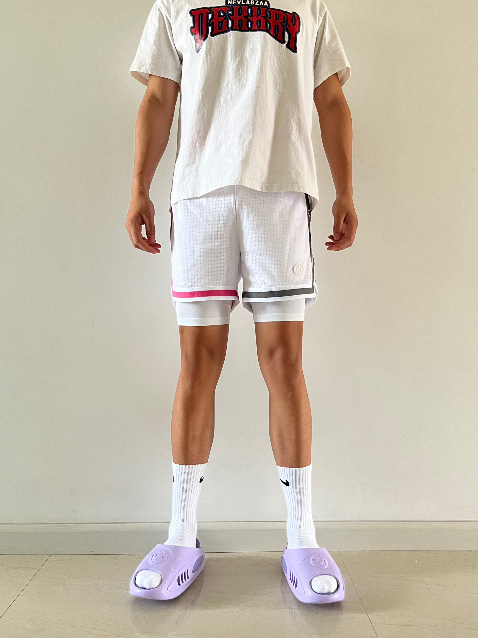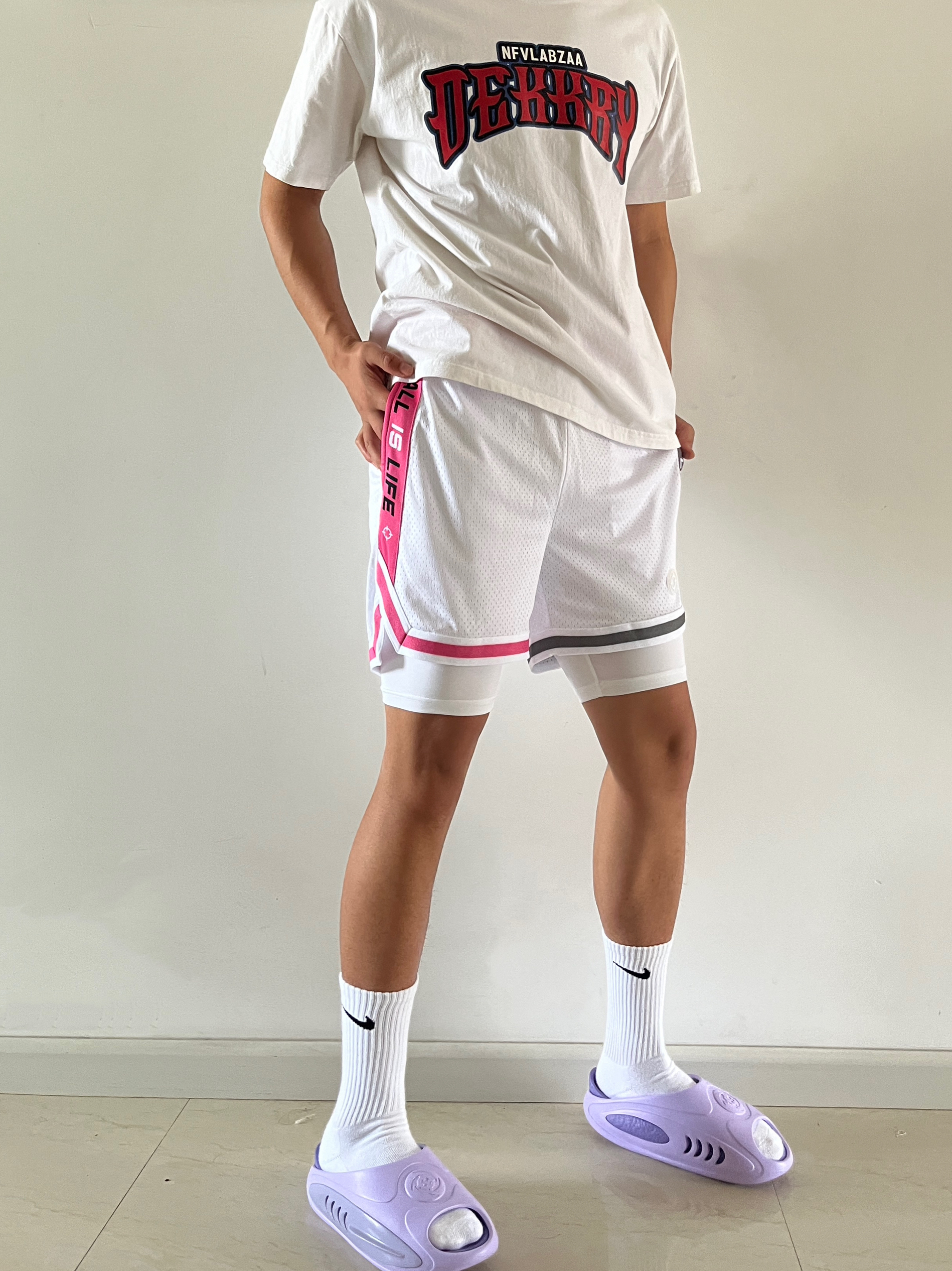 身高|体重:180cm|75kg 🧍♂️ 穿搭风格:美式球员风 👖 下装:准者美式假两件,粉灰鸳鸯配色 👟 鞋子:准者鲨鱼二代紫藤配色