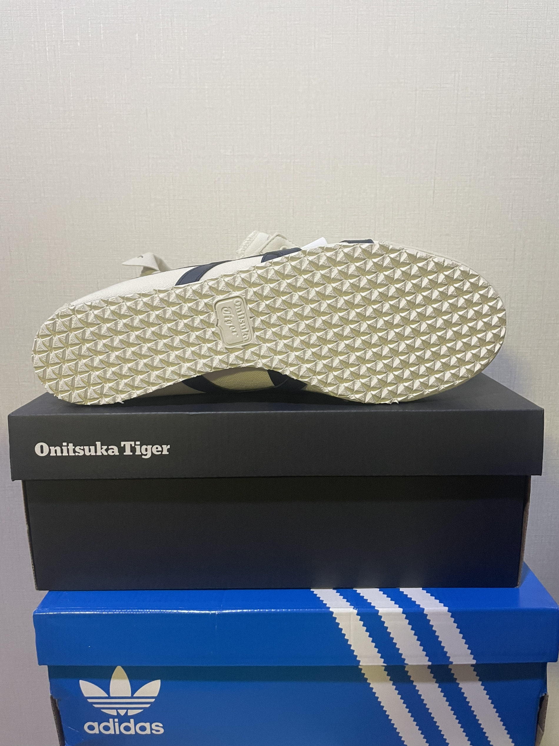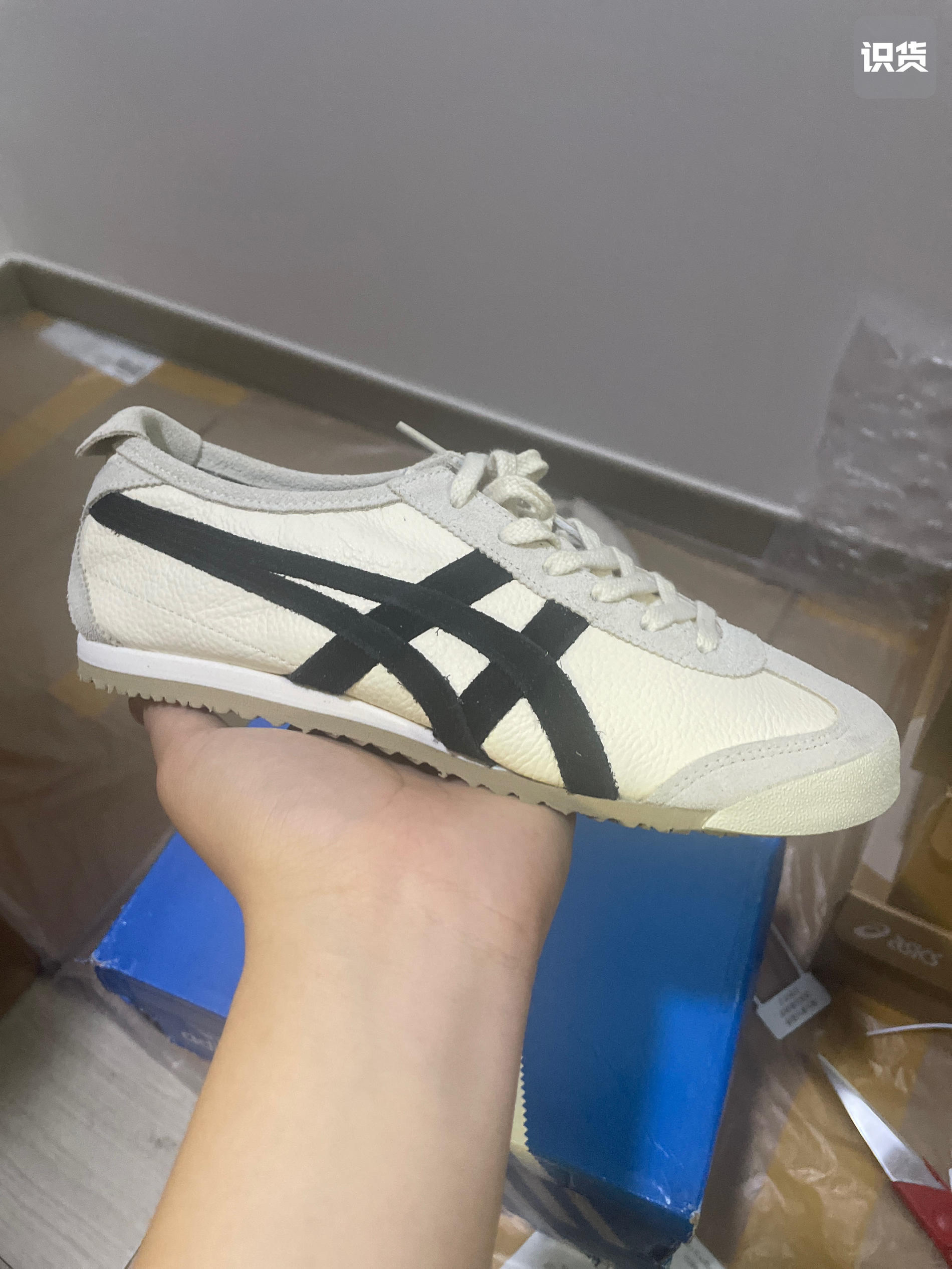 这款是鬼家虎家的经典款价格优惠 该鞋还保留了原始Mexico 66的各种元素 米色的主色调加上深蓝色的细节 给人一种干净清新的感觉 没有传统鞋带 而是采用了一脚蹬 节省了系鞋带的麻烦 非常适合日常的休闲穿搭 鞋面利用皮革 具有良好的透气性 鞋内部采用柔软的鞋垫 不像板鞋很硬 给脚部提供了良好的贴合感和舒适度 无需系鞋带 平时搭配牛仔裤 运动裤都不错 📌是否偏码【偏大/不偏码/偏小】:不偏码 ⛹️性...