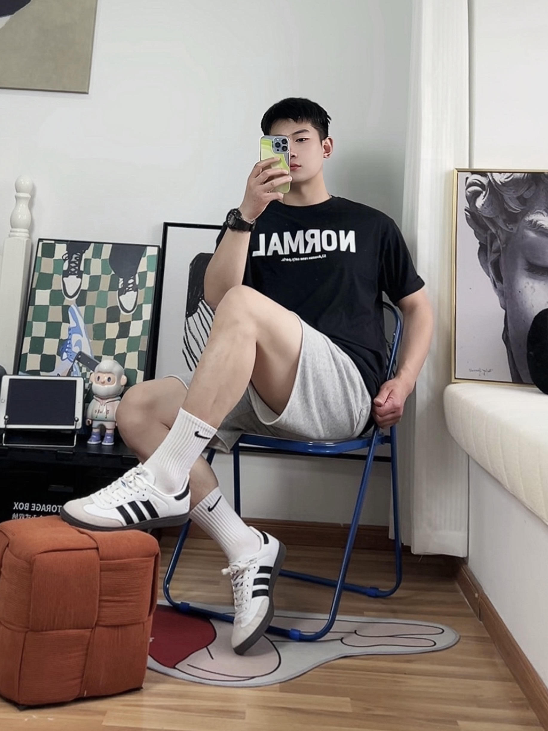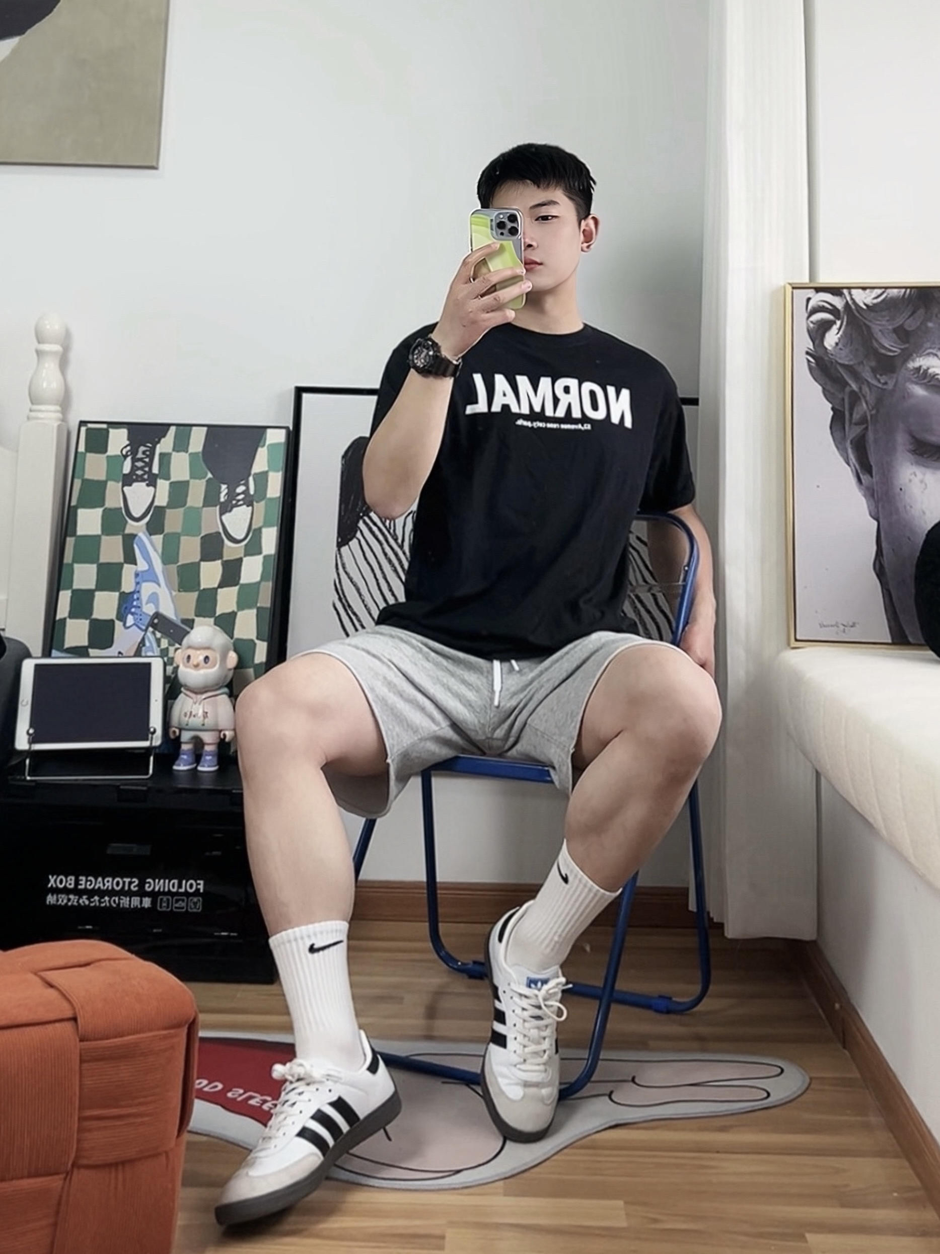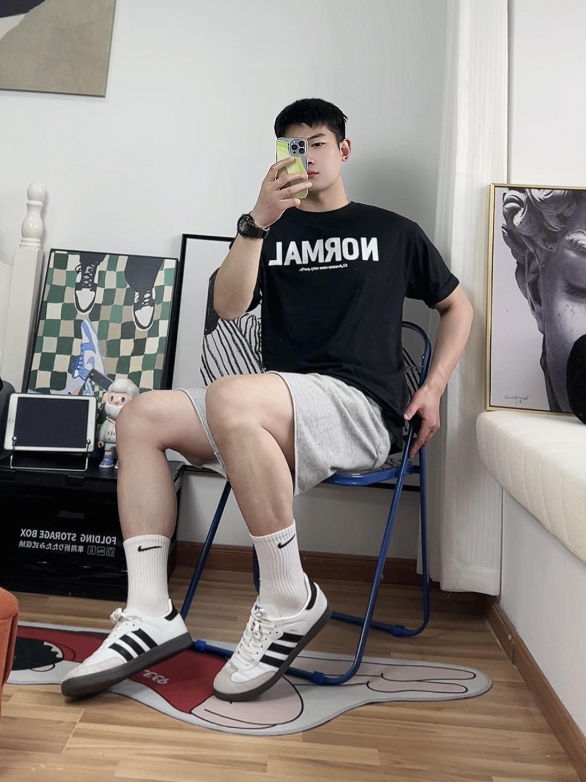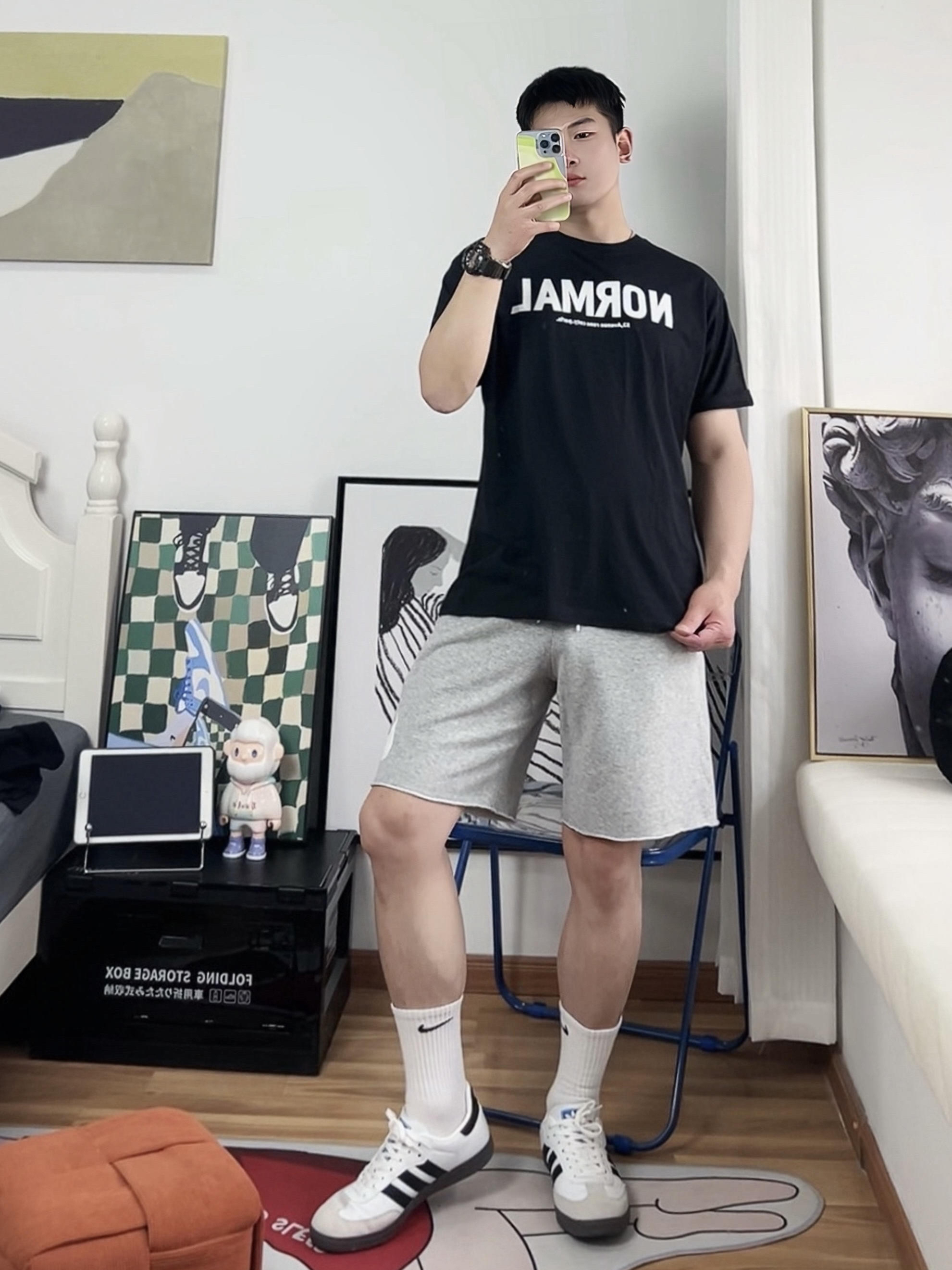 今天这样穿,出街外出也可以很酷😎 ☀️夏天少不了好看的简约穿搭 – 分享今天的穿搭: 👕:美式字母印花短袖,黑色宽松版型配上字母印花元素,简单又时尚。 – 🩳:灰色基础款运动短裤,长度适中,短裤的面料轻盈透气,让你在炎炎夏日中感受到一丝清凉。 – 👟:要说今年国内外博主穿搭最多的鞋子,一定是这款SAMBA了,夏天穿,真是好穿又百搭。 – 快来变帅很简单😜