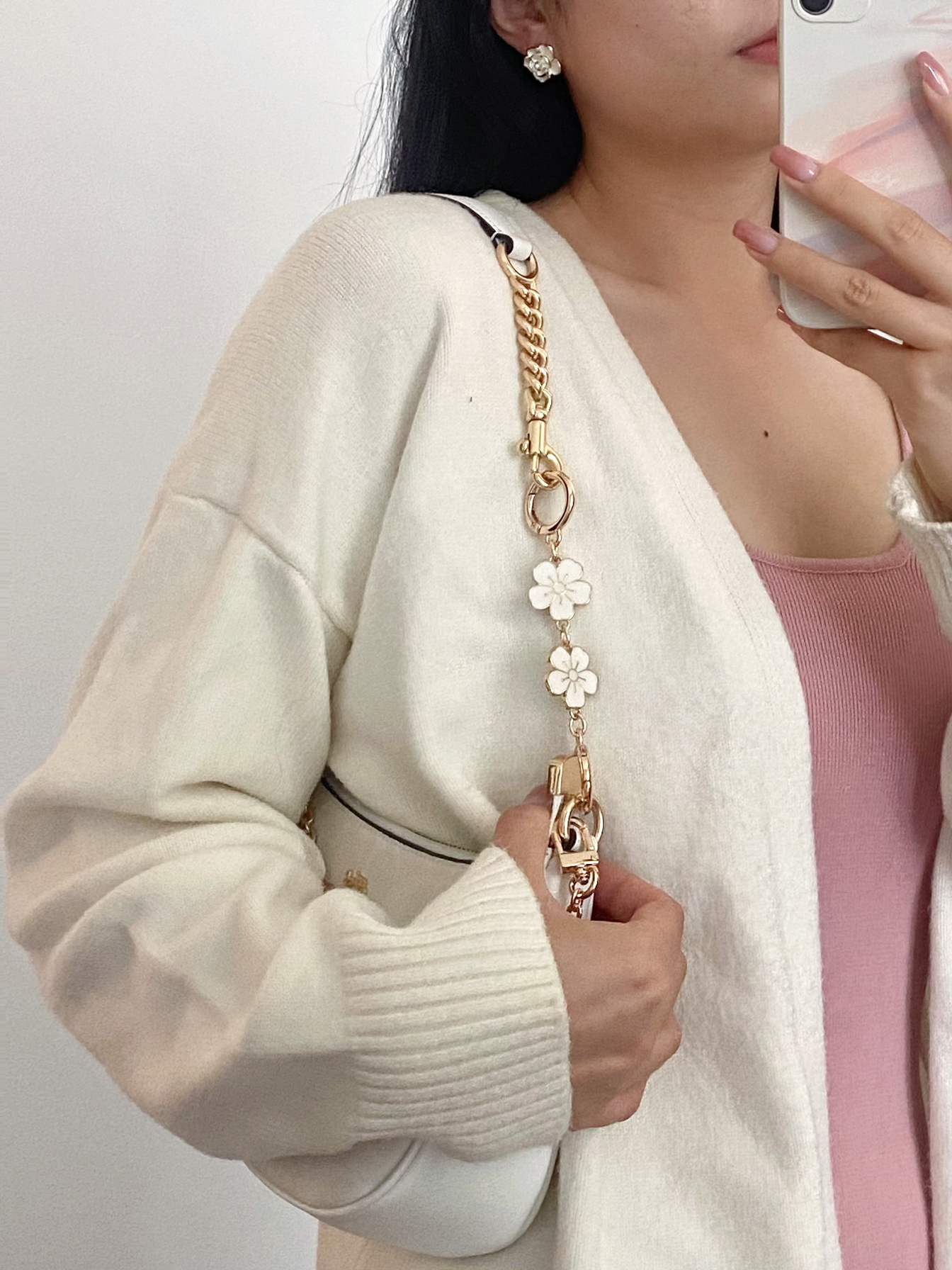 终于等到了我的蔻驰 teri 冰川白真的好百搭 和夏天简直就是绝配 但是原先的肩带就是有点短的 背起来不太舒适 自己也忍不住入了一根延长链 改造后更好看啦 加上延长链后 包包背起来的长度就刚好 显得包包也更精致了 能拒绝加了延长链的蔻驰teri