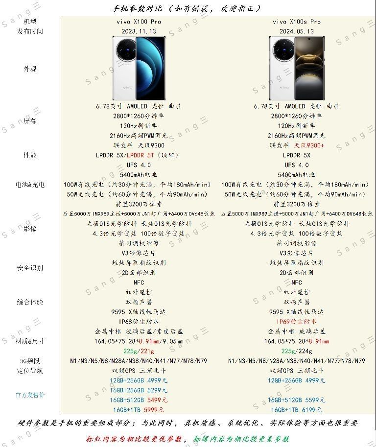 ☞#手机对比# ——X100 Pro→X100s Pro☜ 【#vivo X100s# Pro】相较于【#vivo X100系列# Pro】: 对处理器、防水等级等方面进行了升级; 在内存规格、机身重量等方面发生了退步; 官方发售价有所提高…… 【二者的相同之处】 屏幕尺寸及材质、柔性曲屏、分辨率及刷新率、高频PWM调光、储存规格、电池容量、有线充电及无线充电、前置相机、后置主摄及超广角及...