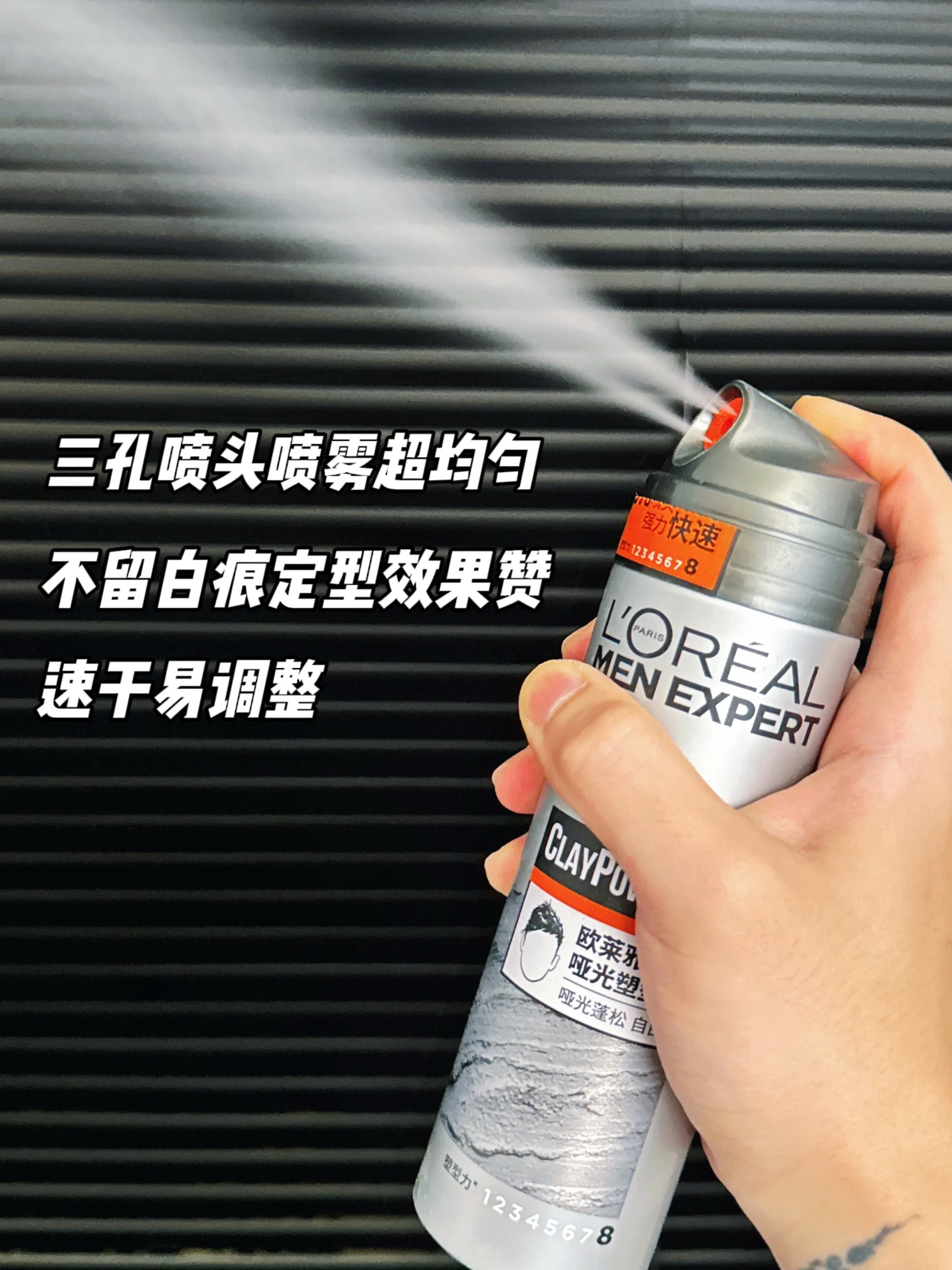 🔴造型完成后,再用定型喷雾定型,三孔喷头的设计让喷雾更均匀,即便我戴耳机遇到大风,发型也吹不乱,依然让你帅气一整天!