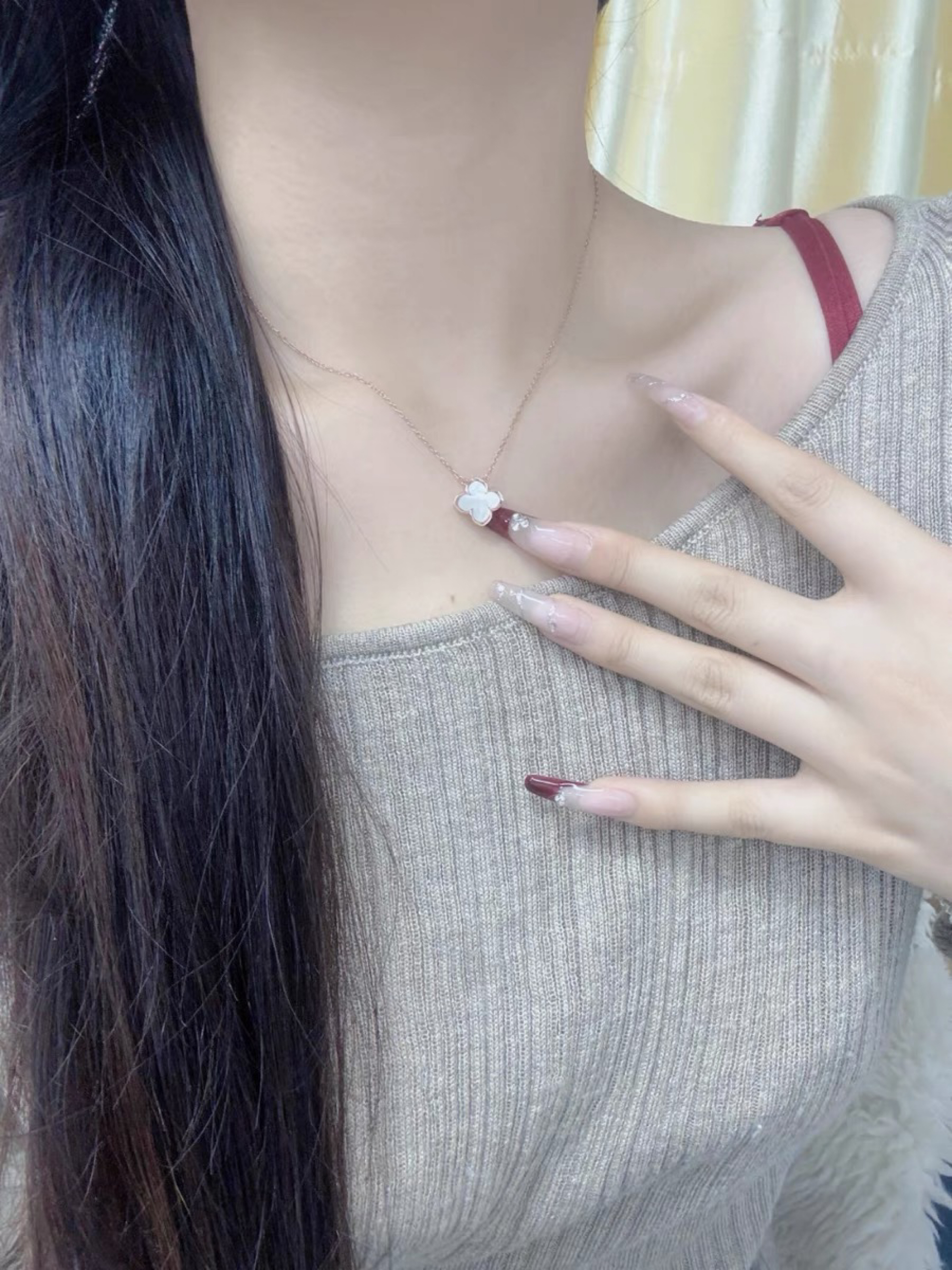 男友送的这款四叶草项链简直送到了我的心巴上哈哈~独特的四叶草设计,金色的镶边,大气华丽。而且四叶草本身的寓意非常好,我个人也很喜欢,可以带来好运和幸福。这款项链超级显白,任何服装都可以搭配,气质非常好,做工也很精致小巧,很有质感。 (图片来自网络,侵删)