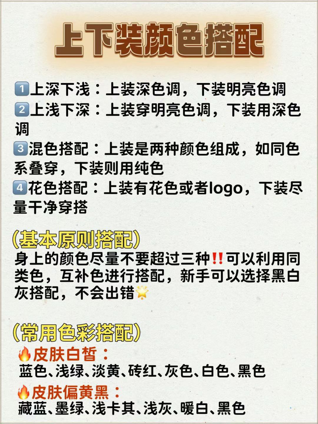 学会这几个穿搭公式 轻松提高你的衣品 颜色搭配:新手选择黑白灰不会出错,除此外可以选择同近色,邻近色或者互补色,全身的颜色尽量不要超过三种,否则会显得很杂乱哟 根据风格选穿搭:选择适合自己风格穿搭!! 根据身材选穿搭:根据自己的身材选择合适的衣服可以从视觉上掩盖自己的身材缺点哟~